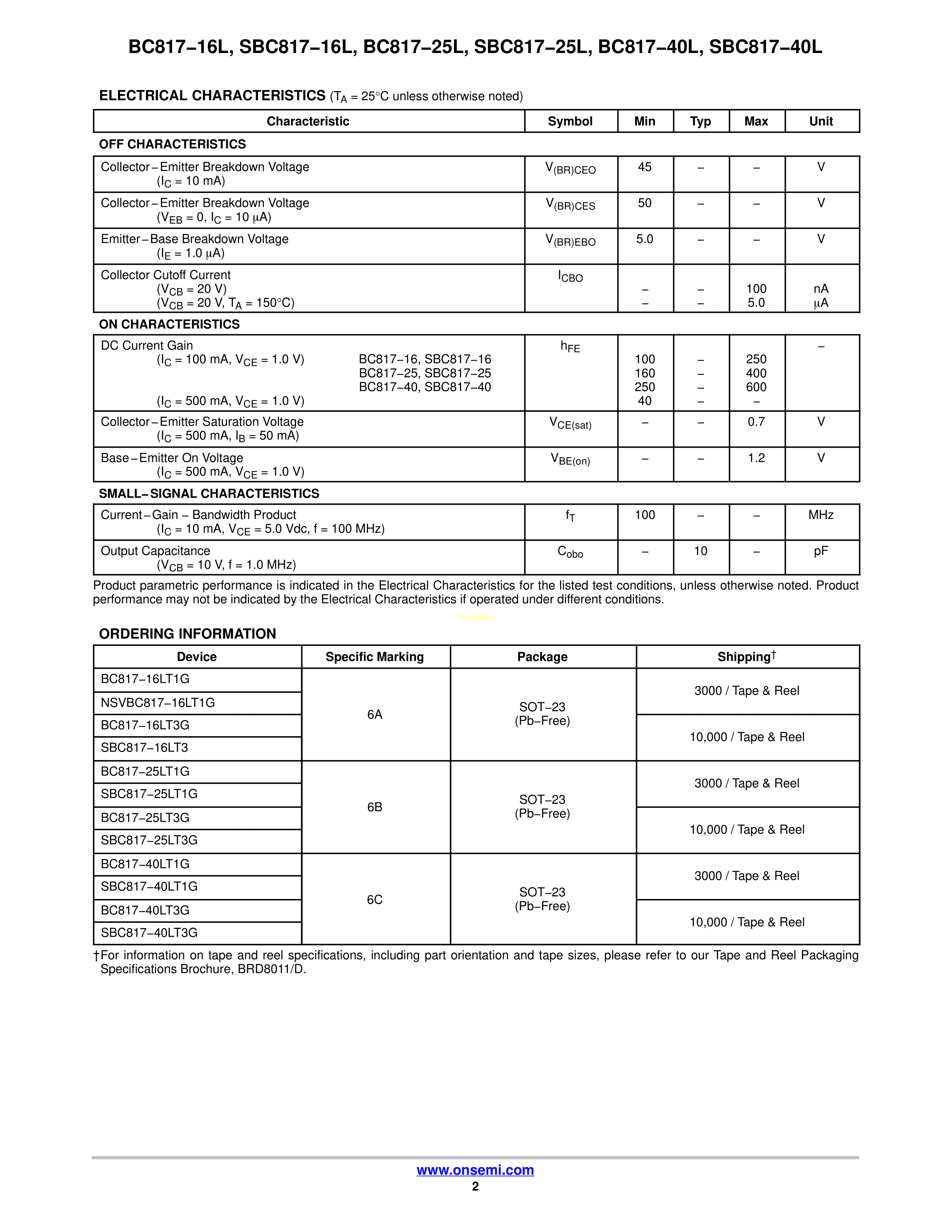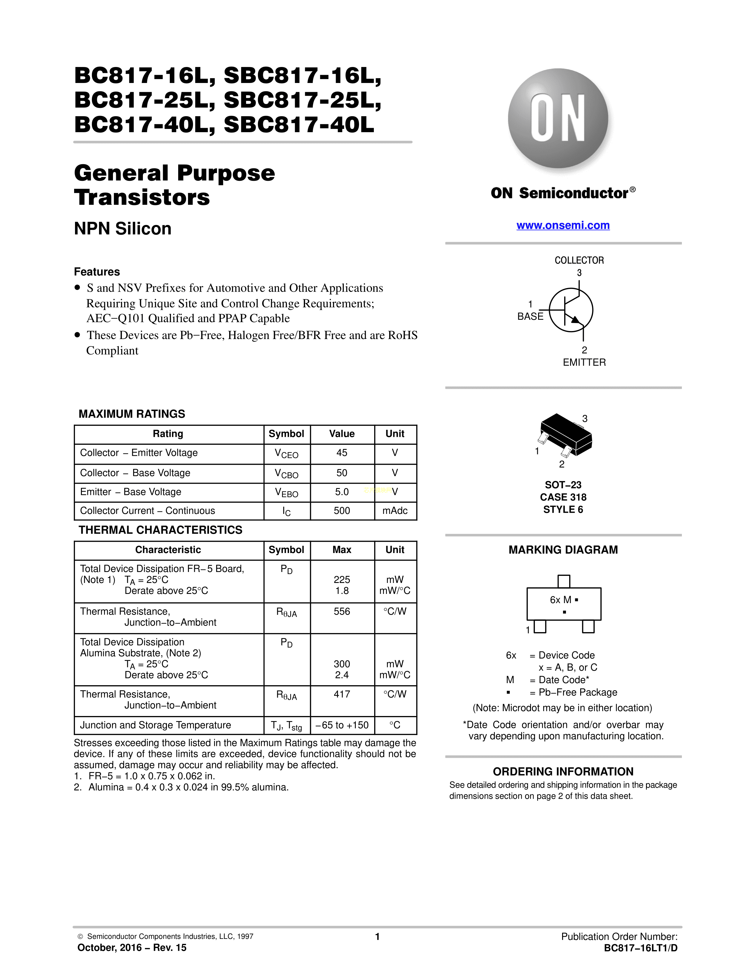 BC817-25LT3G数据手册SOT-23(SOT-23-3)封装onsemi(安森美)PDF规格