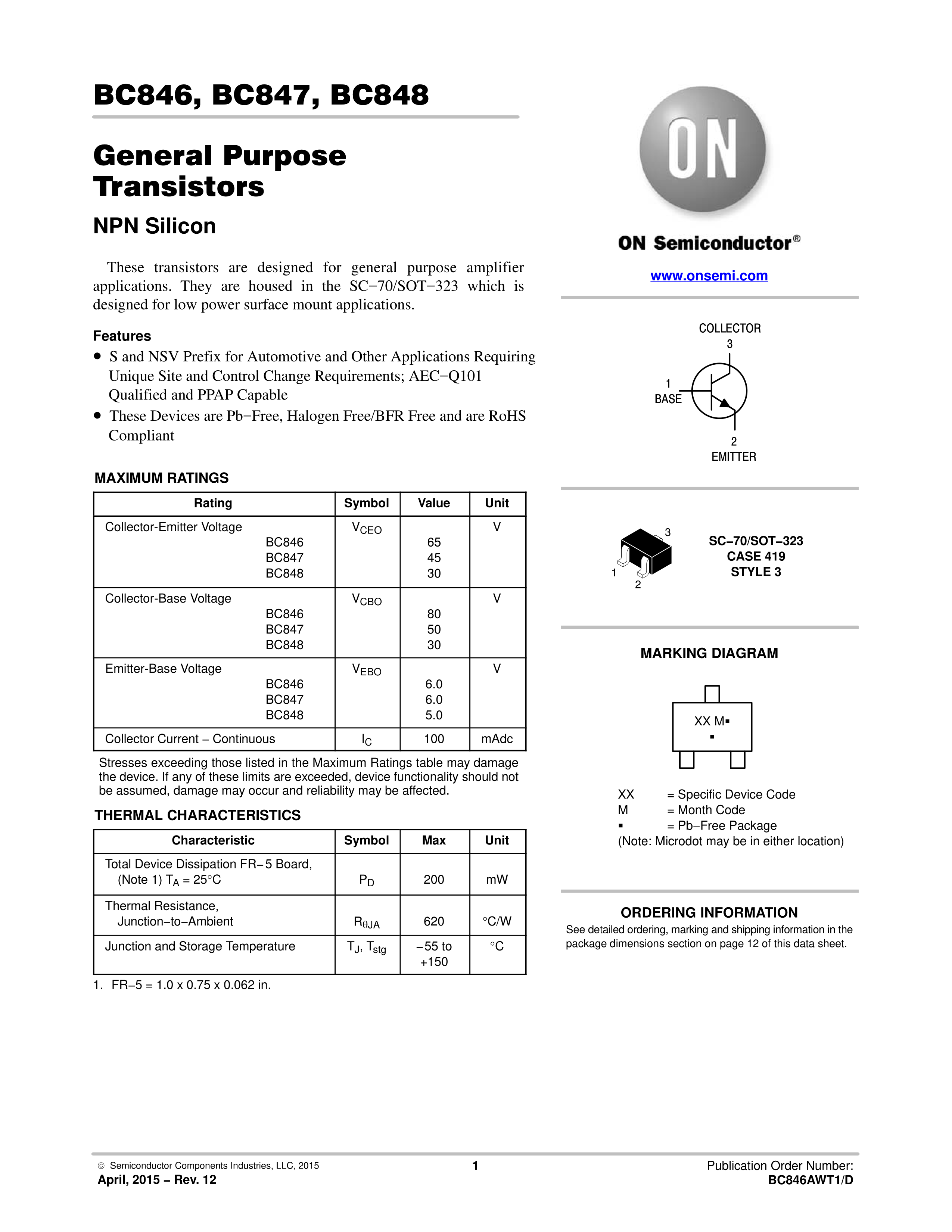 BC846BWT1G数据手册SOT-323(SC-70)封装onsemi(安森美)PDF规格书,中英