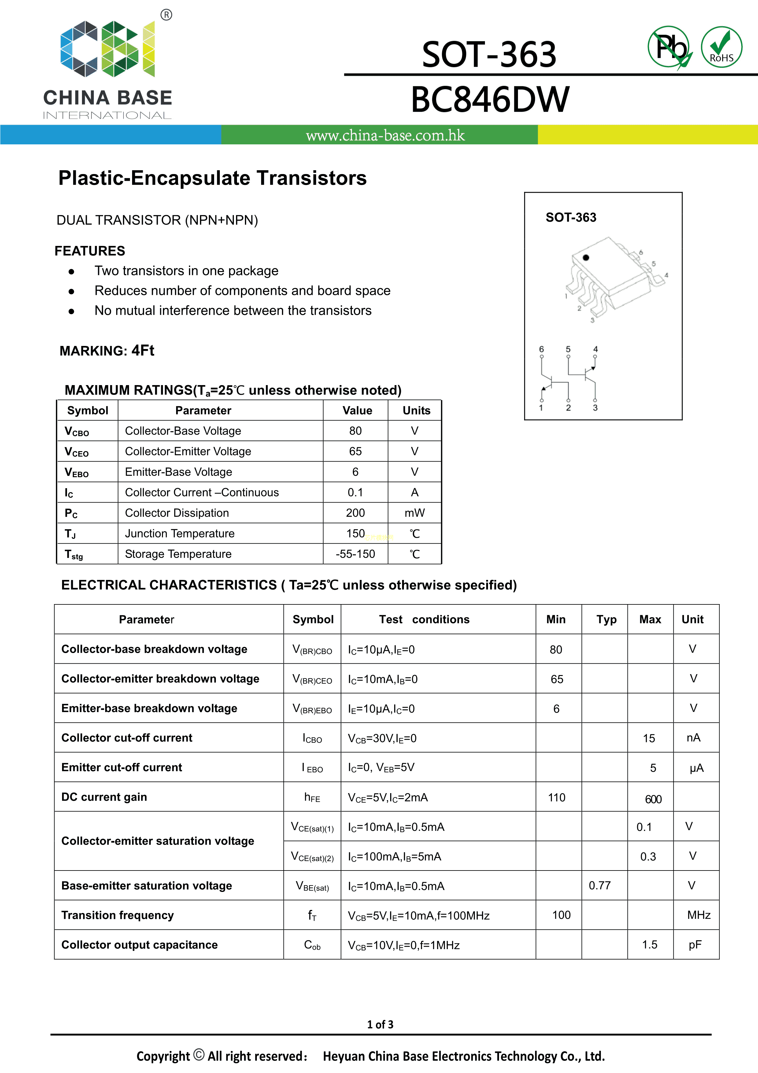 BC846DW4Ft数据手册SOT-363封装CBI(创基)PDF规格书,中英文下载