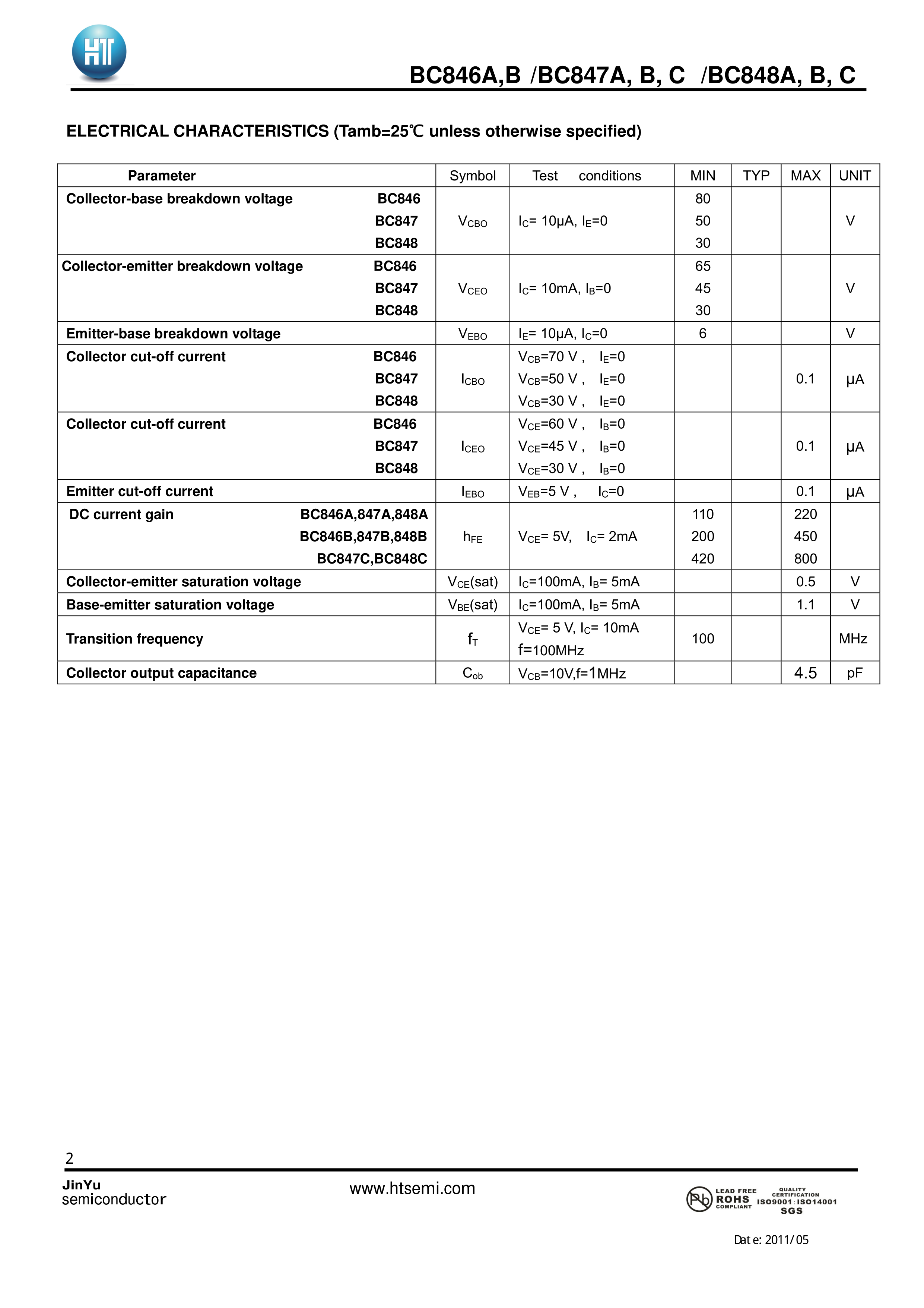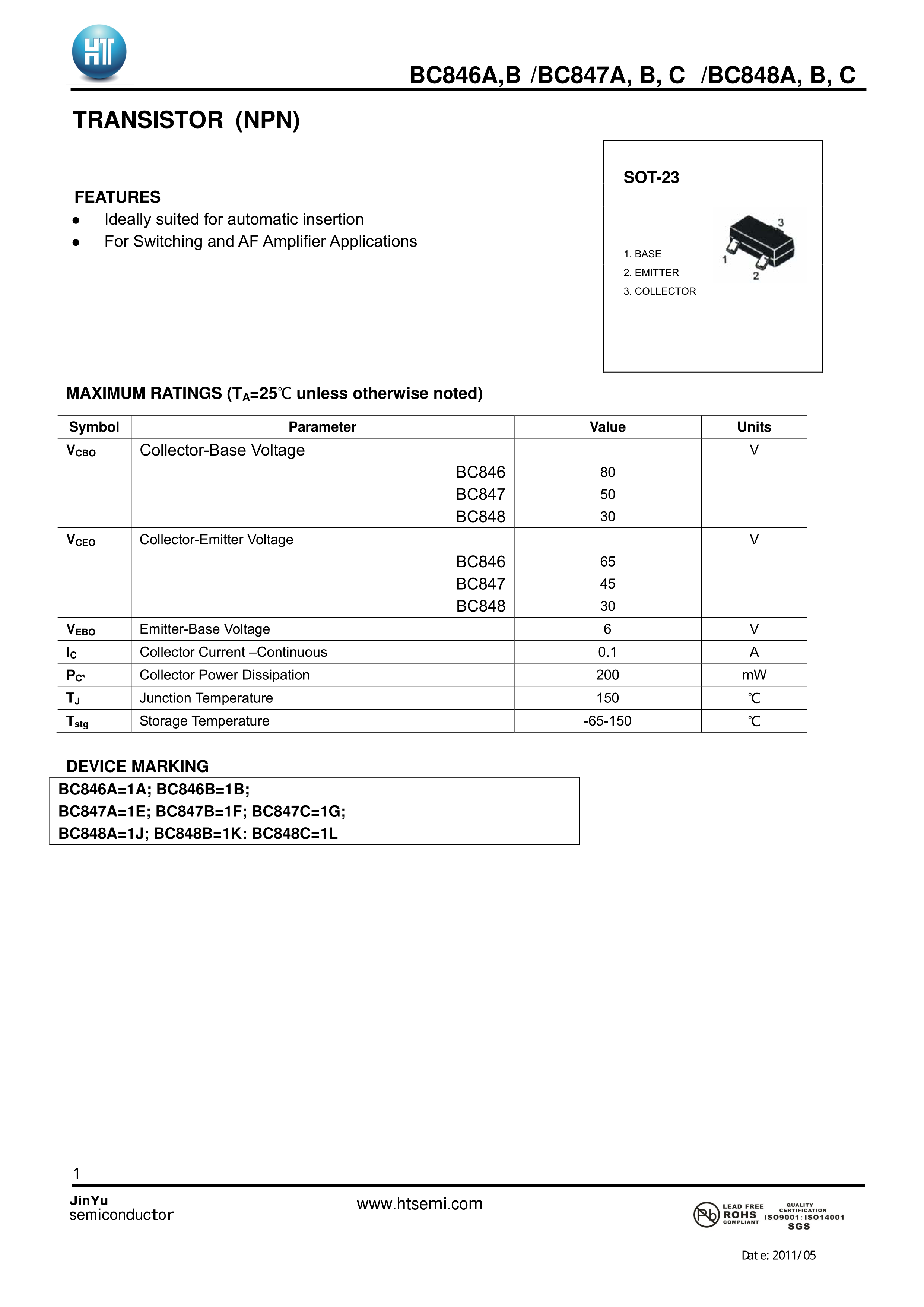 BC847C数据手册SOT-23封装HT(金誉)PDF规格书,中英文下载