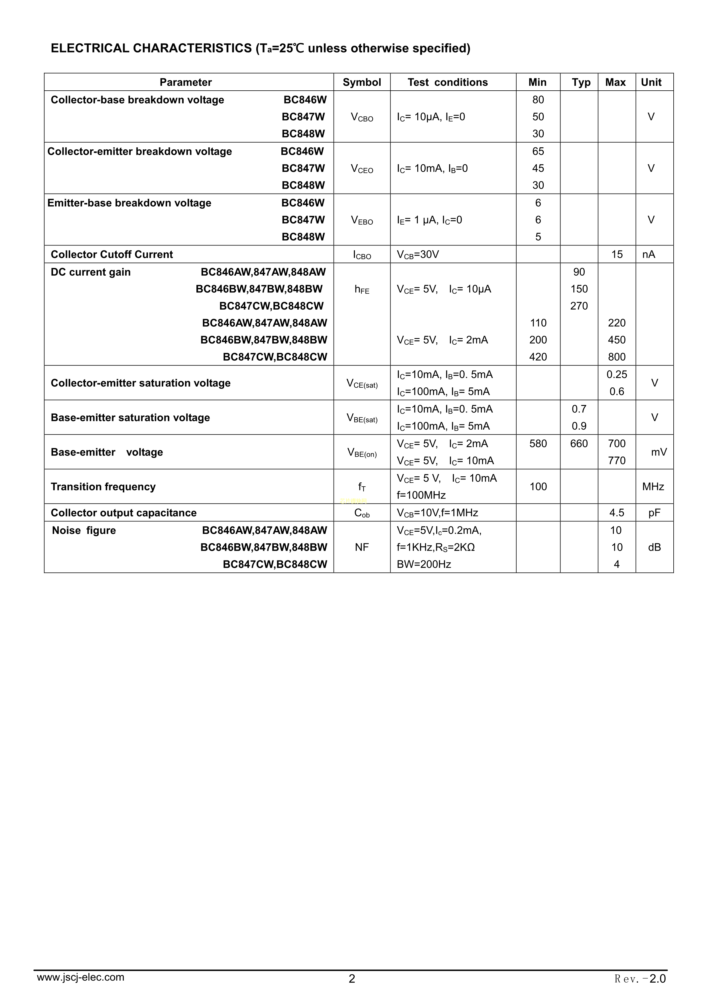 BC848W数据手册SOT-323封装CJ(江苏长电-长晶)PDF规格书,中英文下载
