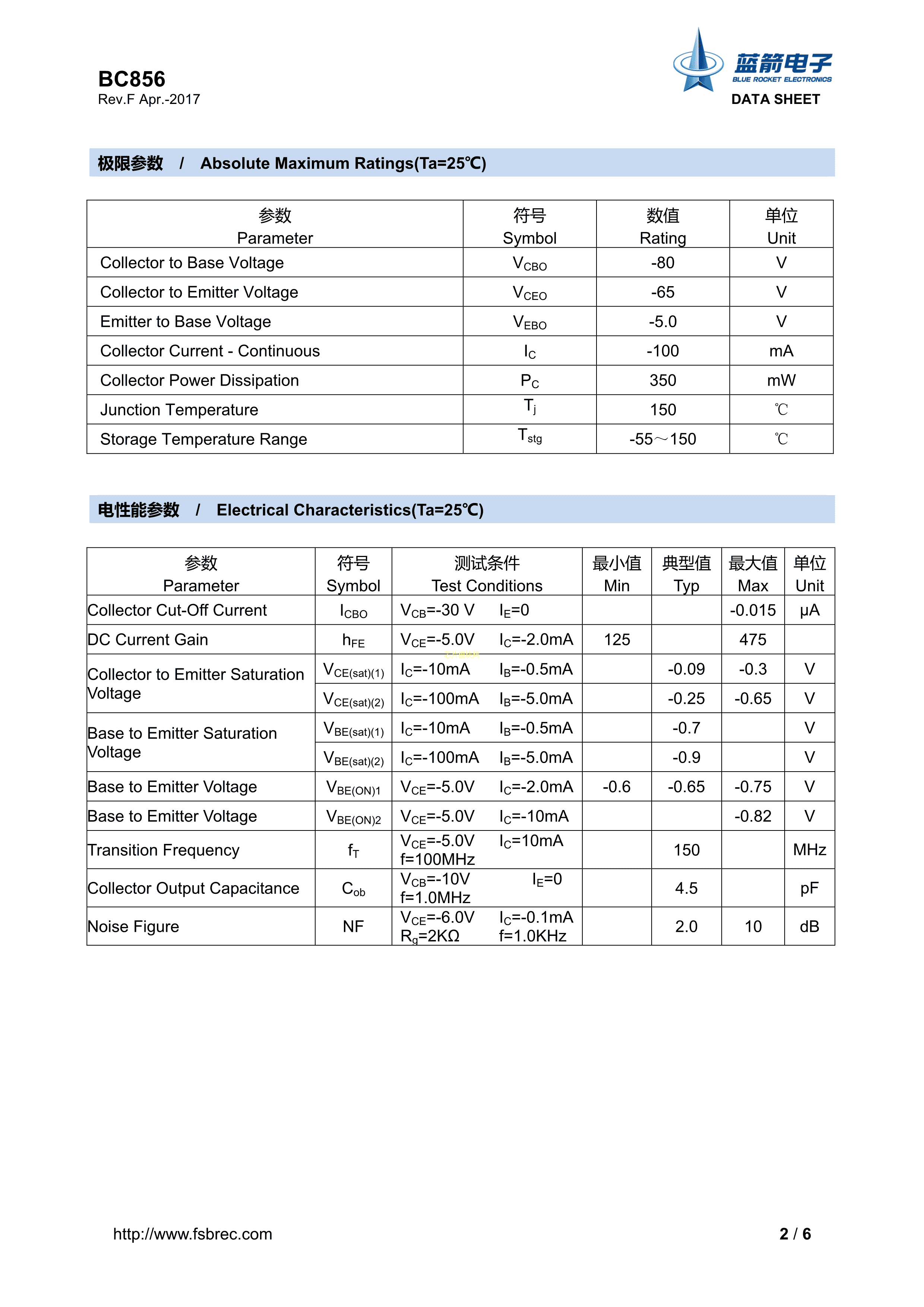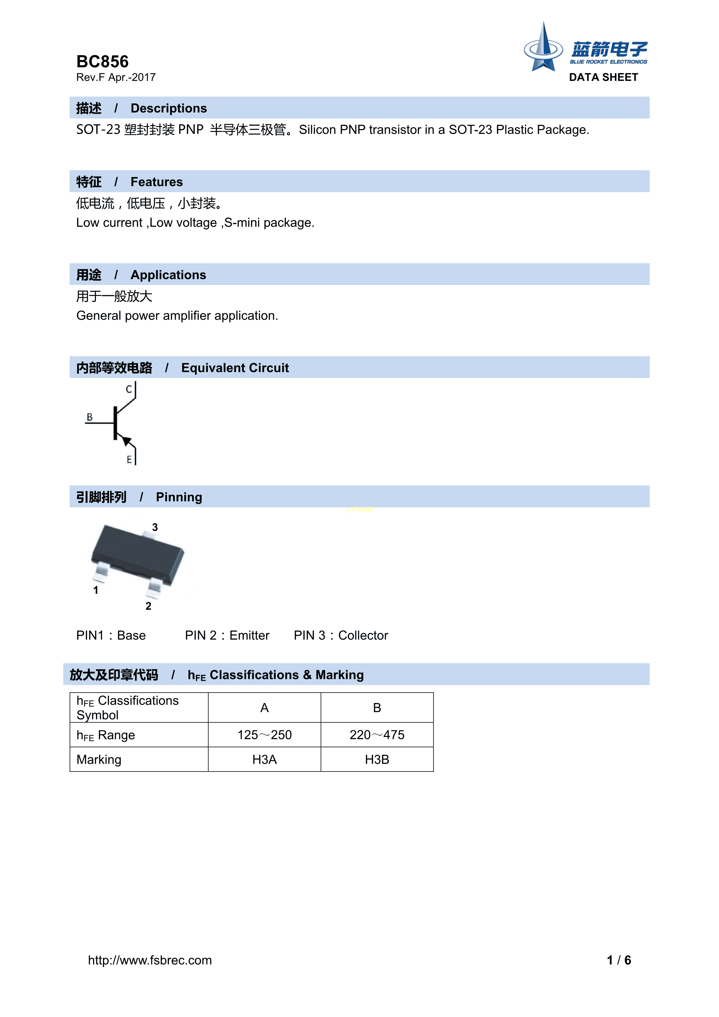 BC856-B数据手册SOT-23封装BLUE ROCKET(蓝箭)PDF规格书,中英文下载