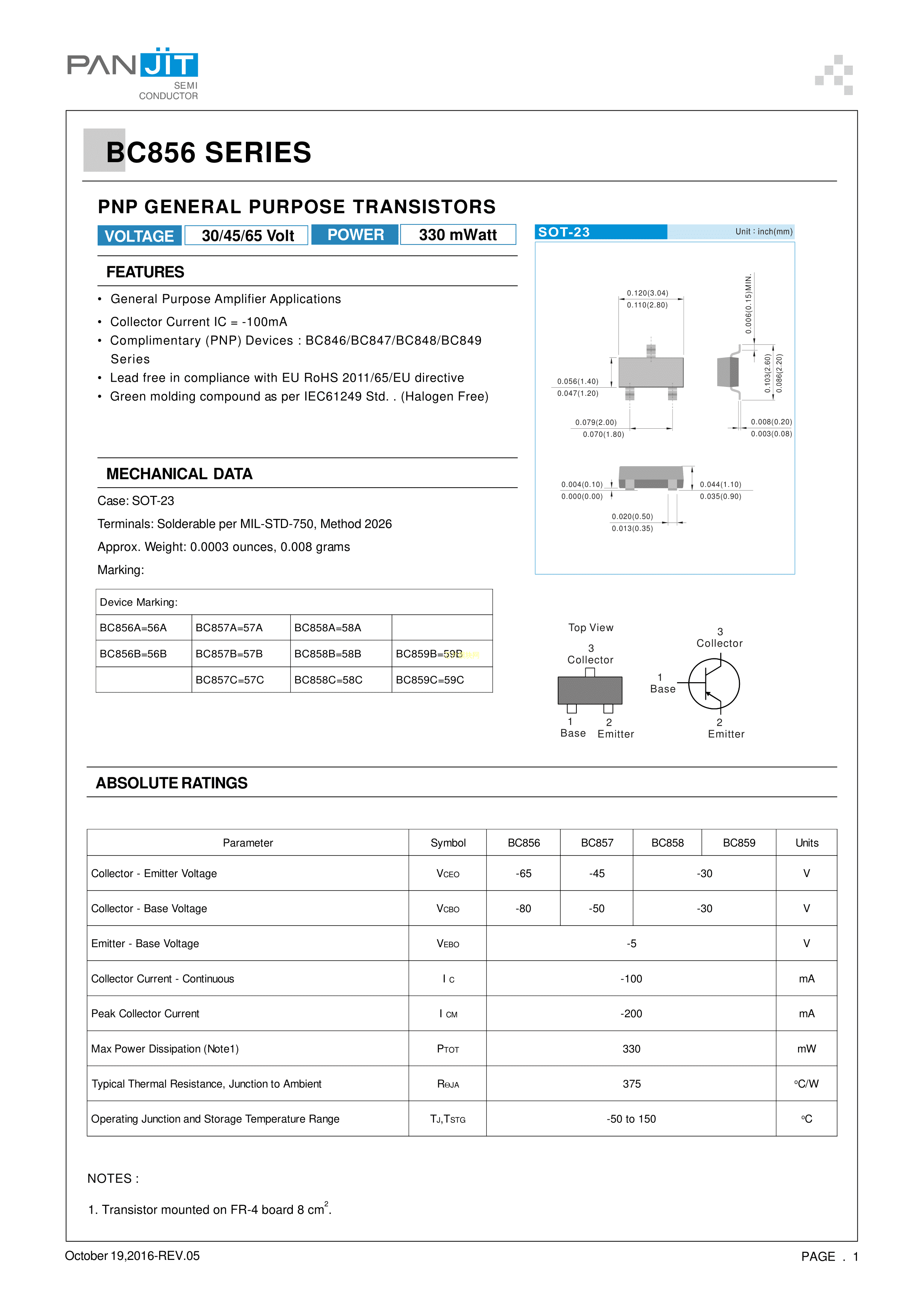 BC856B_R1_00001数据手册SOT-23封装PANJIT(强茂)PDF规格书,中英文下载