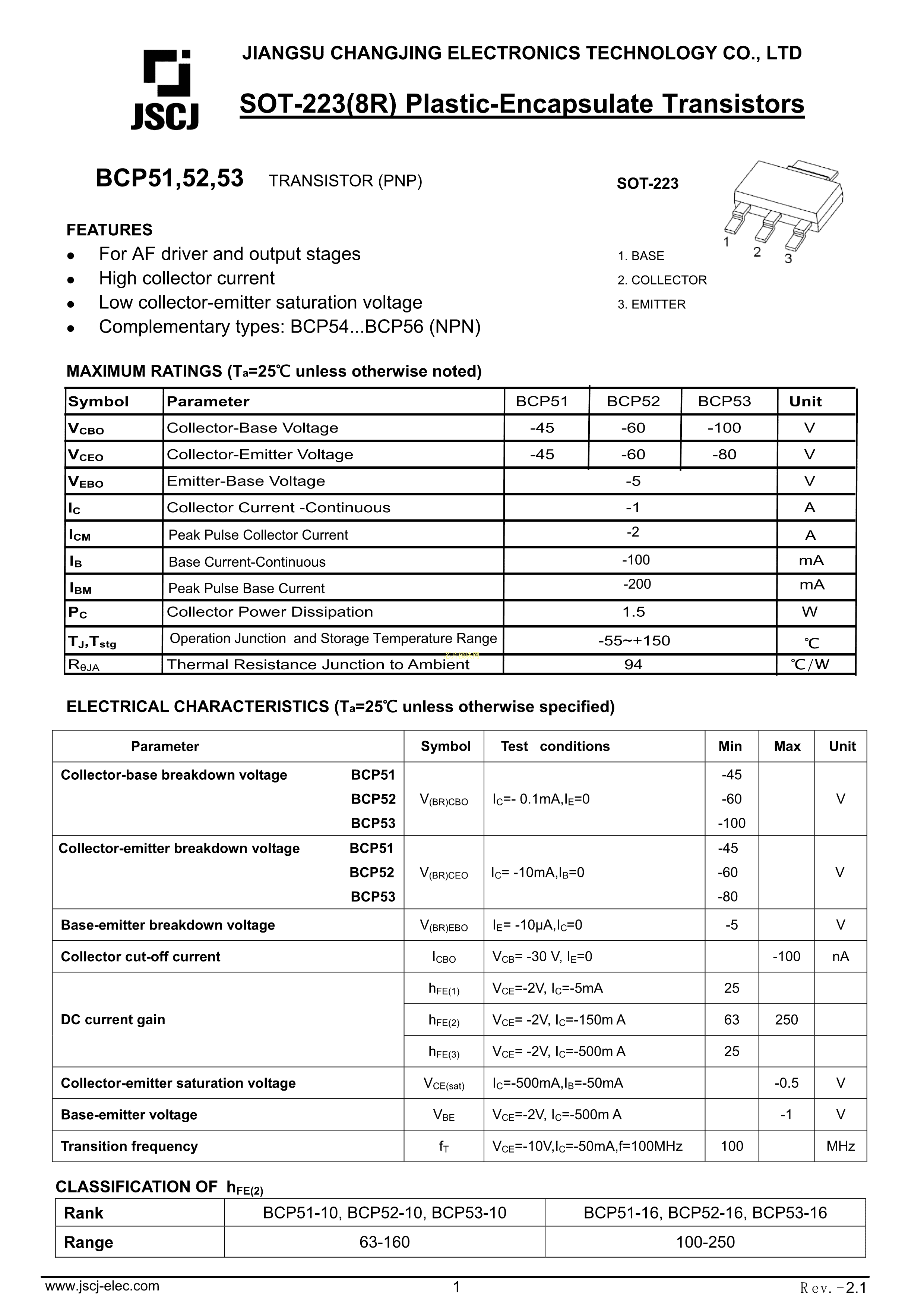 BCP52数据手册SOT-223封装CJ(江苏长电-长晶)PDF规格书,中英文下载