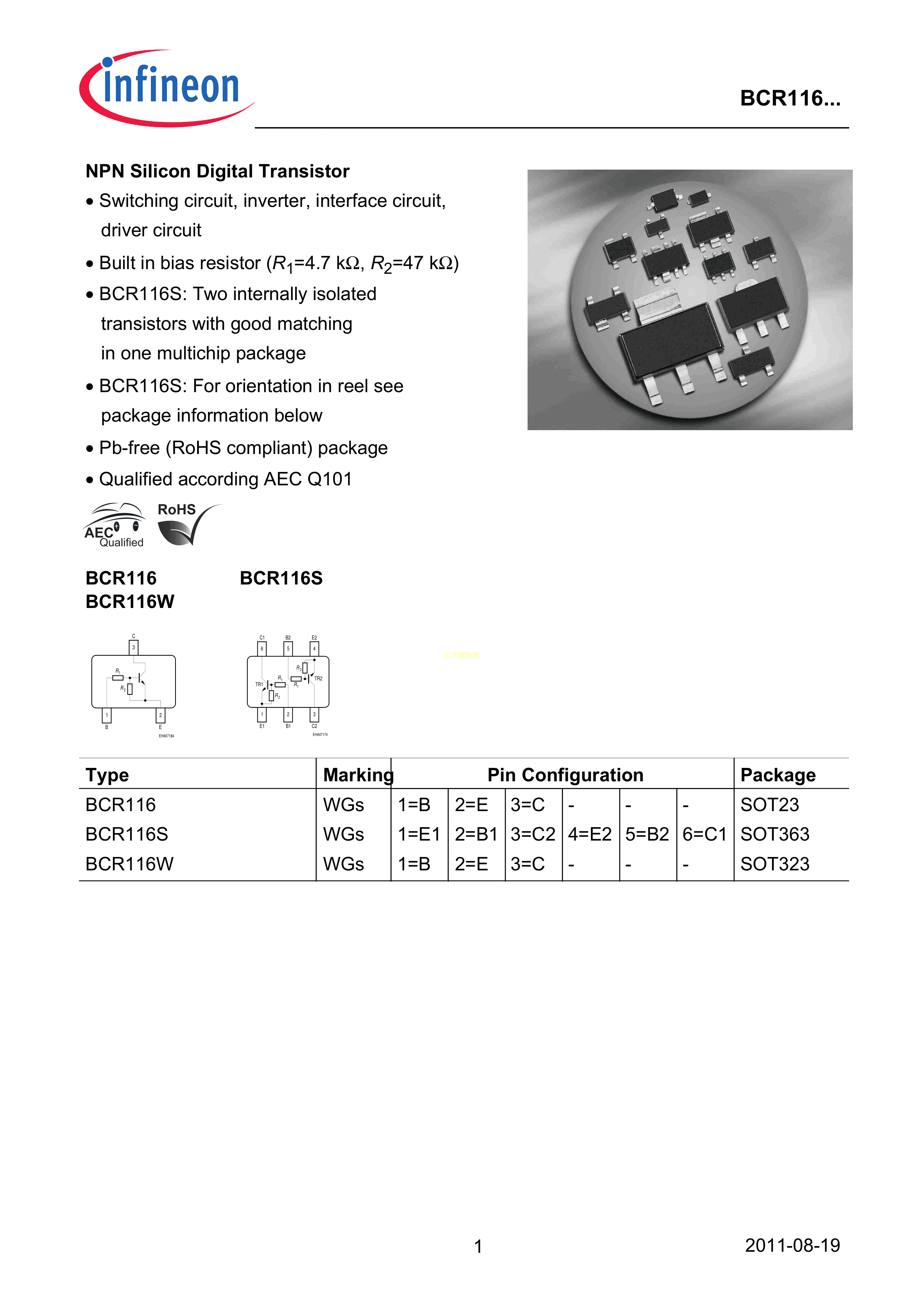 BCR116SH6327数据手册SOT-363-6封装Infineon(英飞凌)PDF规格书,中英文