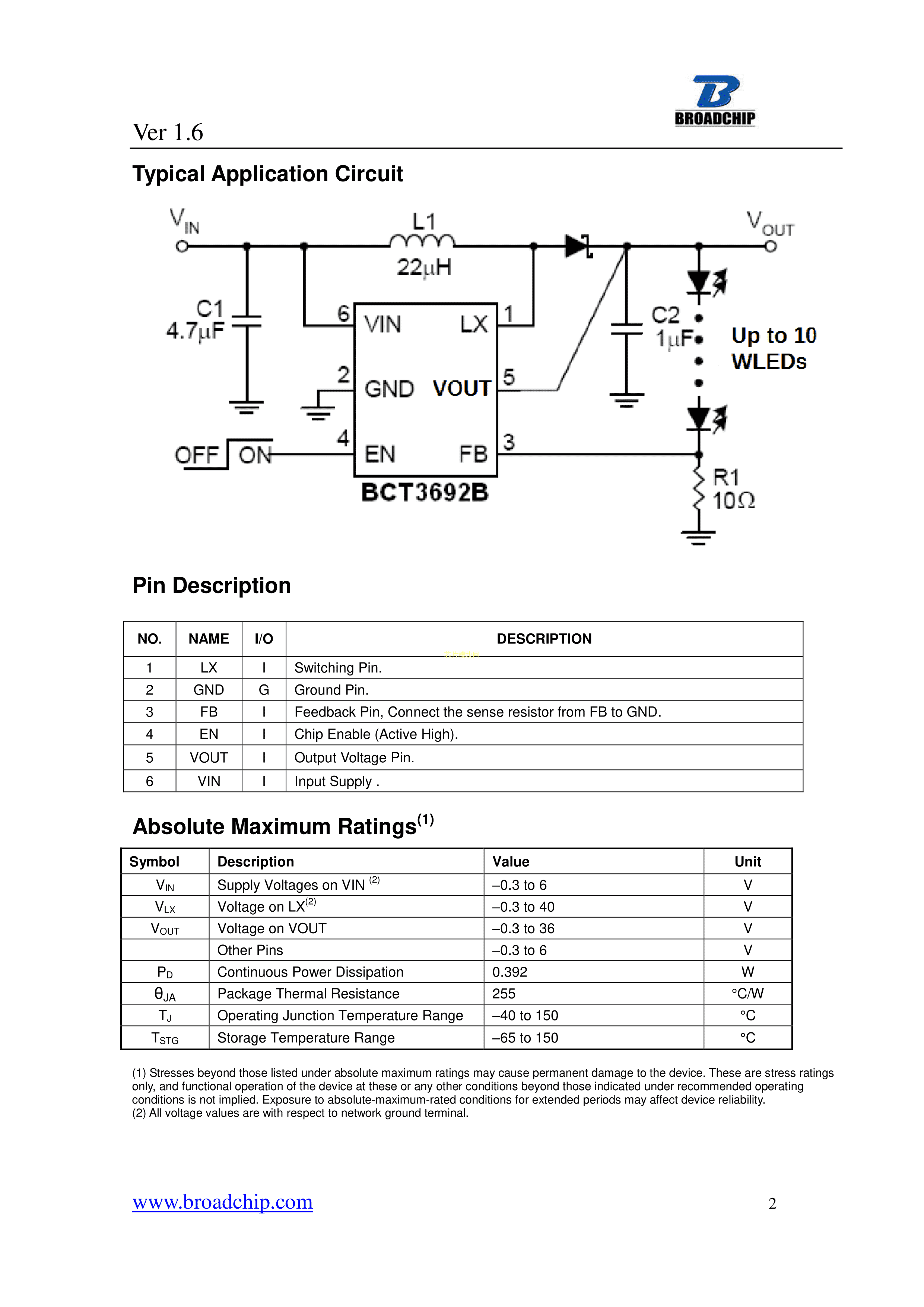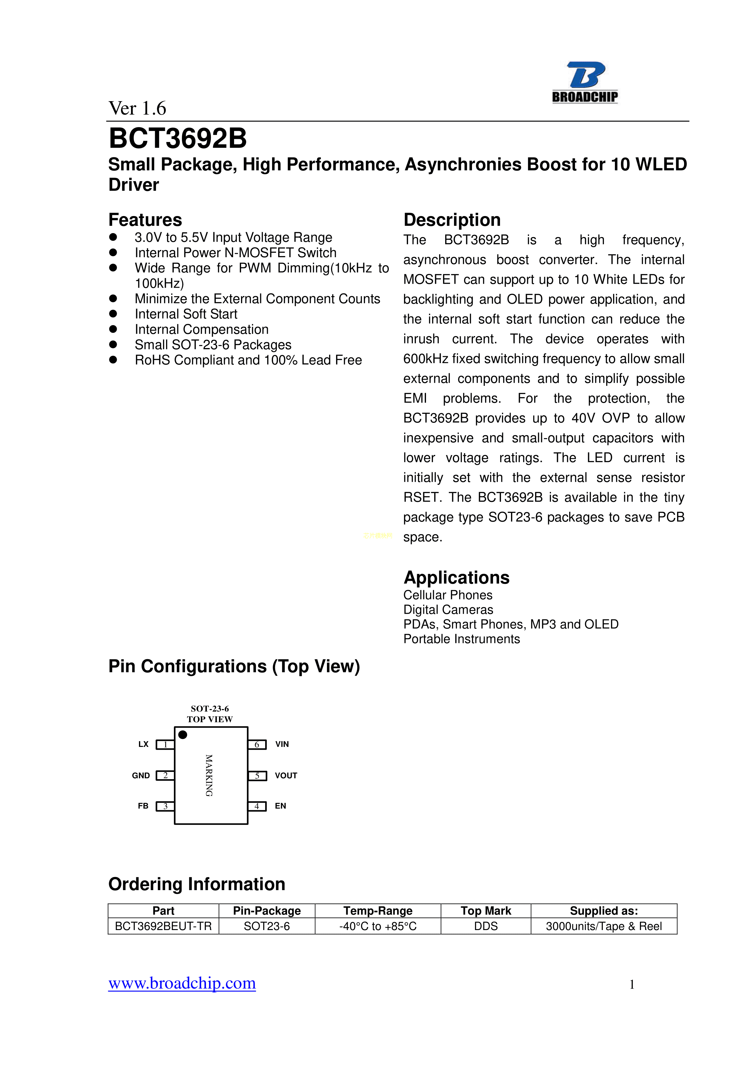BCT3692BEUT-TR数据手册SOT-23-6封装BROADCHIP(广芯电子)PDF规格书,中英文下载