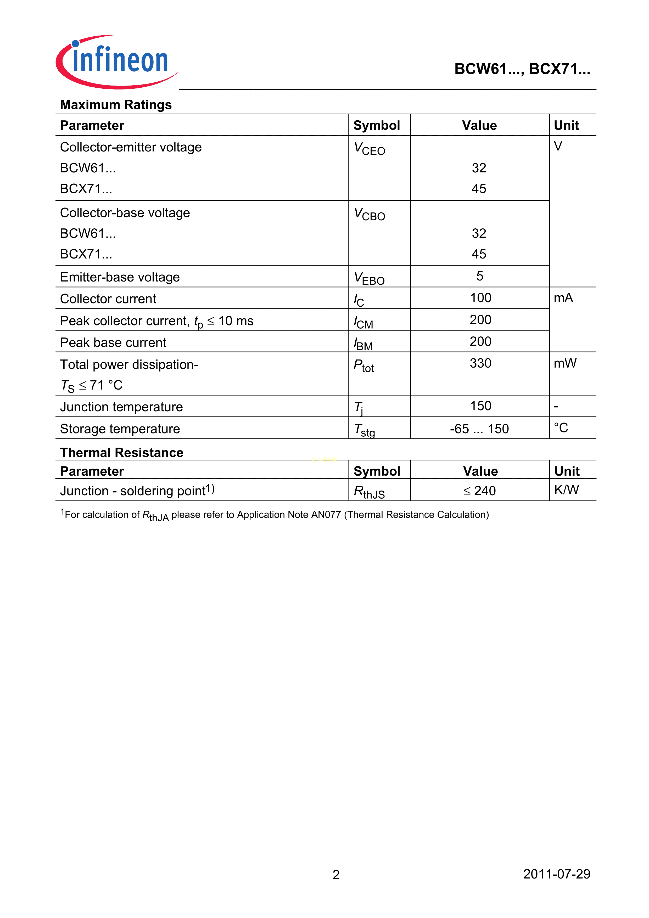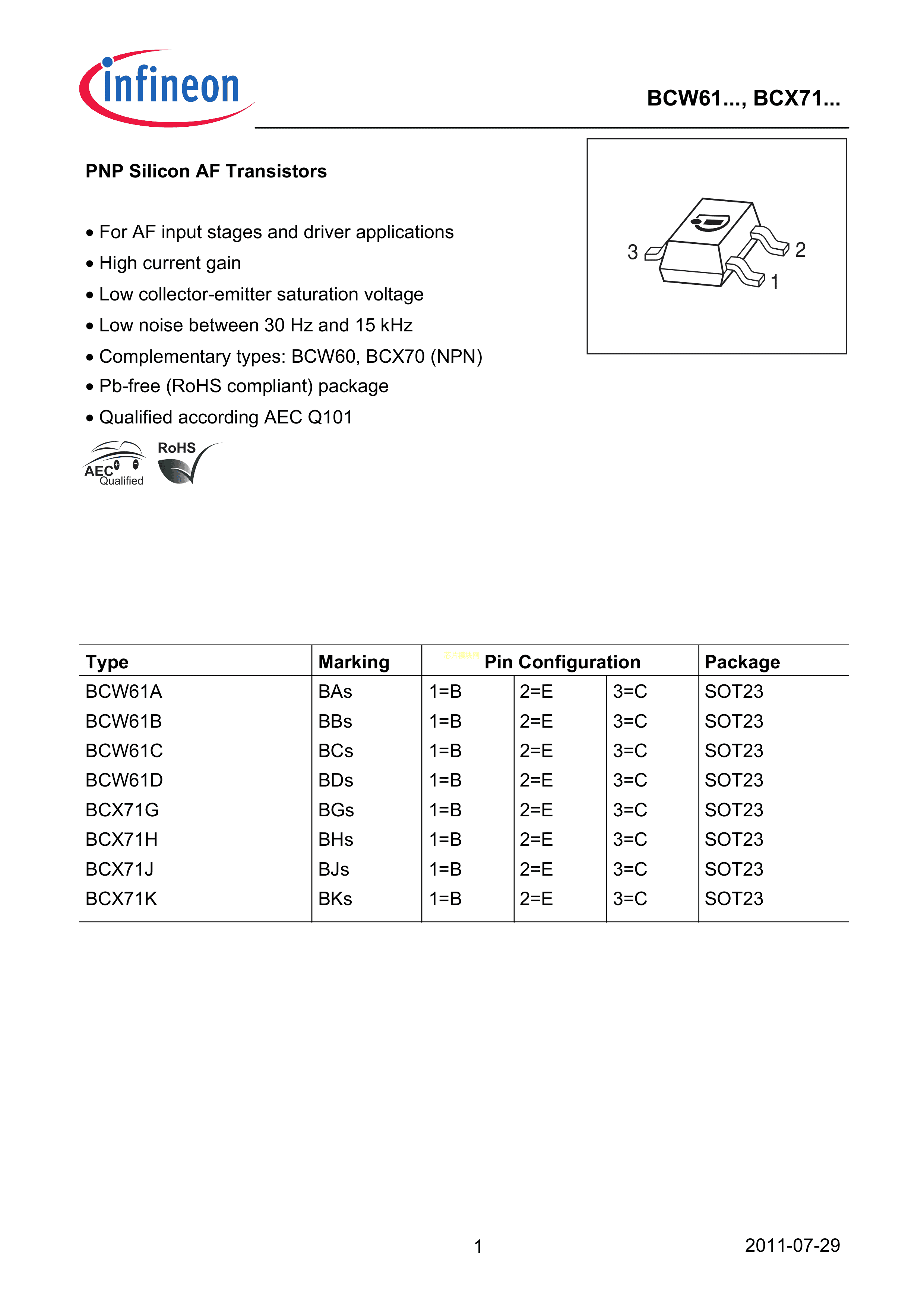 BCW61BE6327数据手册SOT-23封装Infineon(英飞凌)PDF规格书,中英文下载