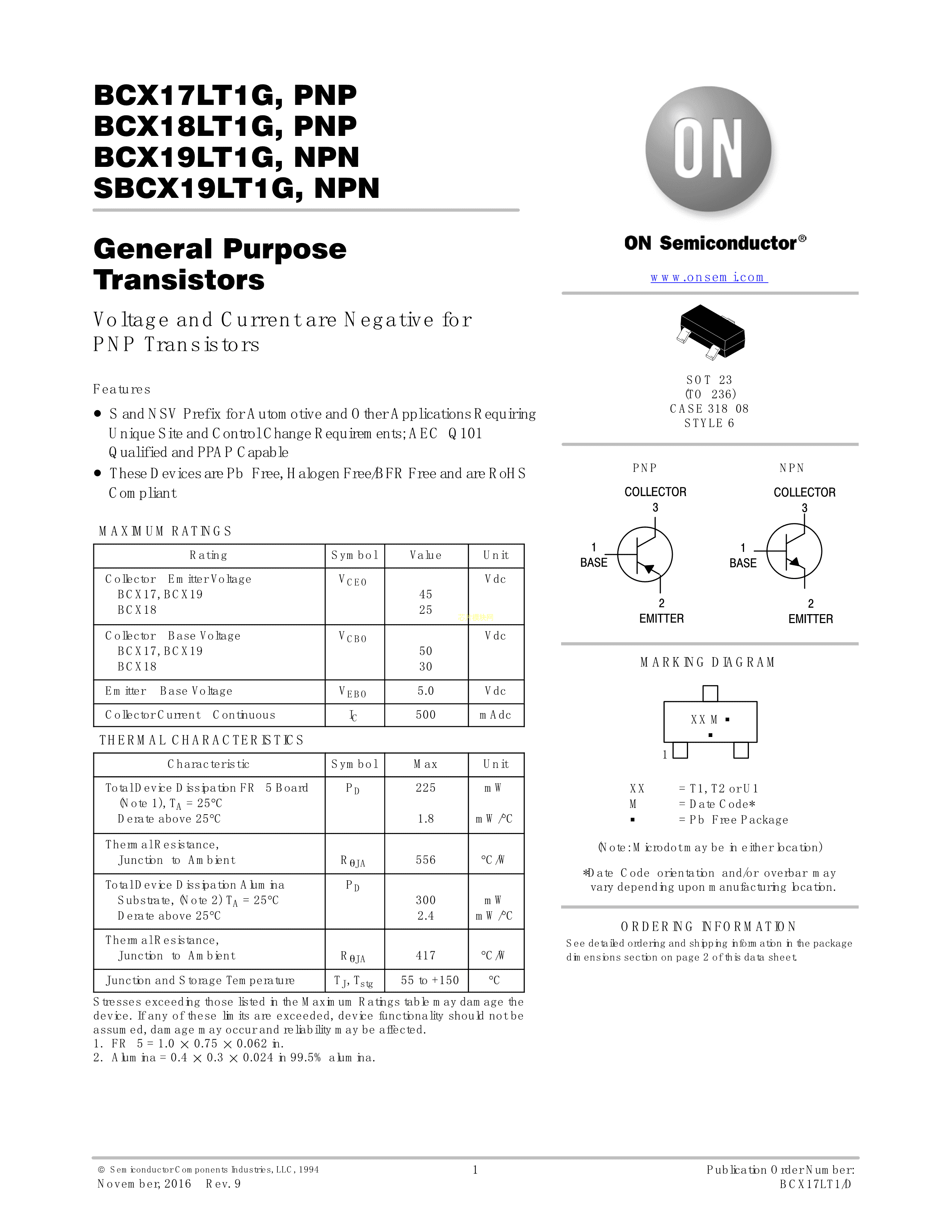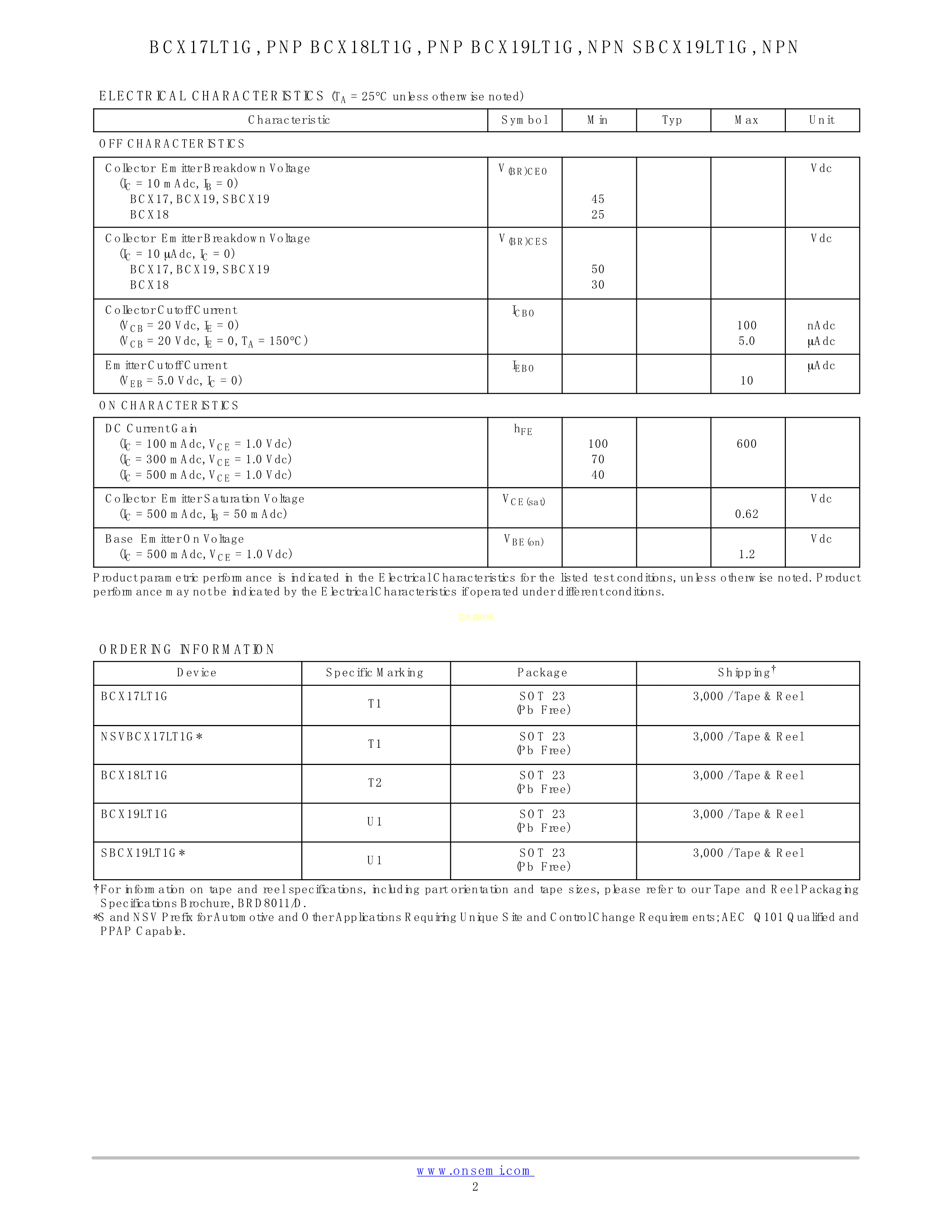 BCX19LT1G数据手册SOT-23(SOT-23-3)封装onsemi(安森美)PDF规格书,中