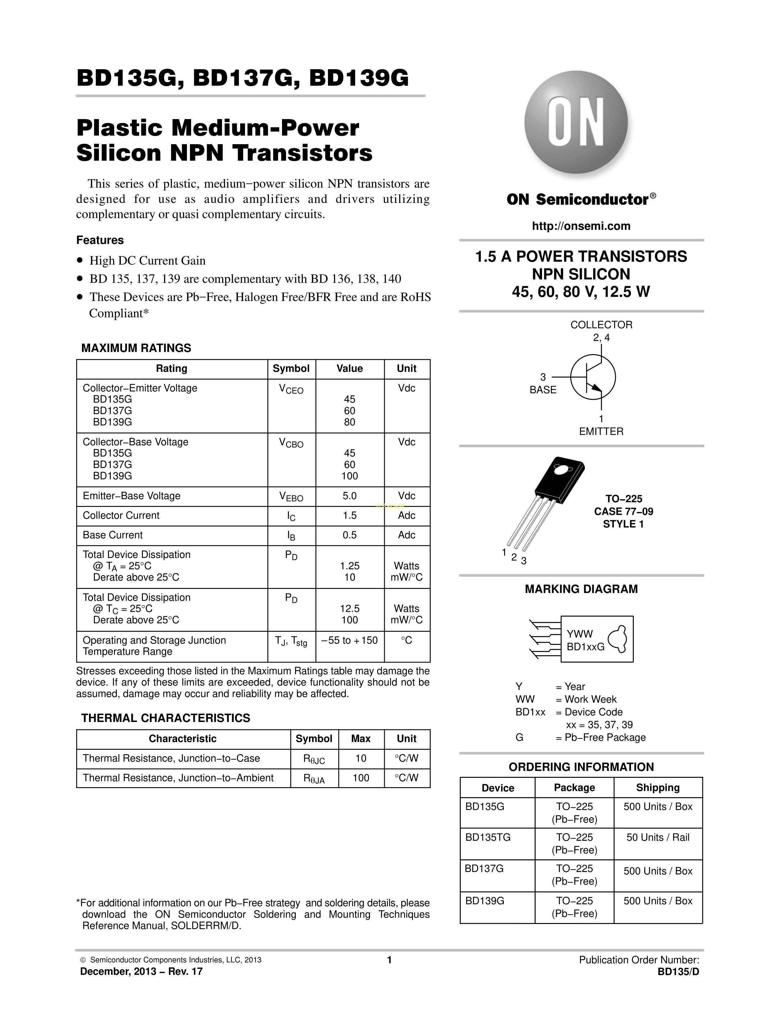 BD135G数据手册TO-225AA封装onsemi(安森美)PDF规格书,中英文下载