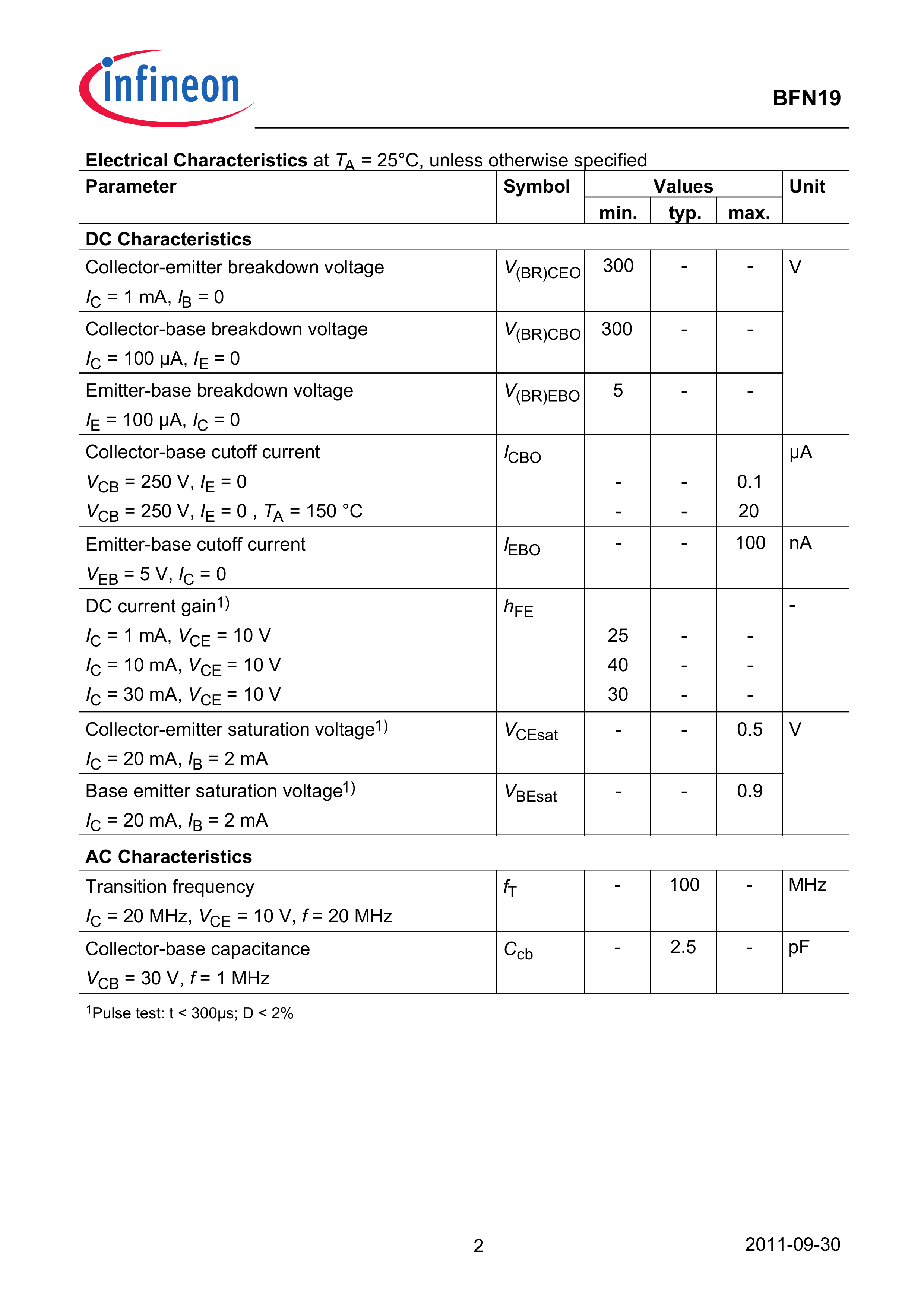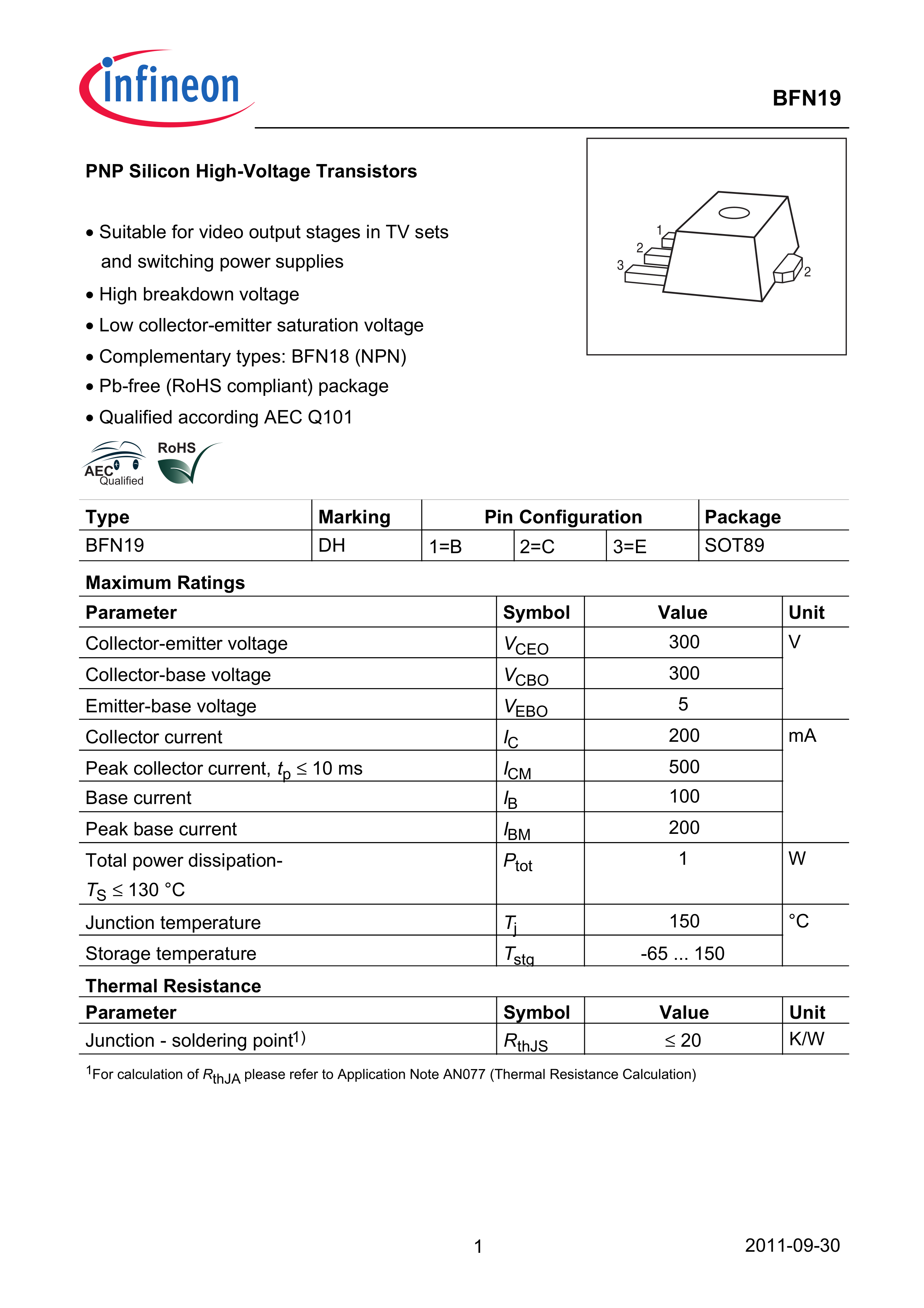 BFN 19 H6327数据手册PG-SOT89-4封装Infineon(英飞凌)PDF规格书,中英