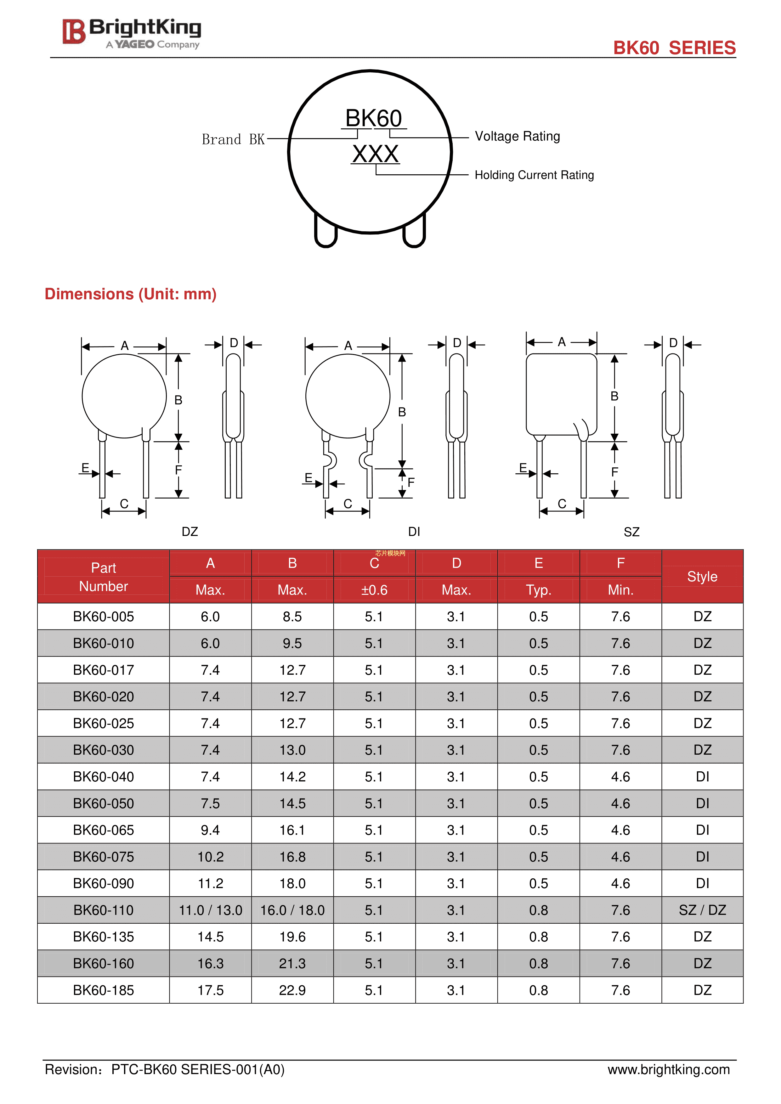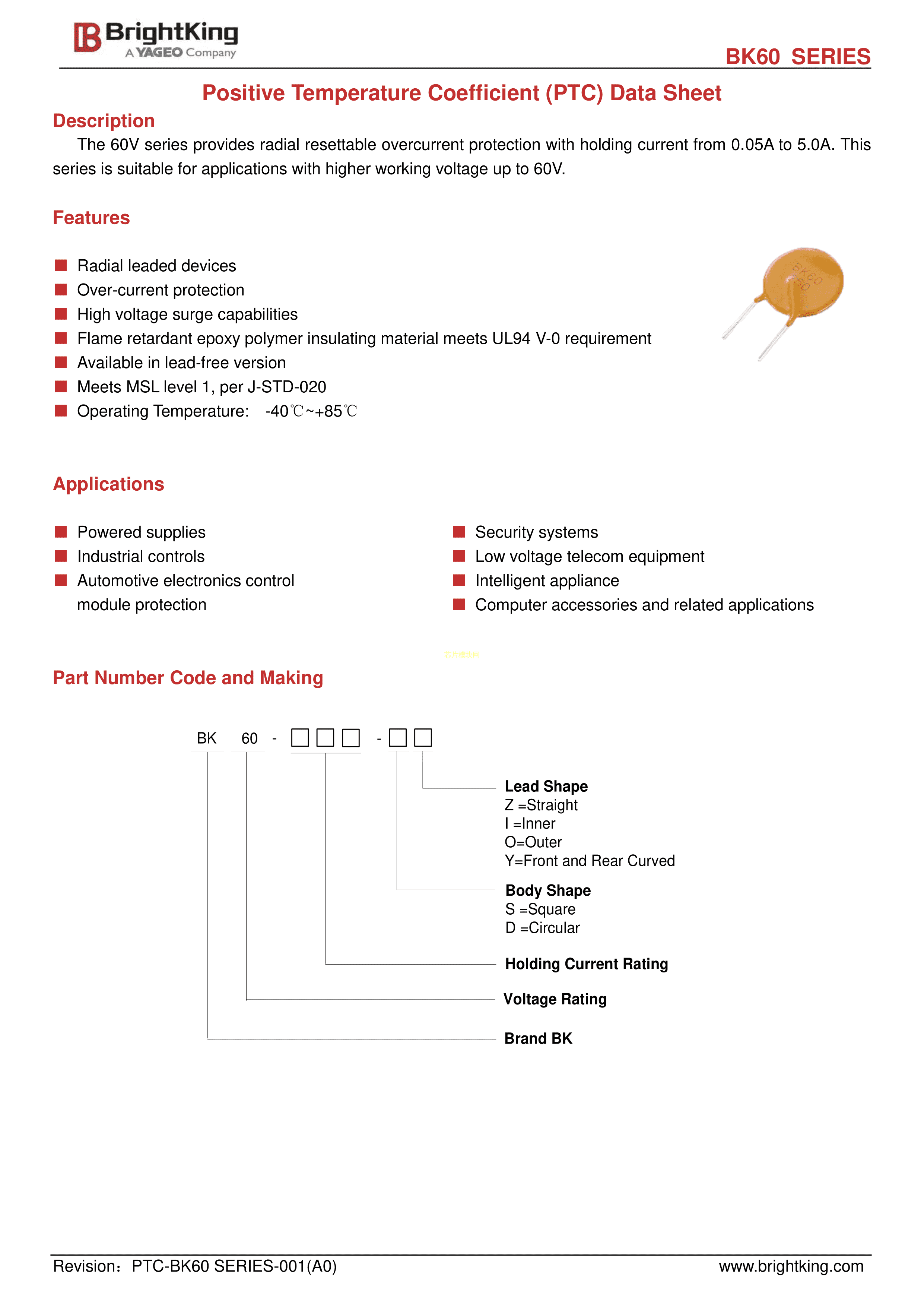BK60-500-DZ数据手册径向引线P10.2mm封装Brightking(台湾君耀)PDF规格书,中英文下载