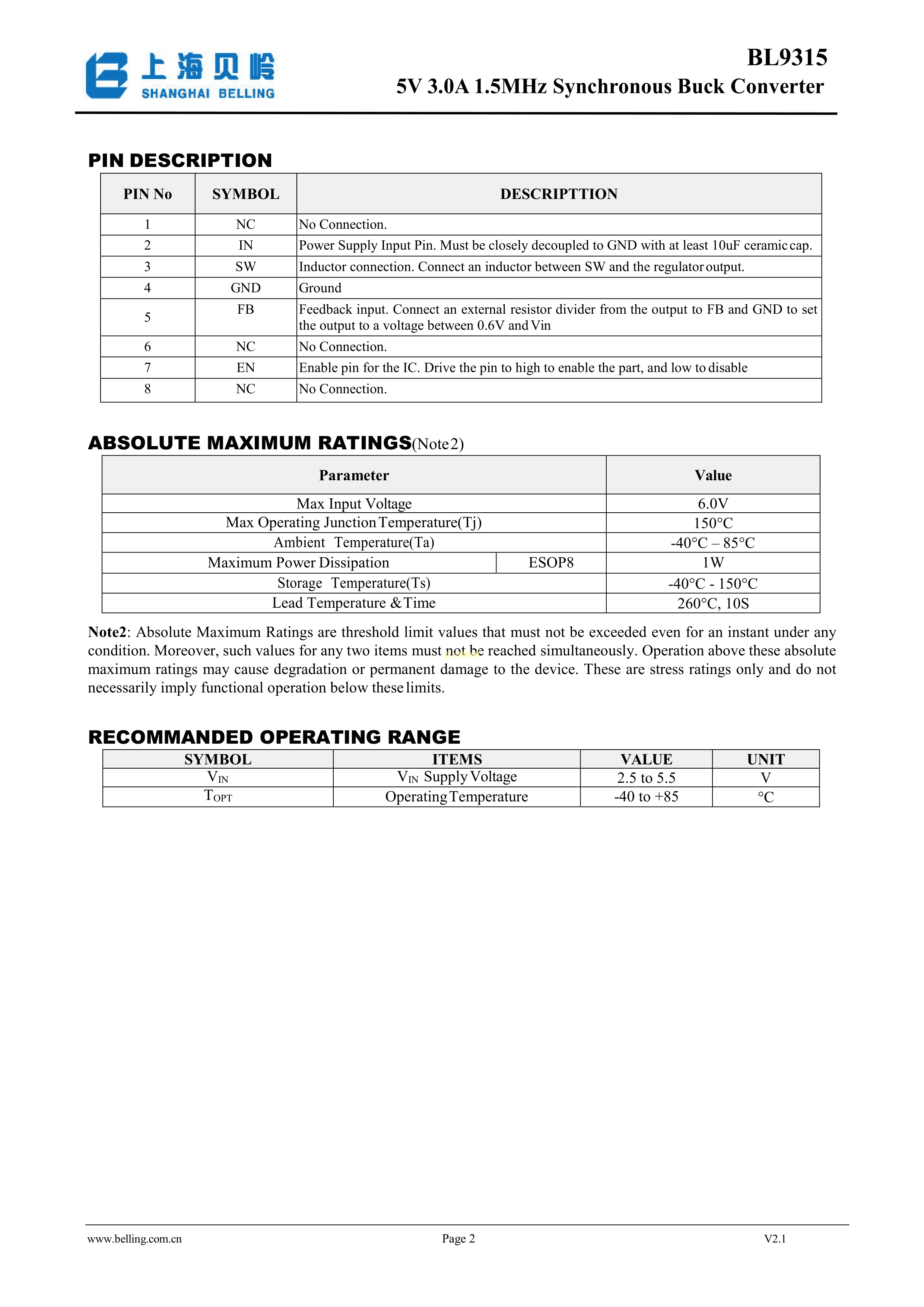 BL9315数据手册ESOP-8封装BL(上海贝岭)PDF规格书,中英文下载