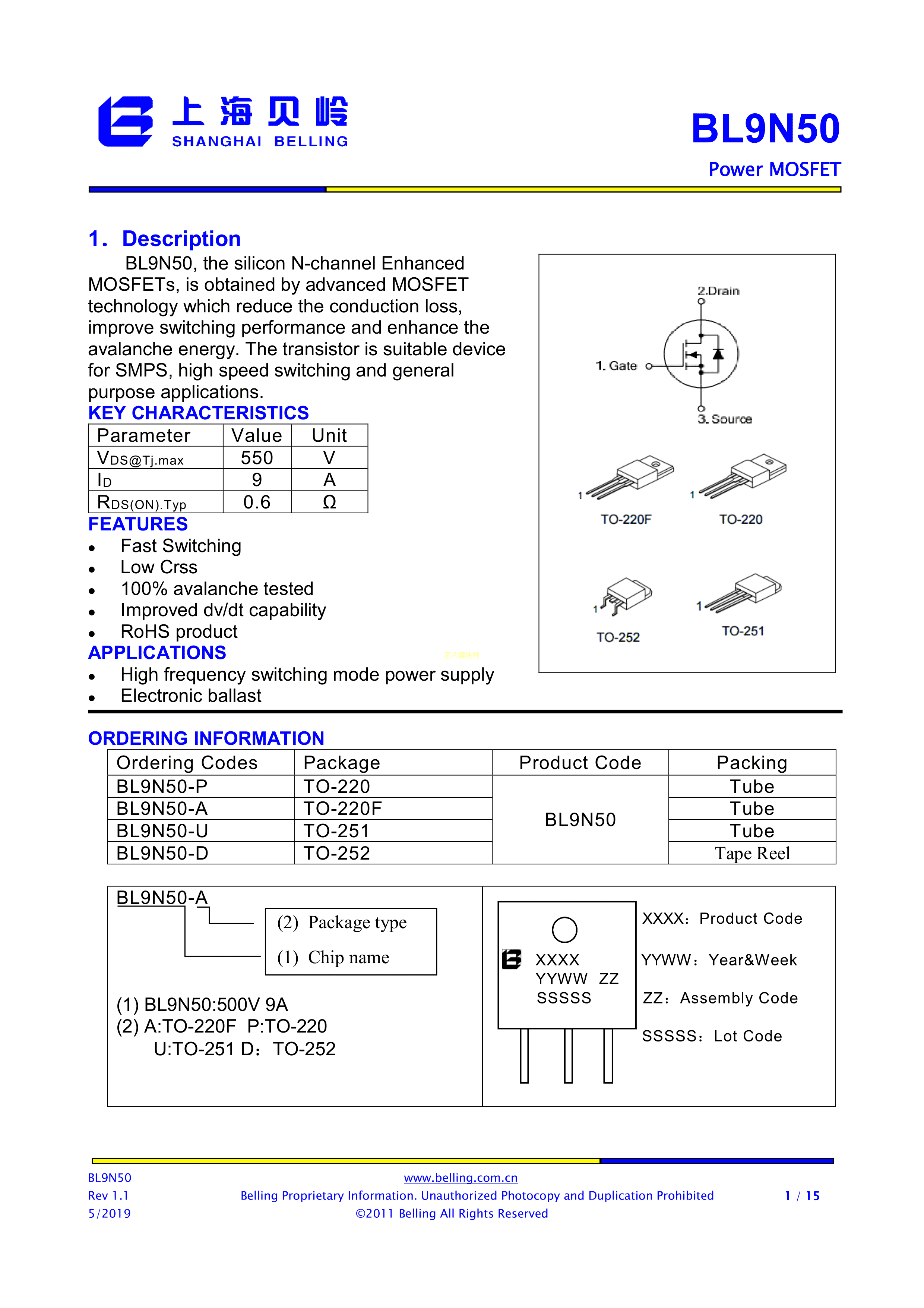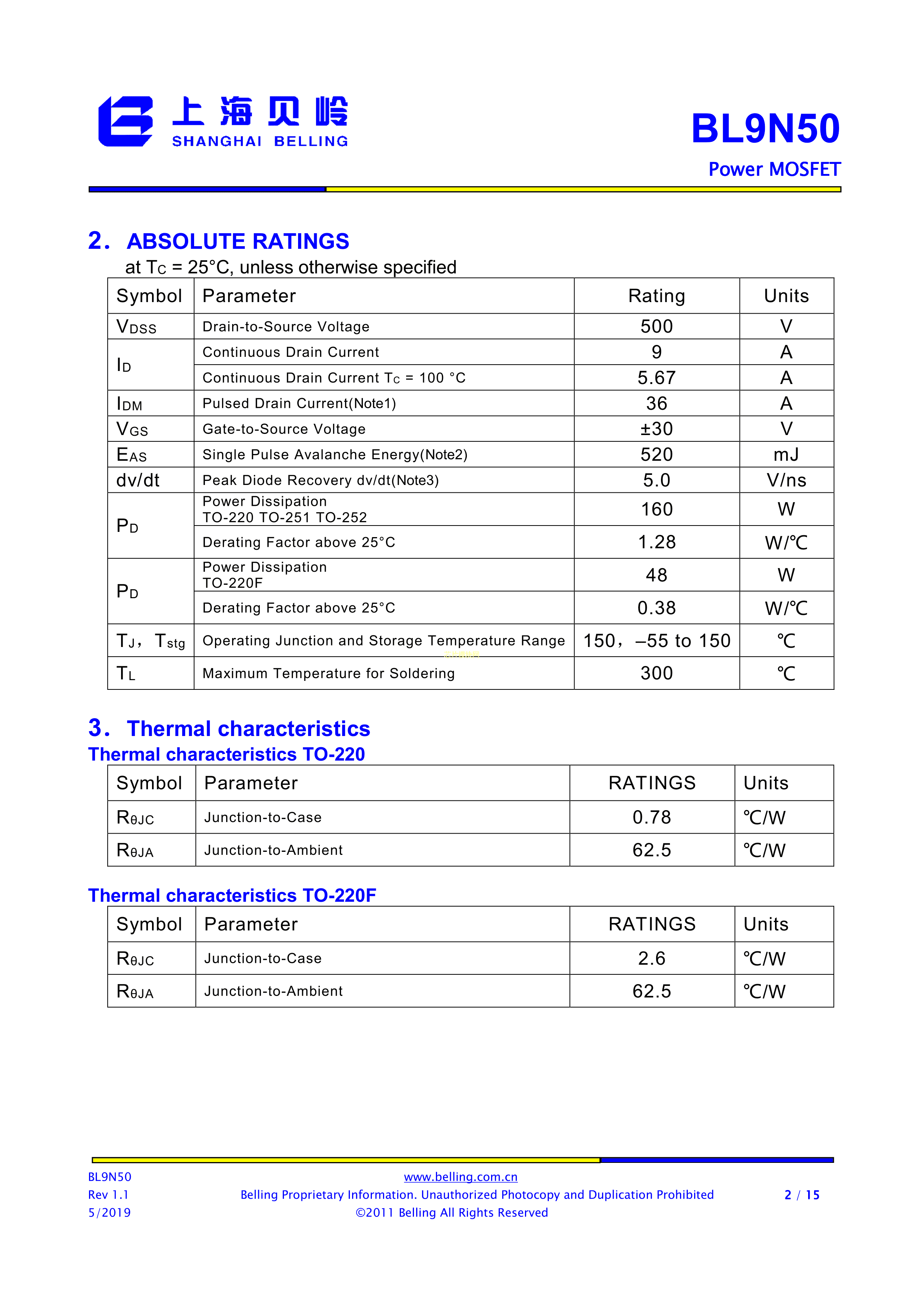 BL9N50-A数据手册TO-220F封装BL(上海贝岭)PDF规格书,中英文下载