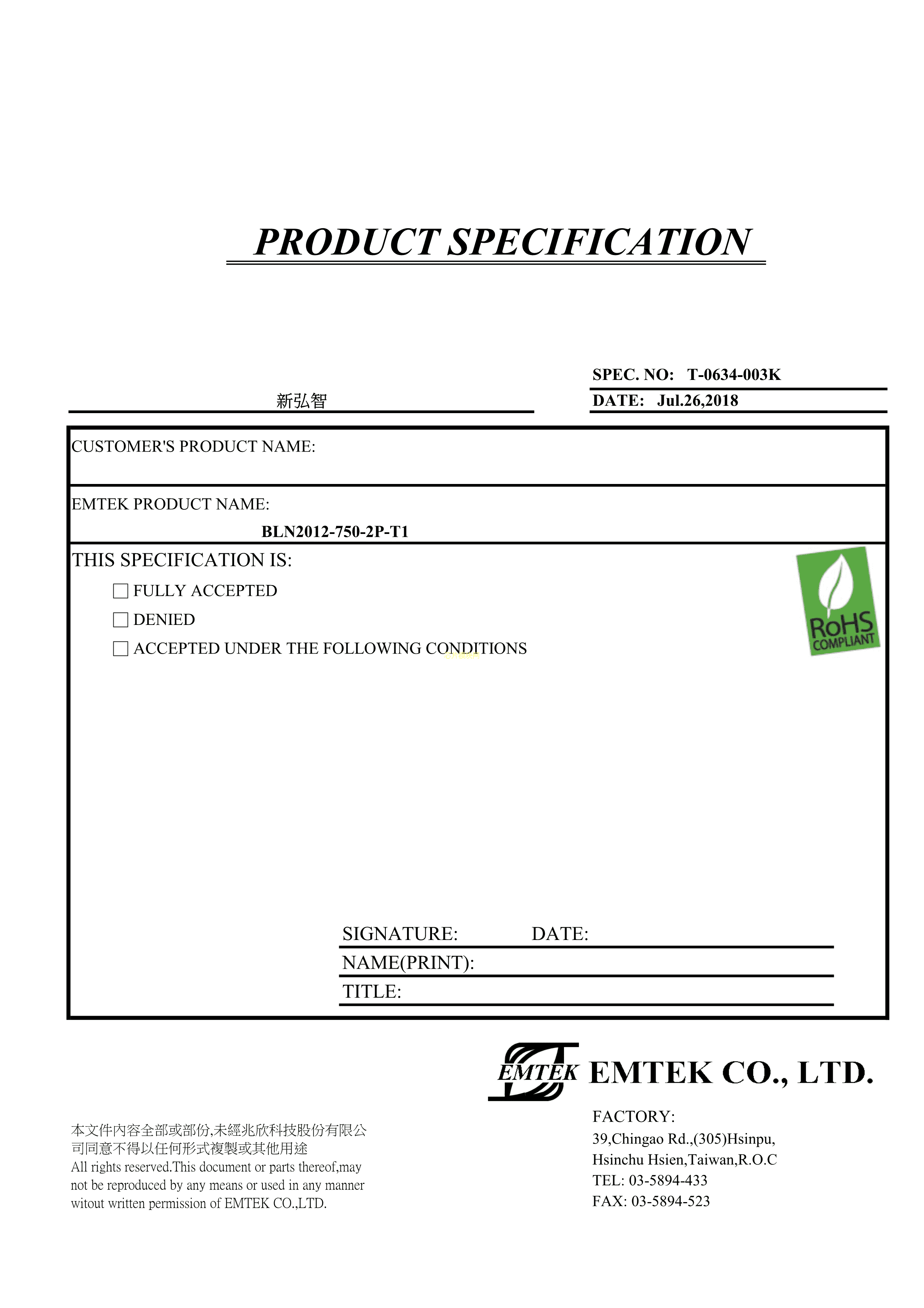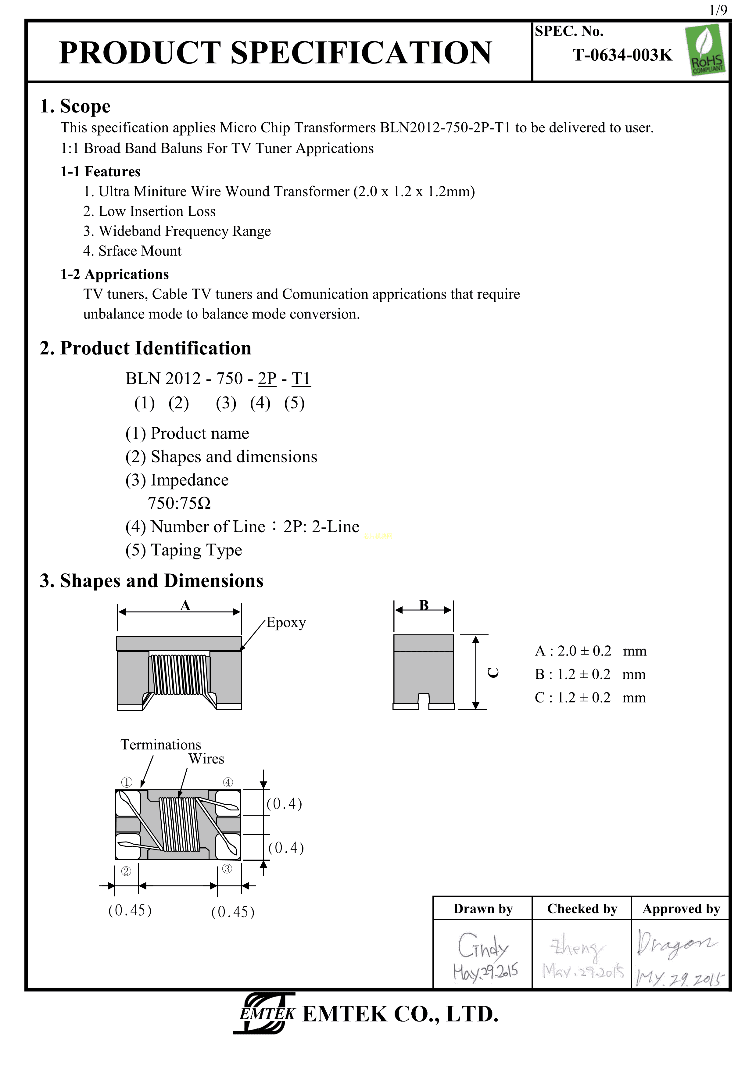 BLN2012-750-2P-T1数据手册SMD2x1.2x1.2mm封装EMTEK(台湾兆欣)PD