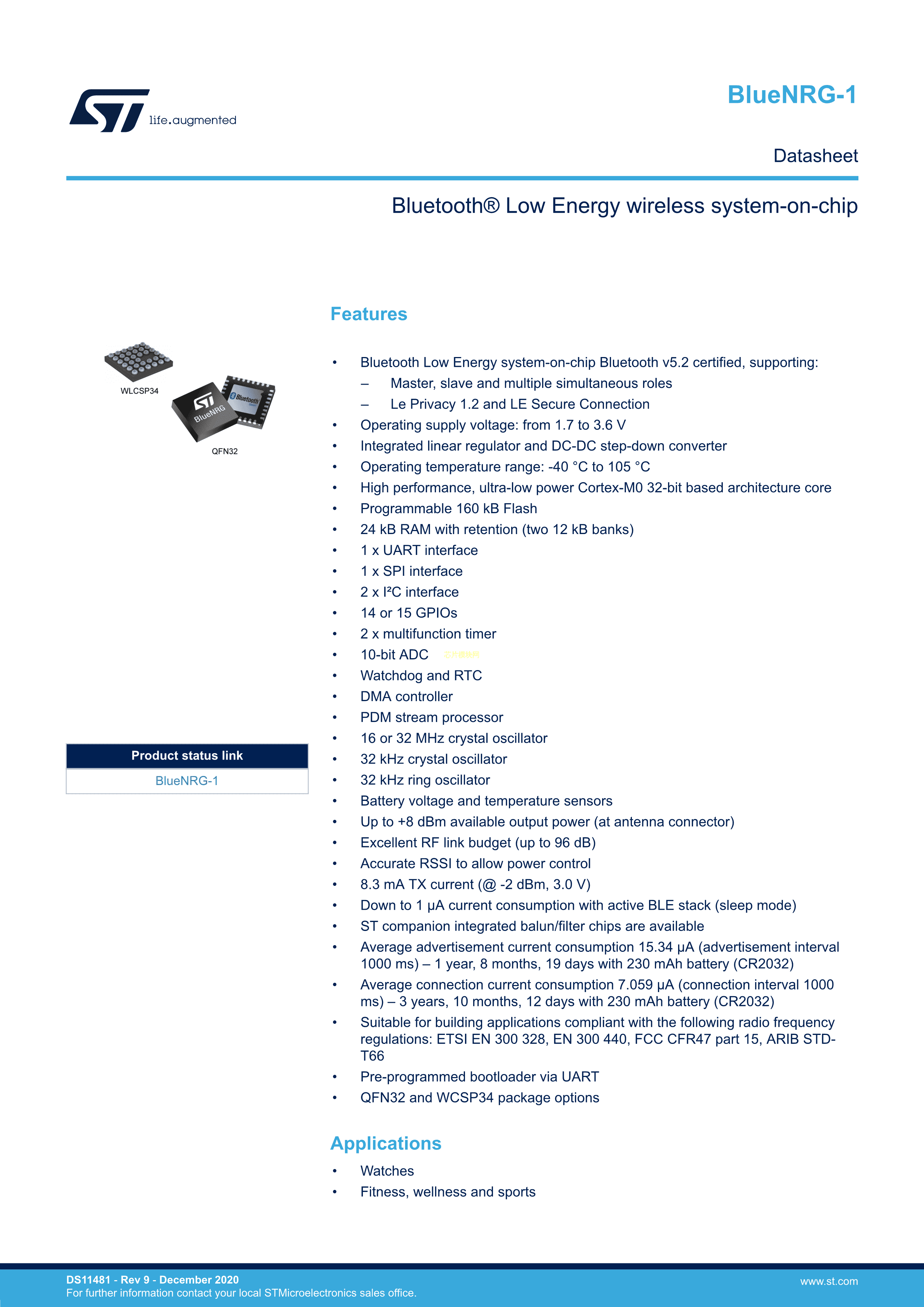 BLUENRG-134数据手册WLCSP-34封装ST(意法半导体)PDF规格书,中英文下载