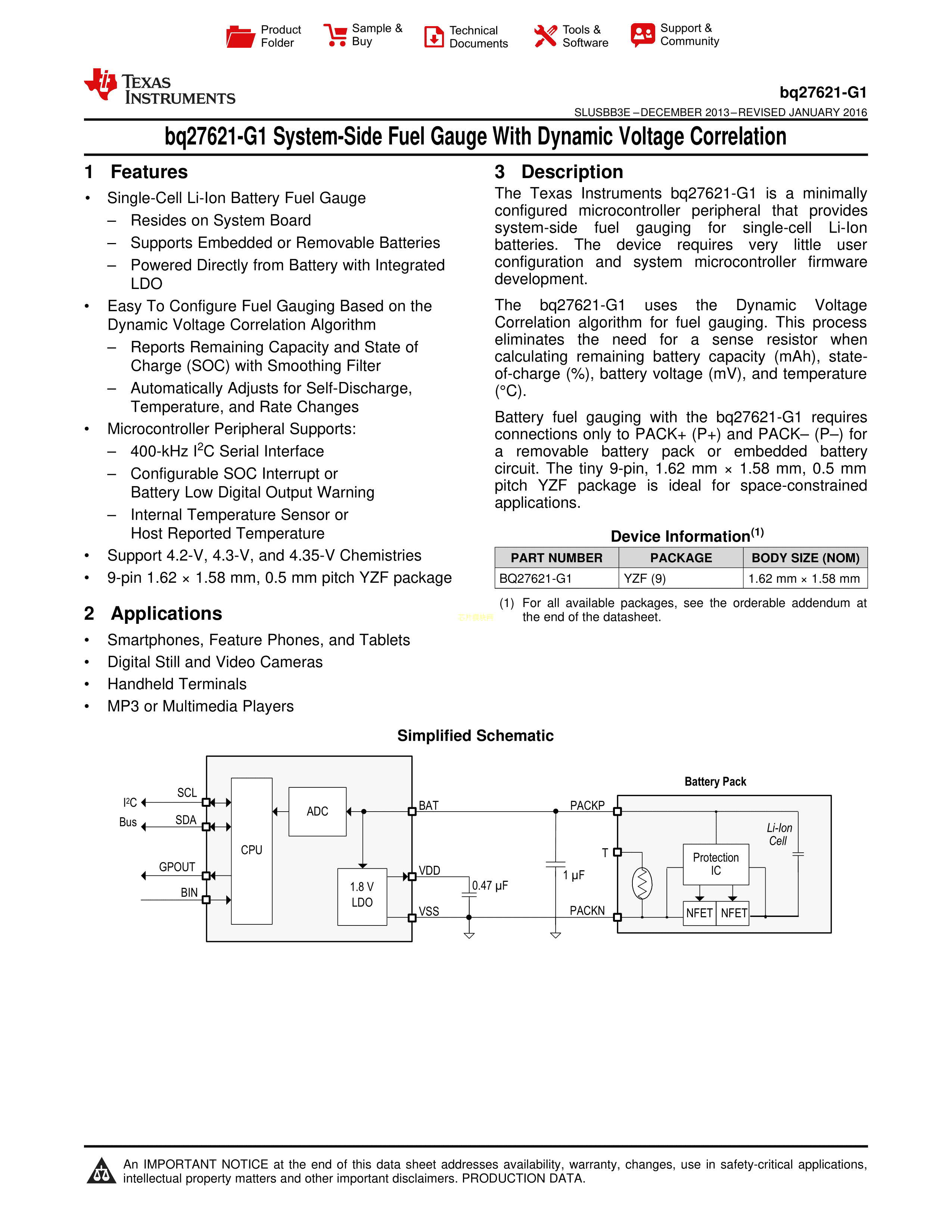 BQ27621YZFR-G1A数据手册DSBGA封装TI(德州仪器)PDF规格书,中英文下载