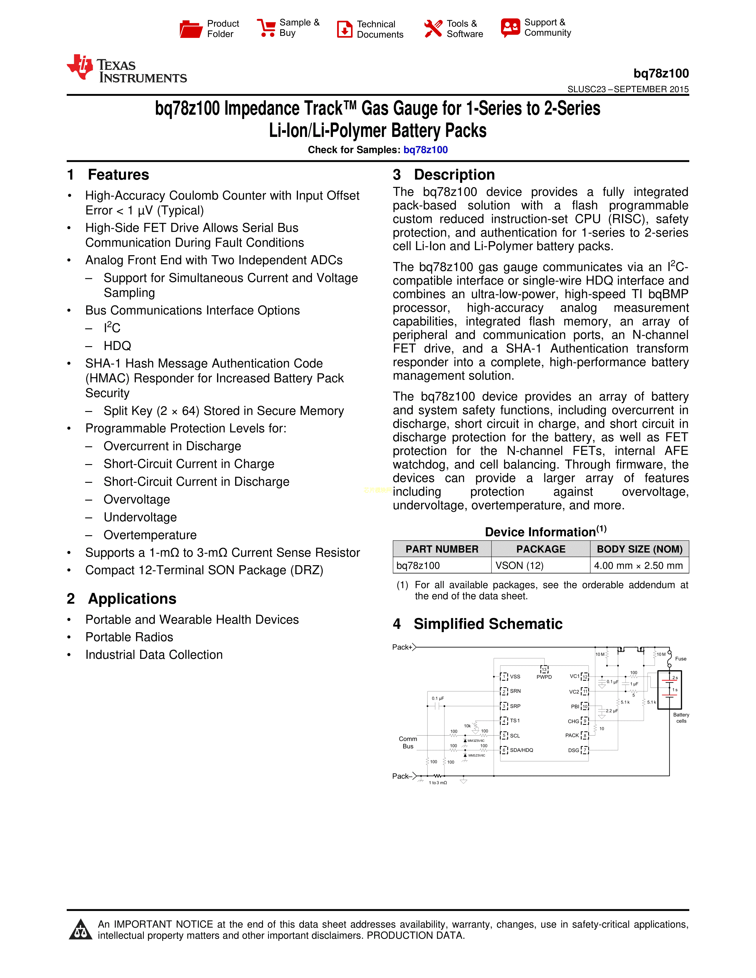 BQ78Z100DRZT数据手册SON-12封装TI(德州仪器)PDF规格书,中英文下载
