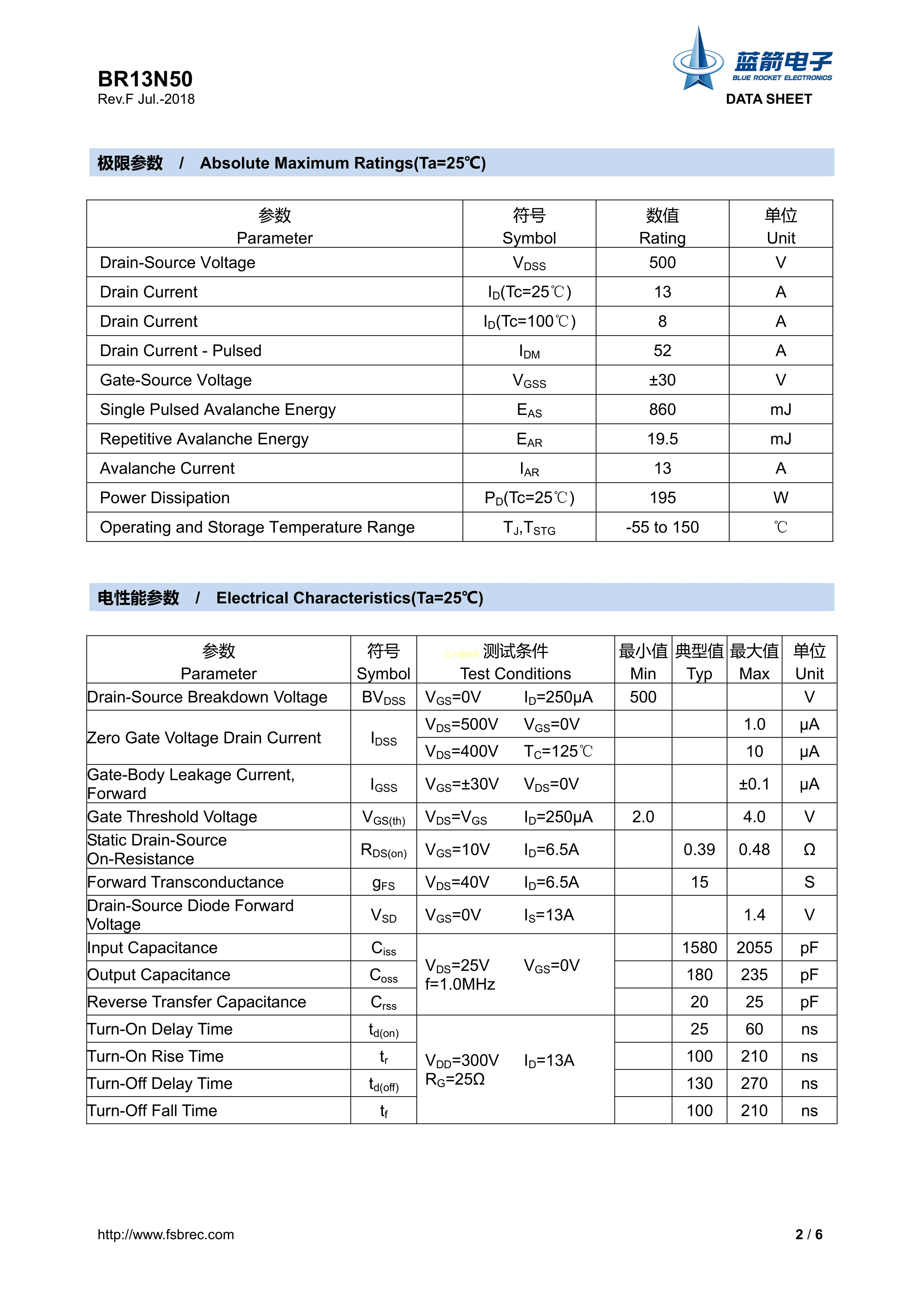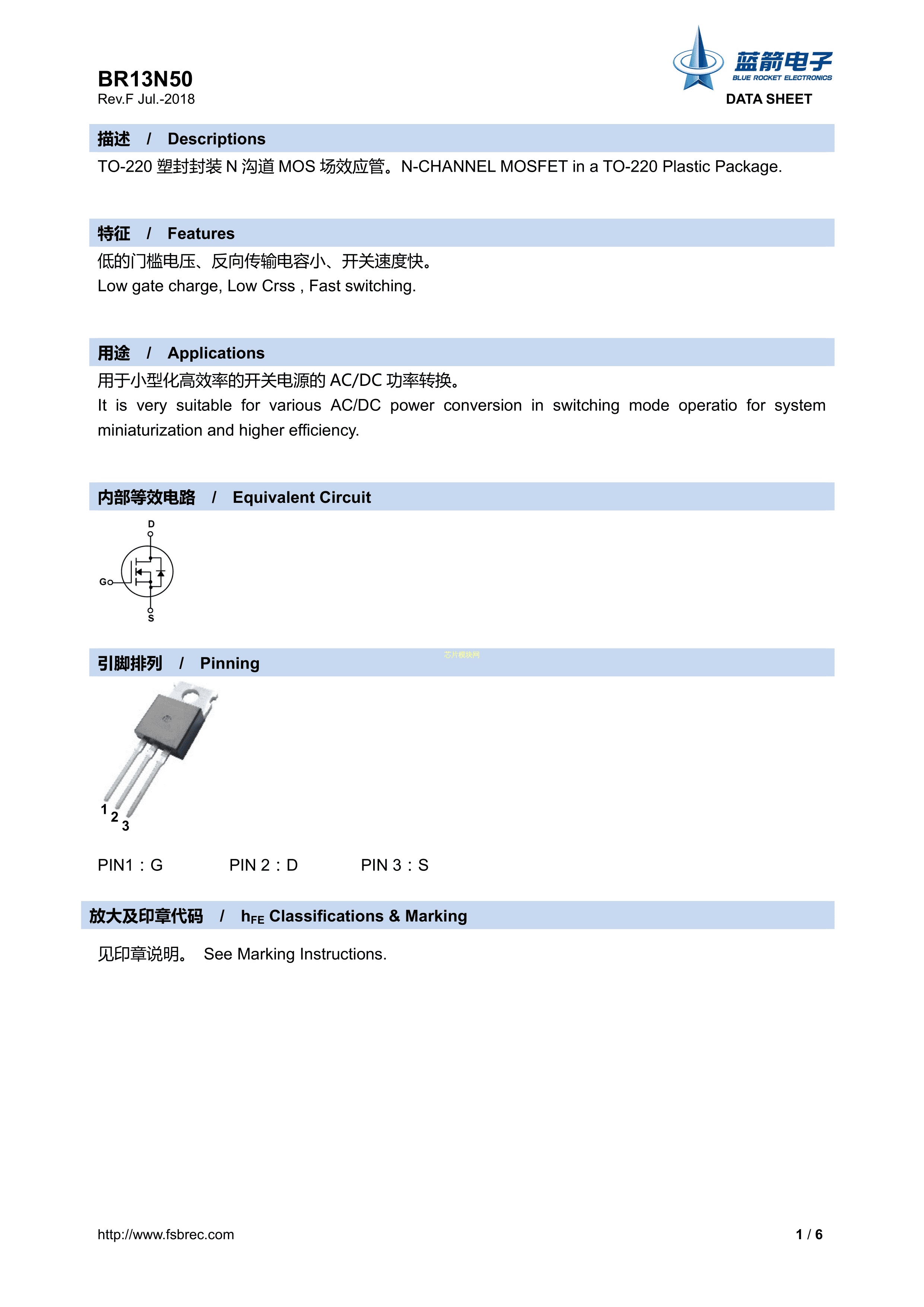 BR13N50数据手册TO-220封装BLUEROCKET(蓝箭)PDF规格书,中英文下载