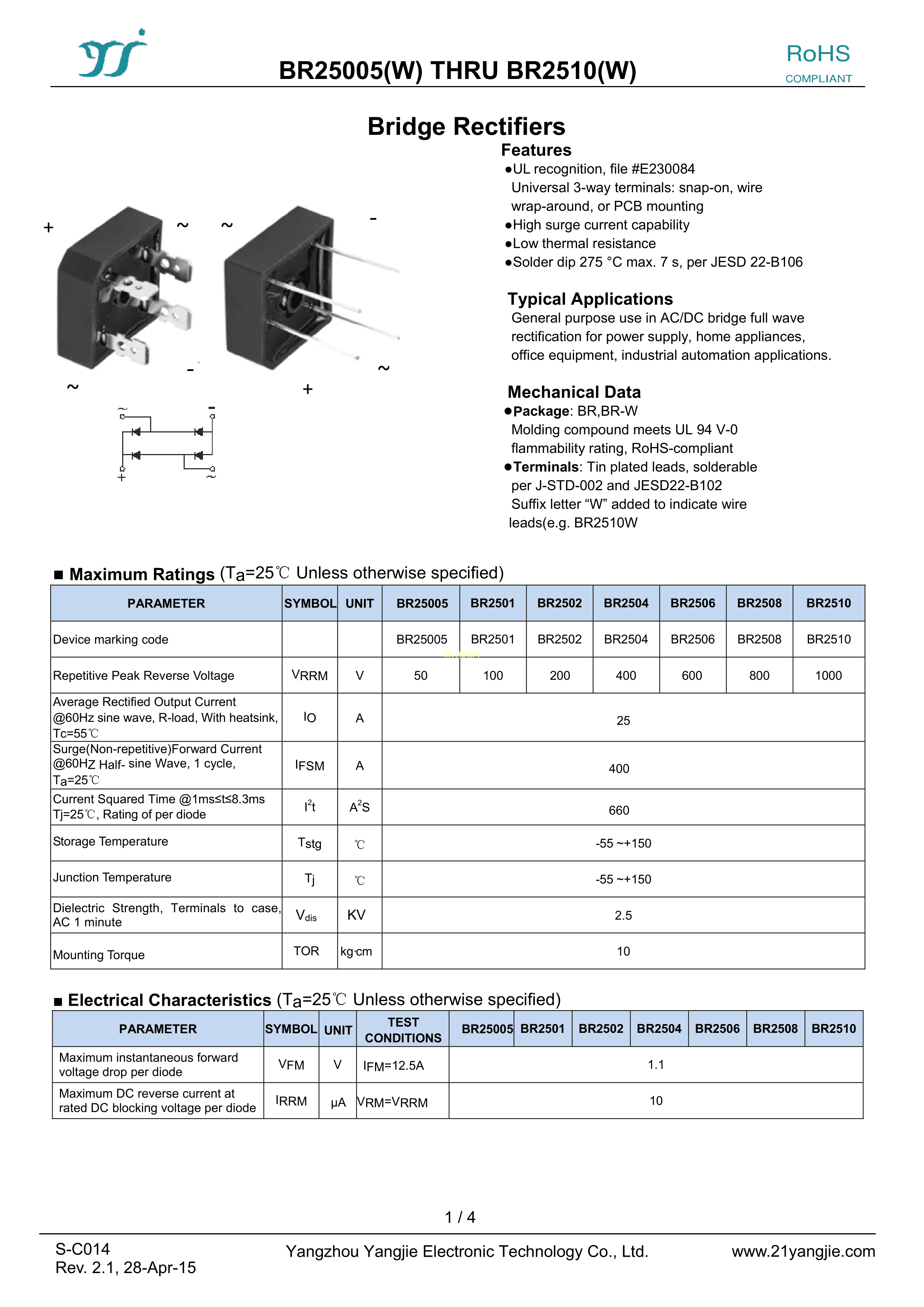 BR2510数据手册BR封装YANGJIE(扬杰)PDF规格书,中英文下载