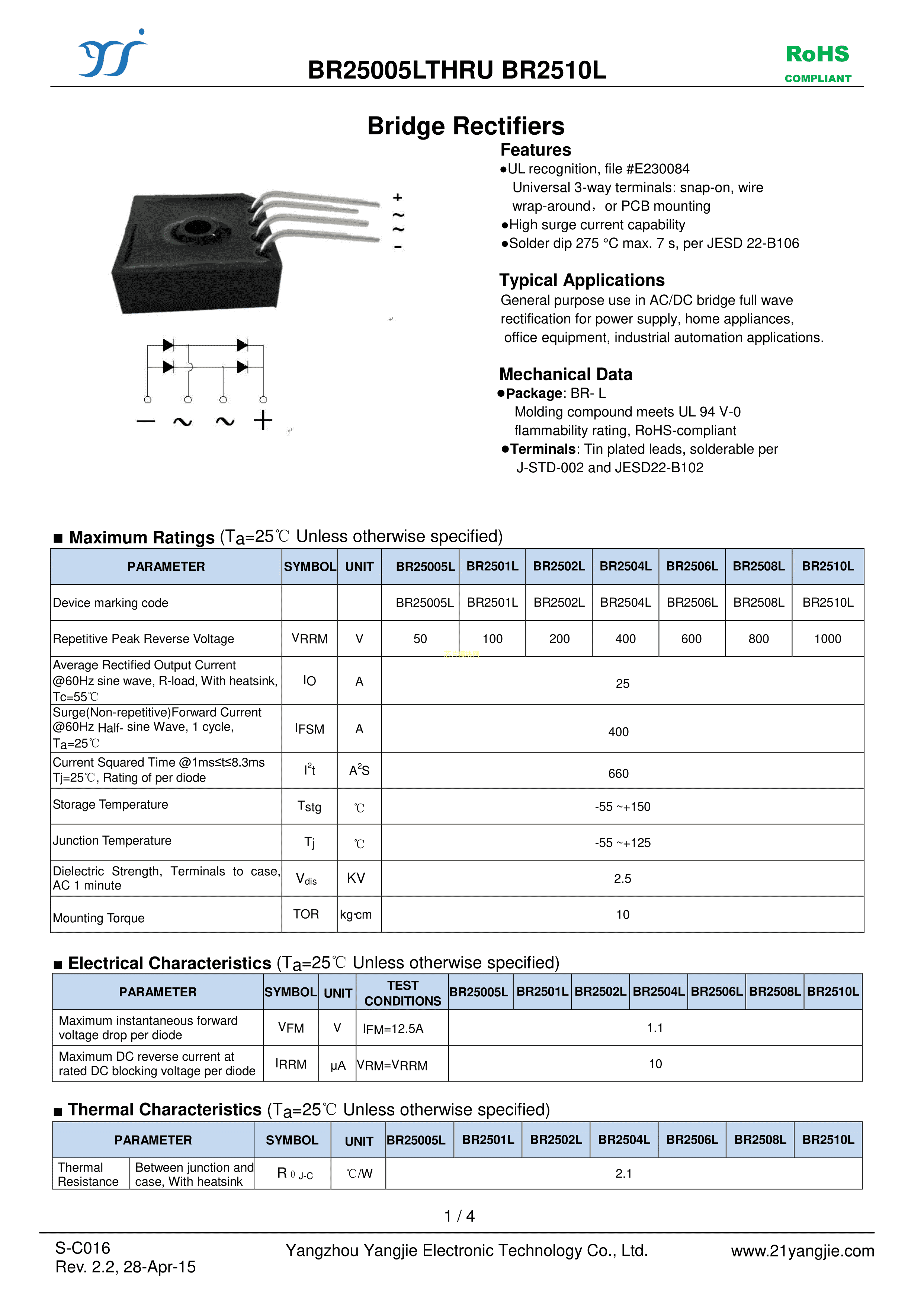 BR2510L数据手册BR-L封装YANGJIE(扬杰)PDF规格书,中英文下载