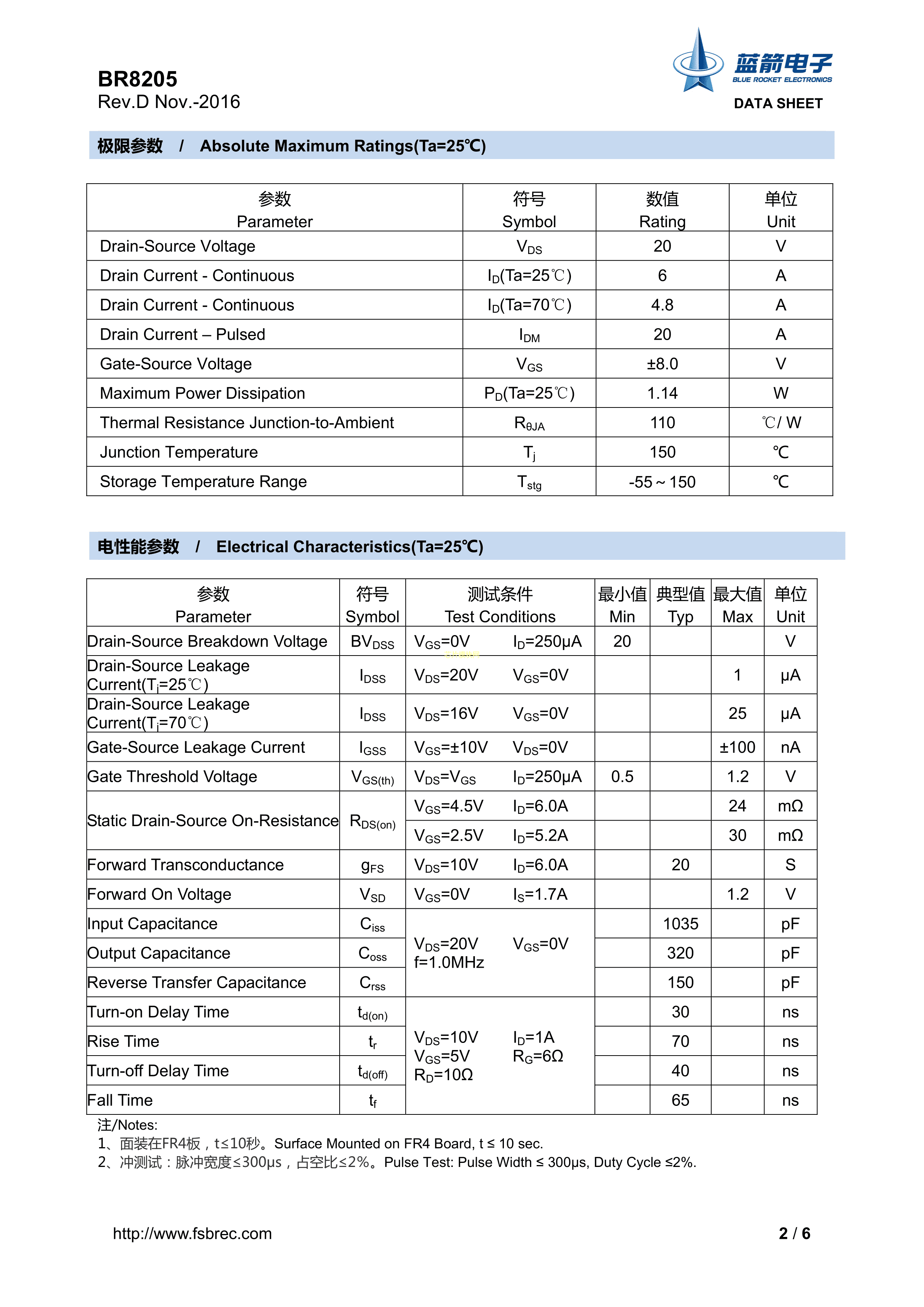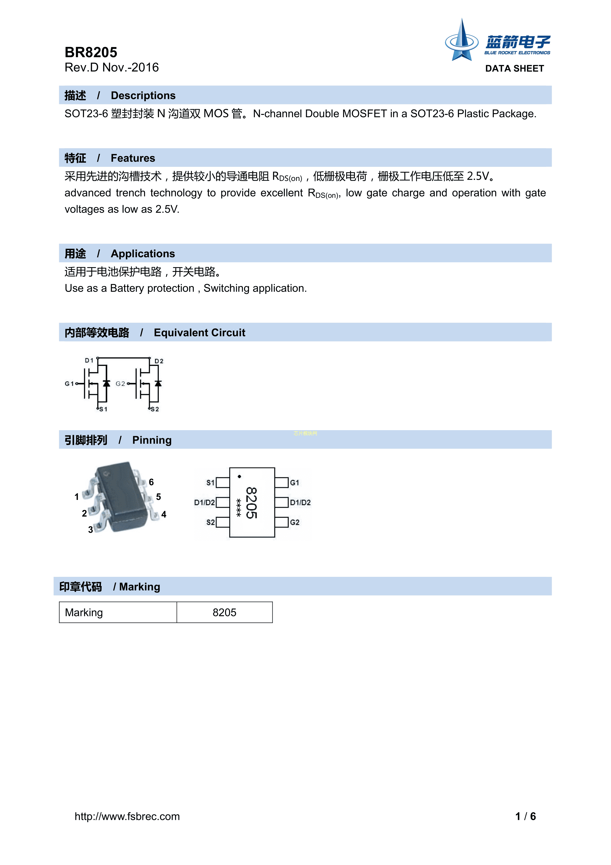 BR8205数据手册SOT-23-6封装BLUEROCKET(蓝箭)PDF规格书,中英文下载