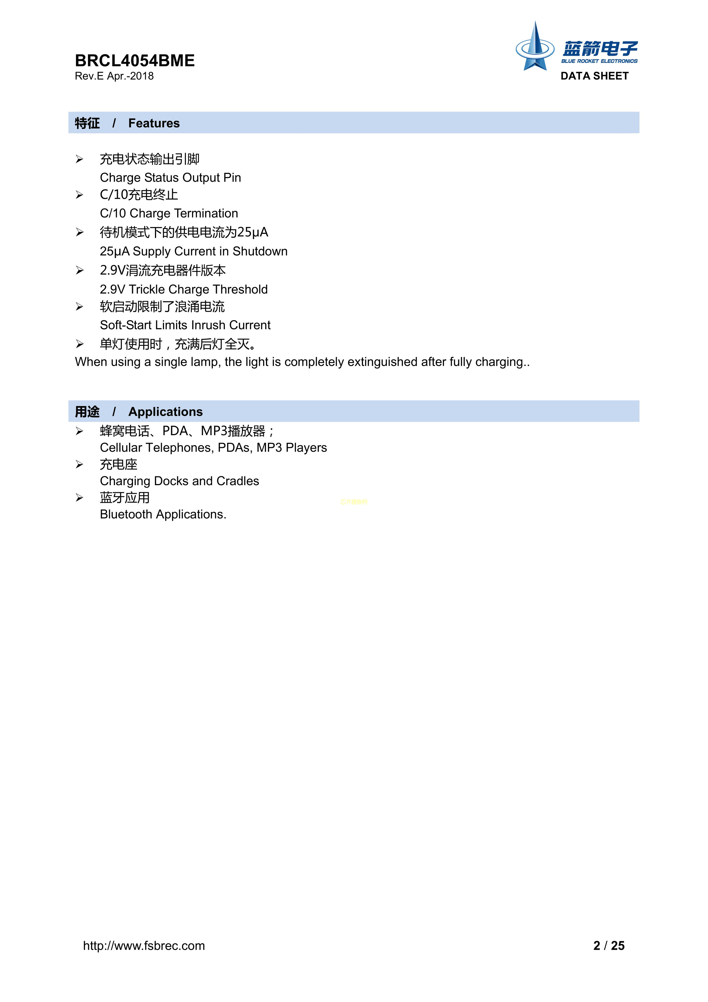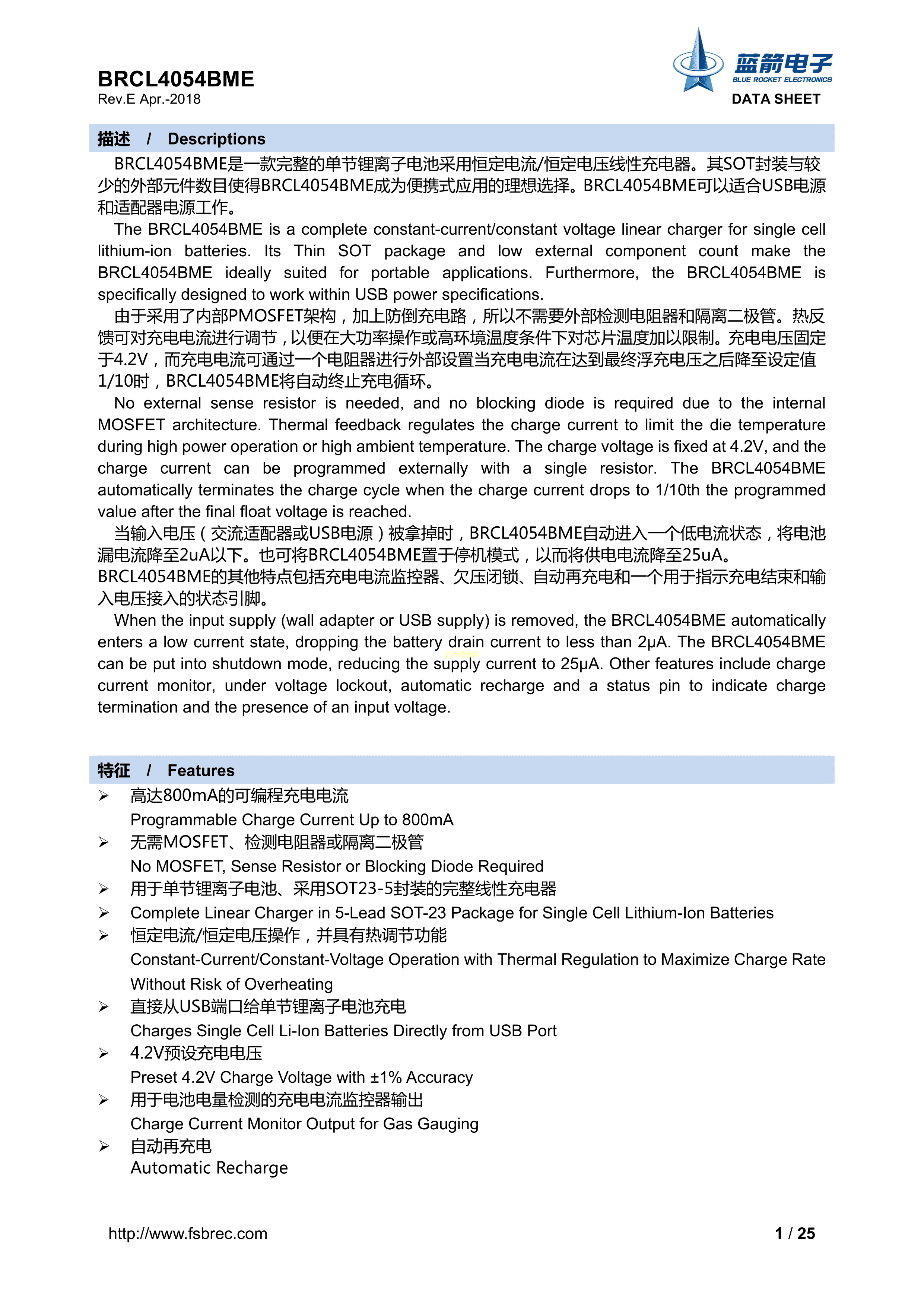 BRCL4054BME数据手册SOT-23-5封装BLUE ROCKET(蓝箭)PDF规格书,中英文