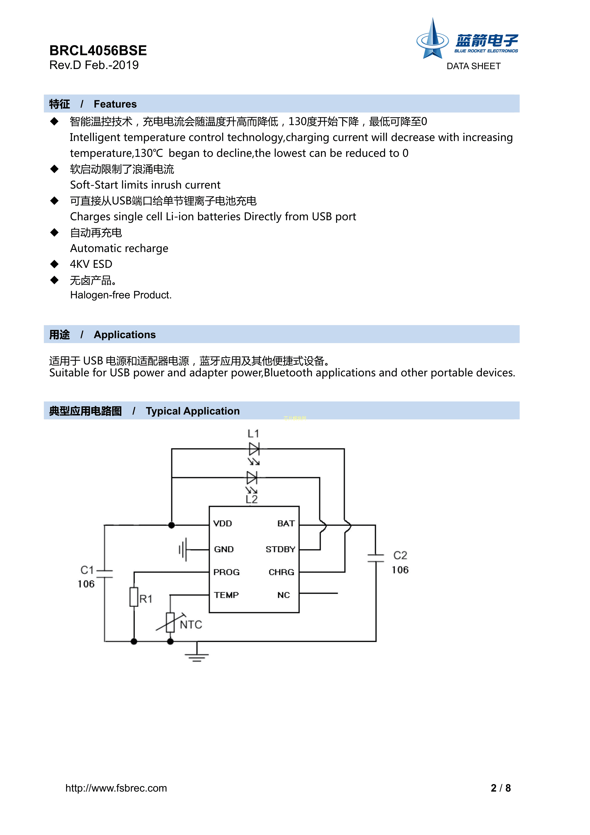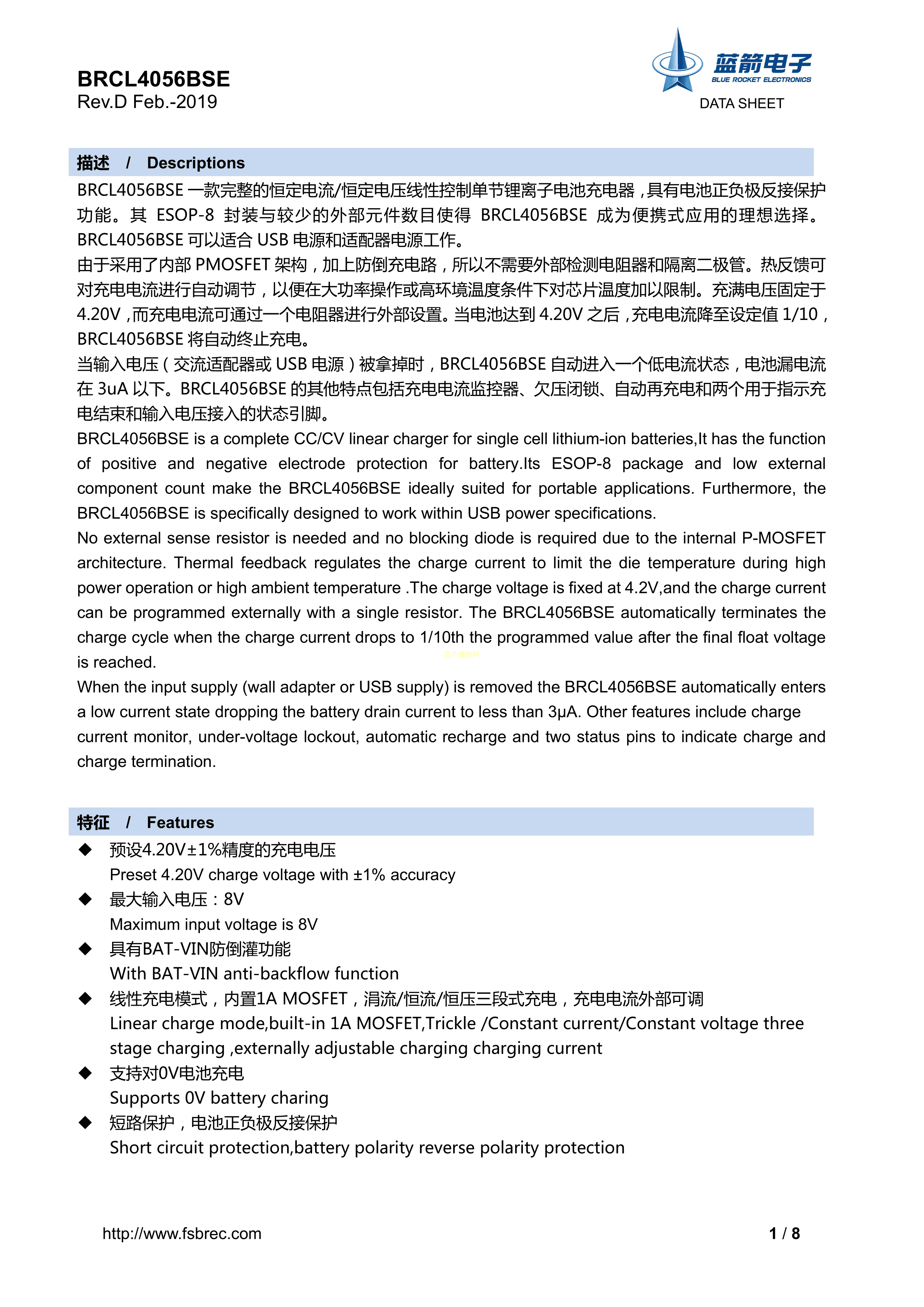 BRCL4056BSE数据手册ESOP-8封装BLUEROCKET(蓝箭)PDF规格书,中英文下载