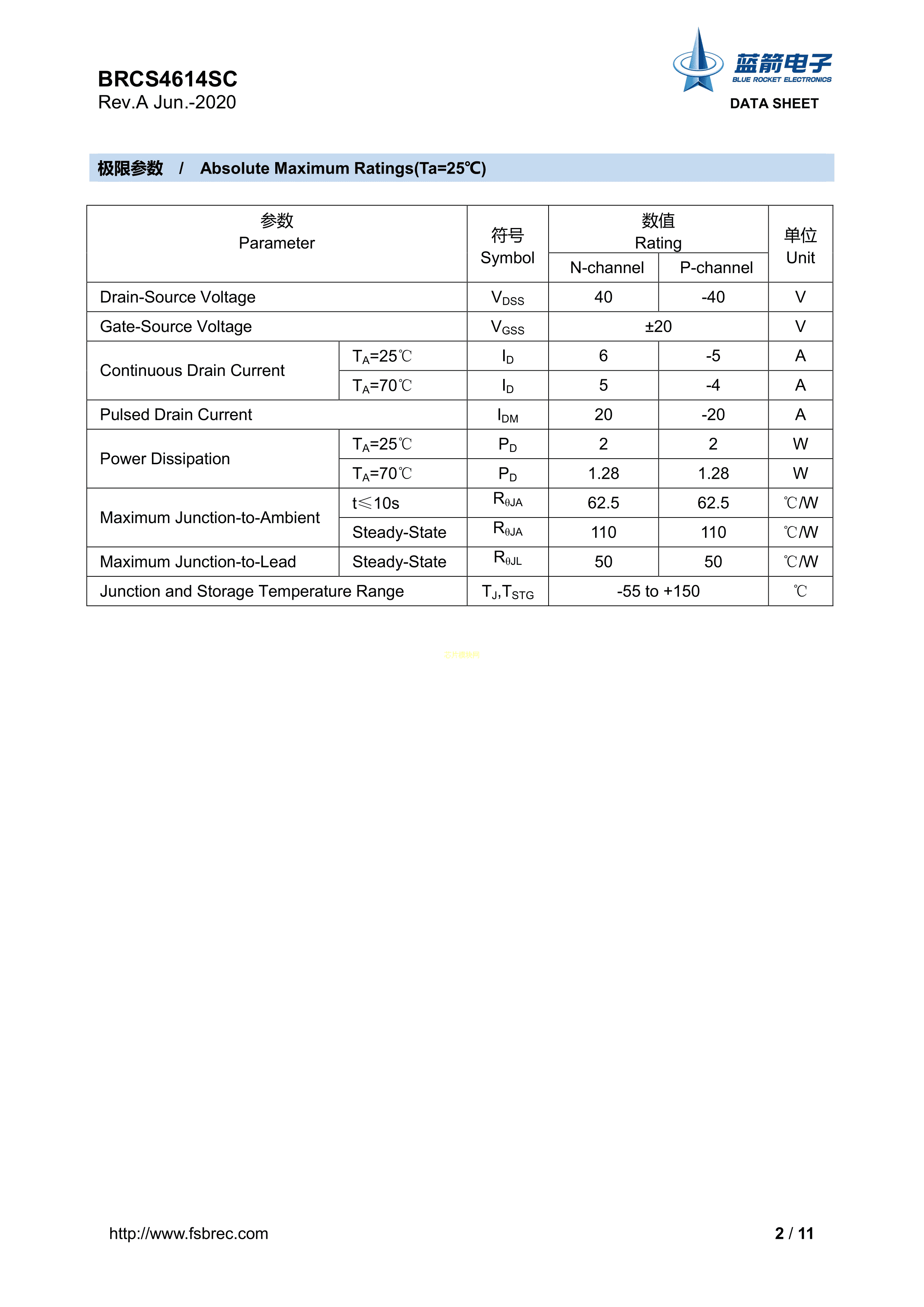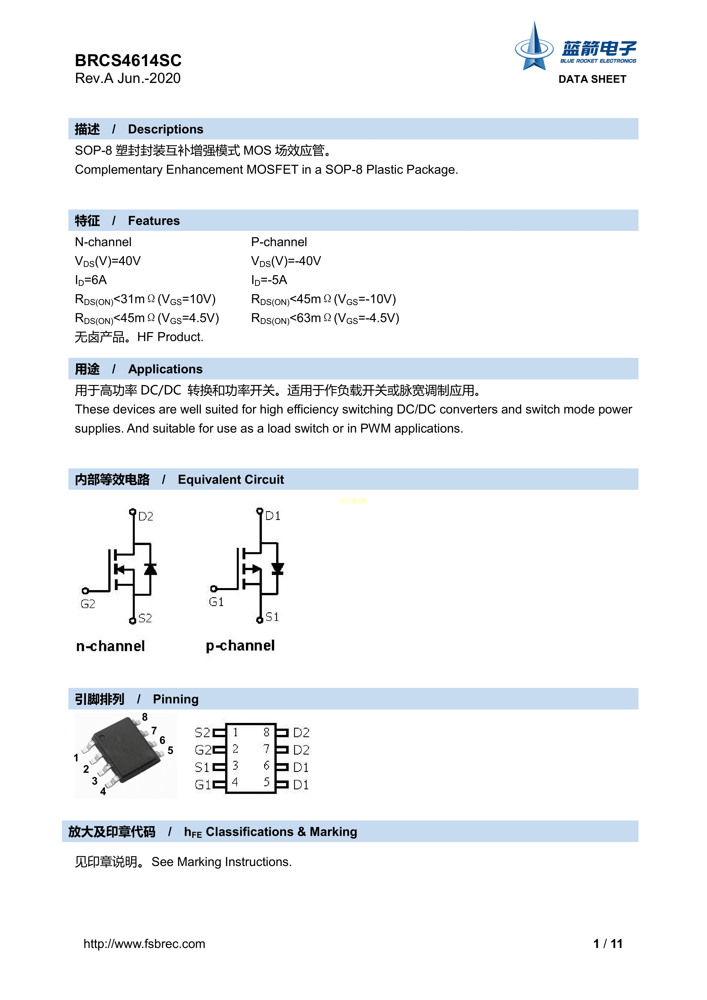 BRCS4614SC数据手册SOP-8封装BLUEROCKET(蓝箭)PDF规格书,中英文下载