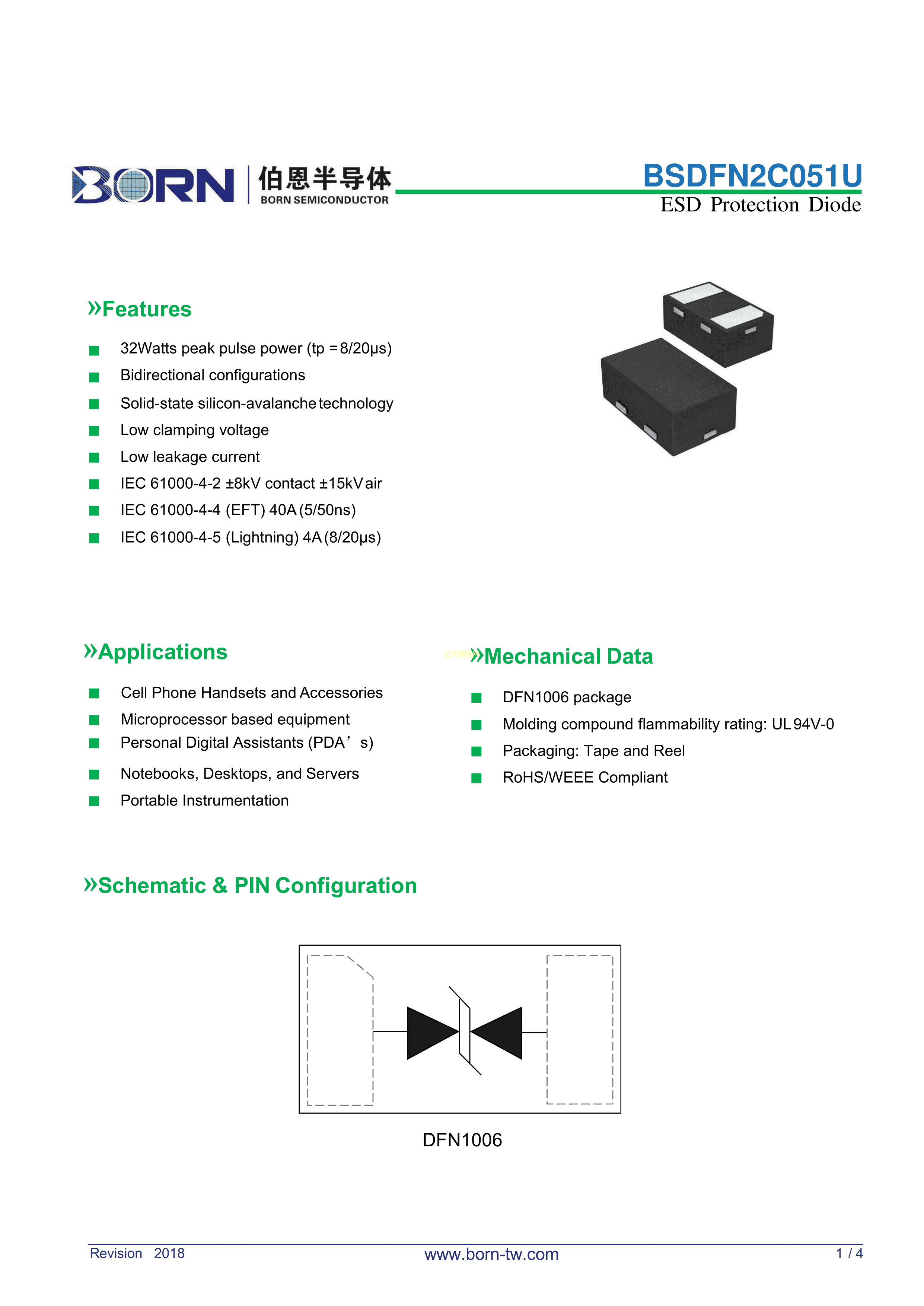 BSDFN2C051U数据手册DFN1006封装BORN(伯恩半导体)PDF规格书,中英文下载