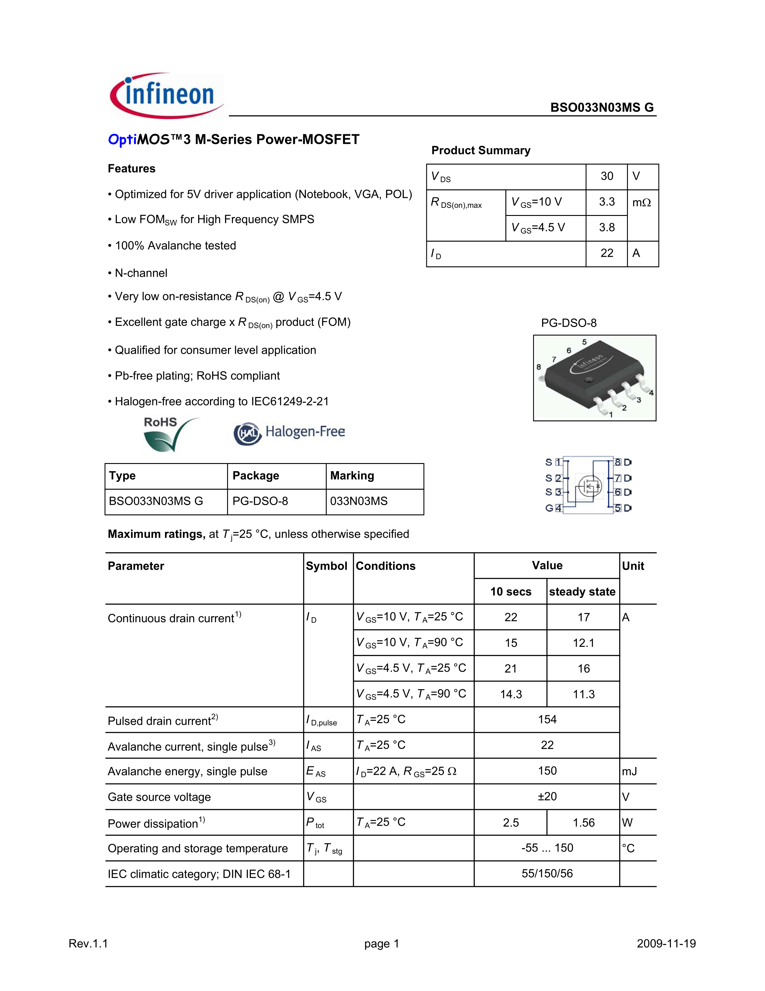 BSO033N03MS G数据手册PG-DSO-8封装Infineon(英飞凌)PDF规格书,中英文