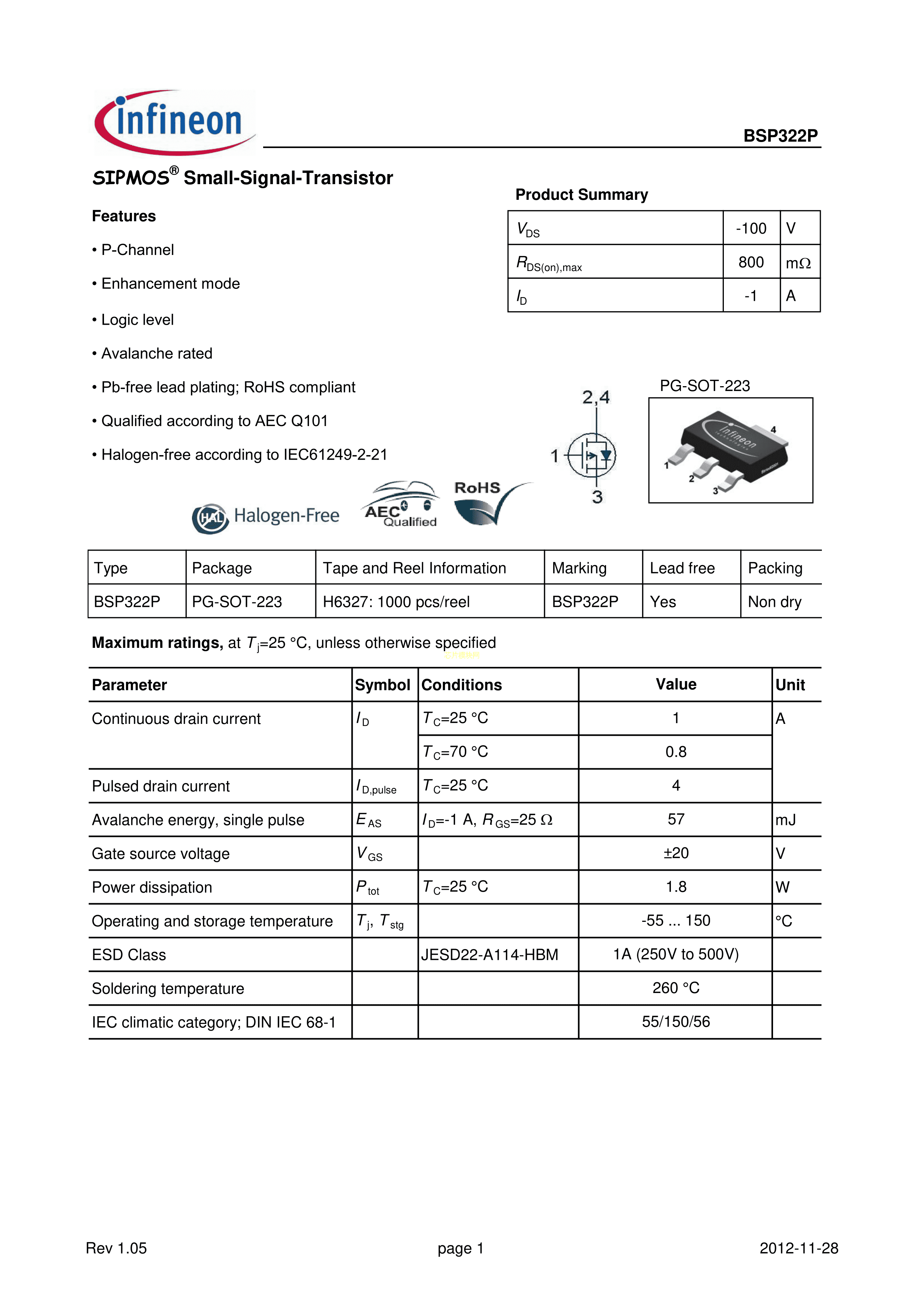 BSP322PH6327数据手册SOT-223封装Infineon(英飞凌)PDF规格书,中英文下载