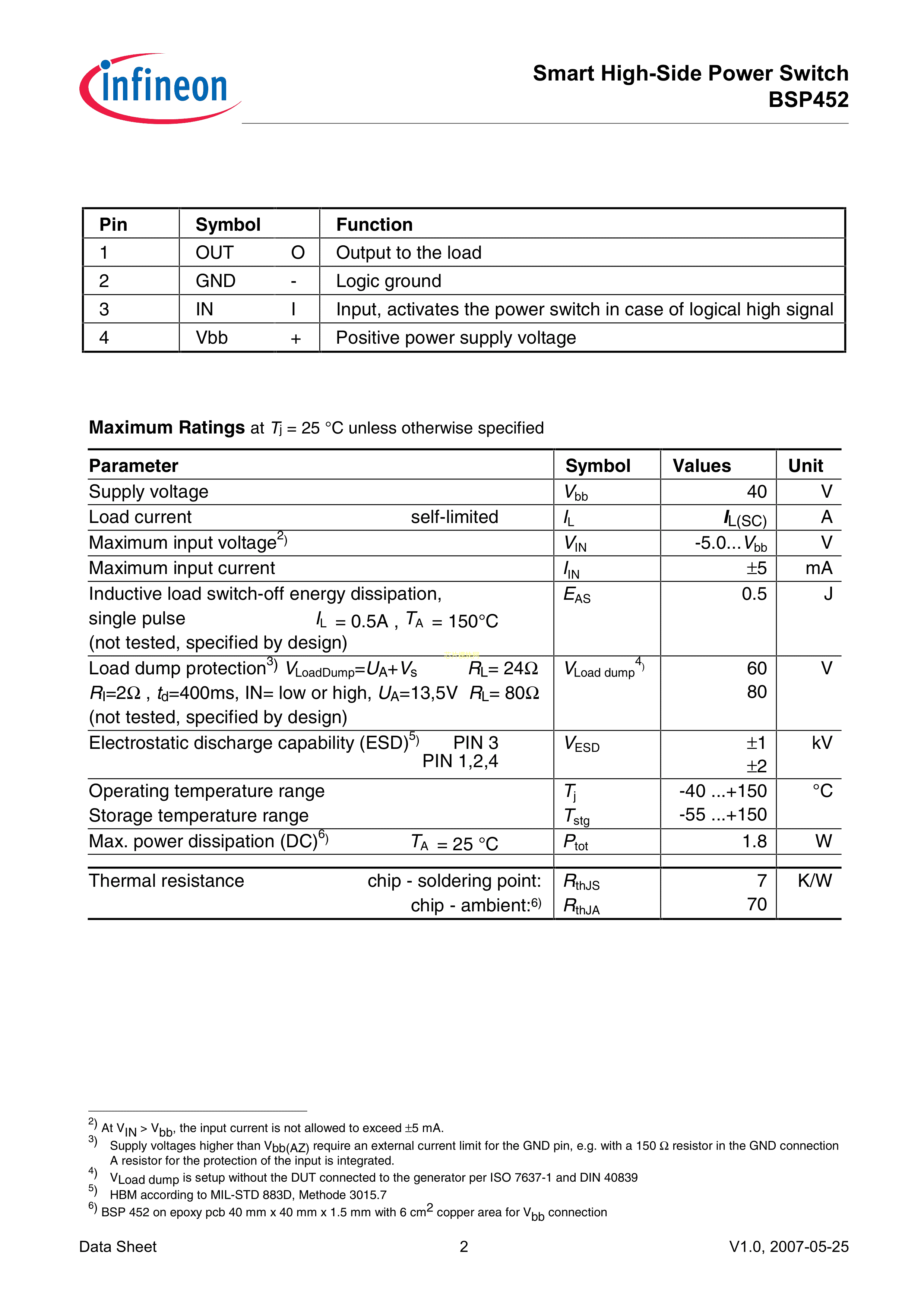 BSP452数据手册SOT-223封装Infineon(英飞凌)PDF规格书,中英文下载