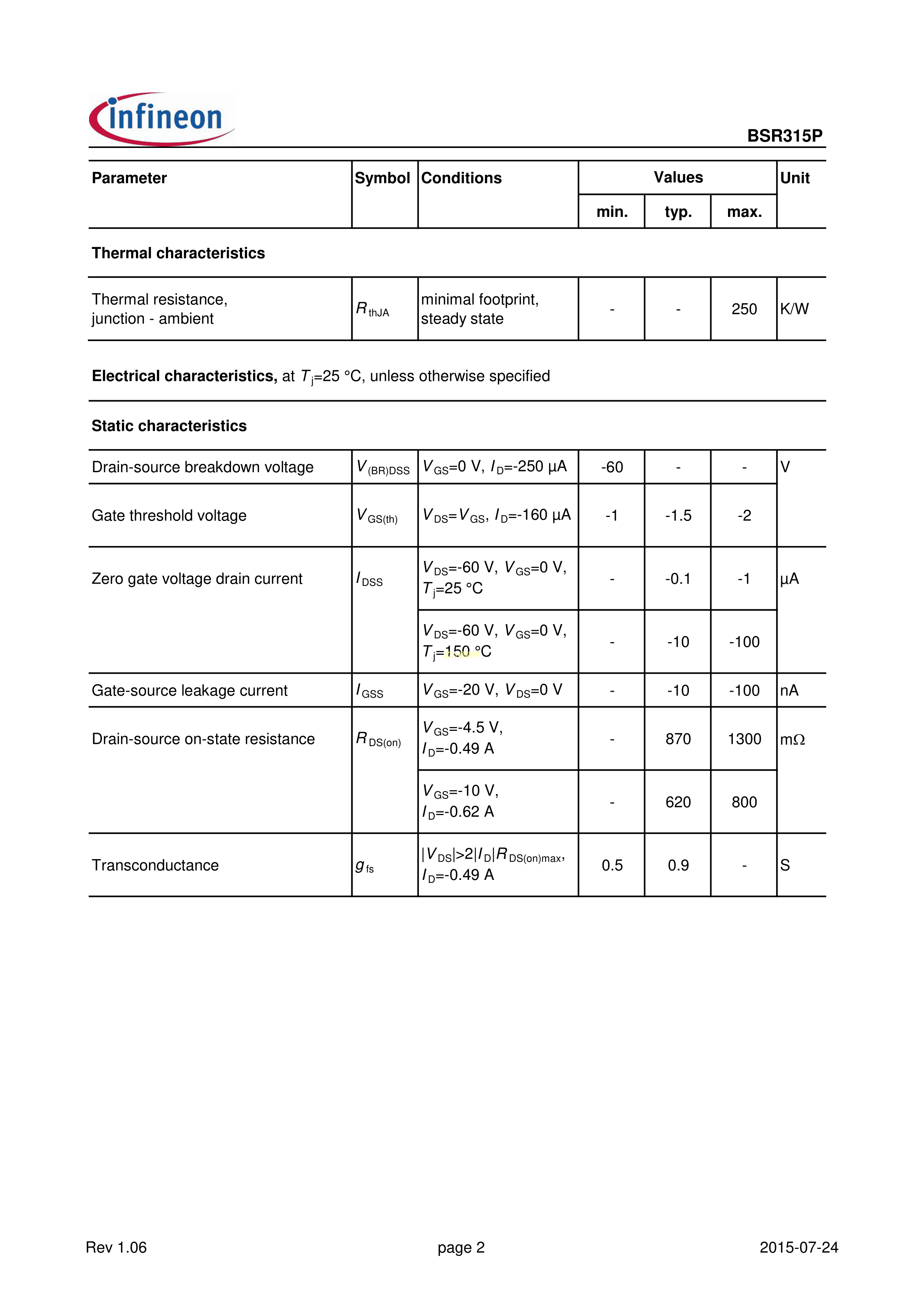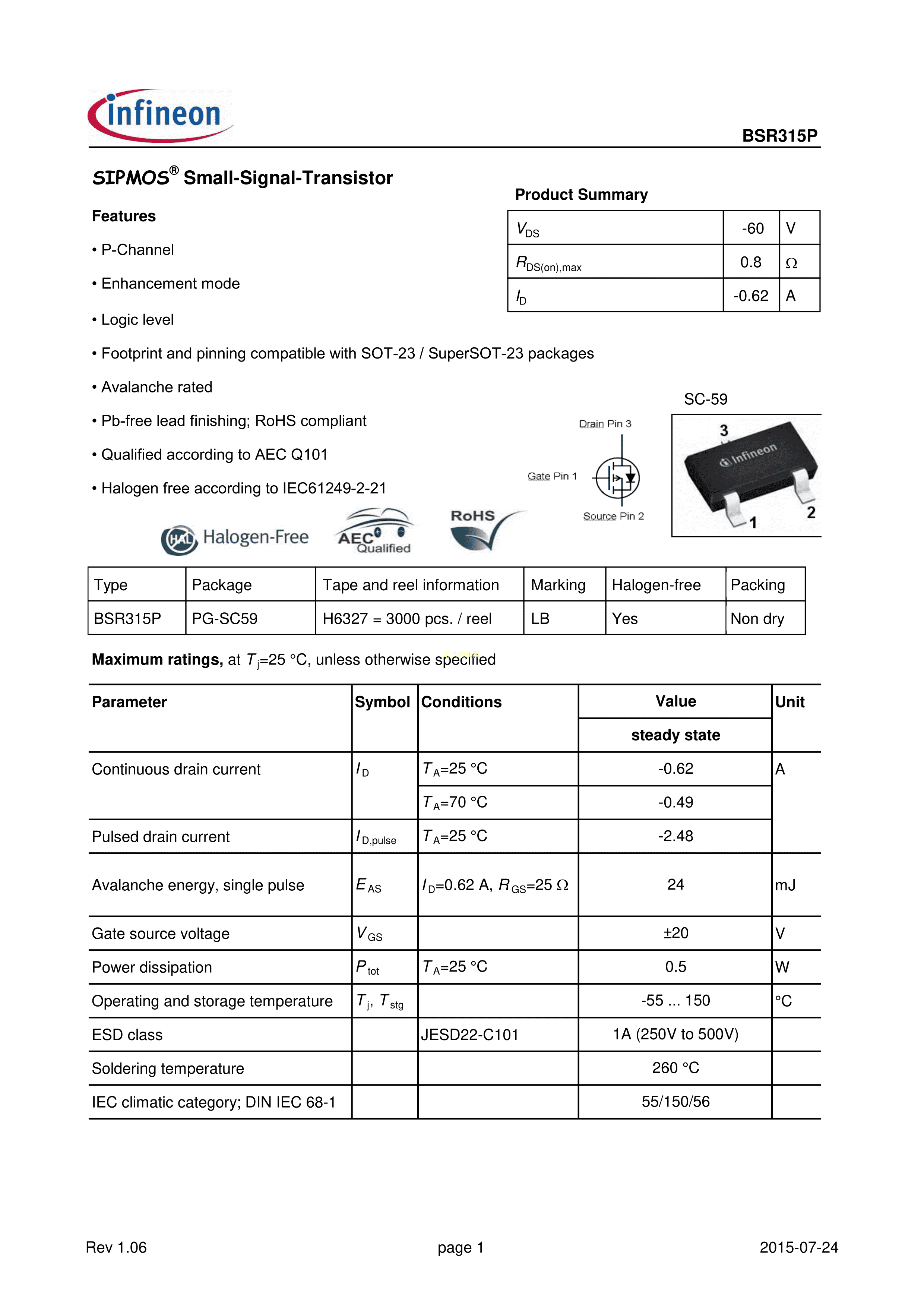BSR315PH6327数据手册PG-SC59-3封装Infineon(英飞凌)PDF规格书,中英文