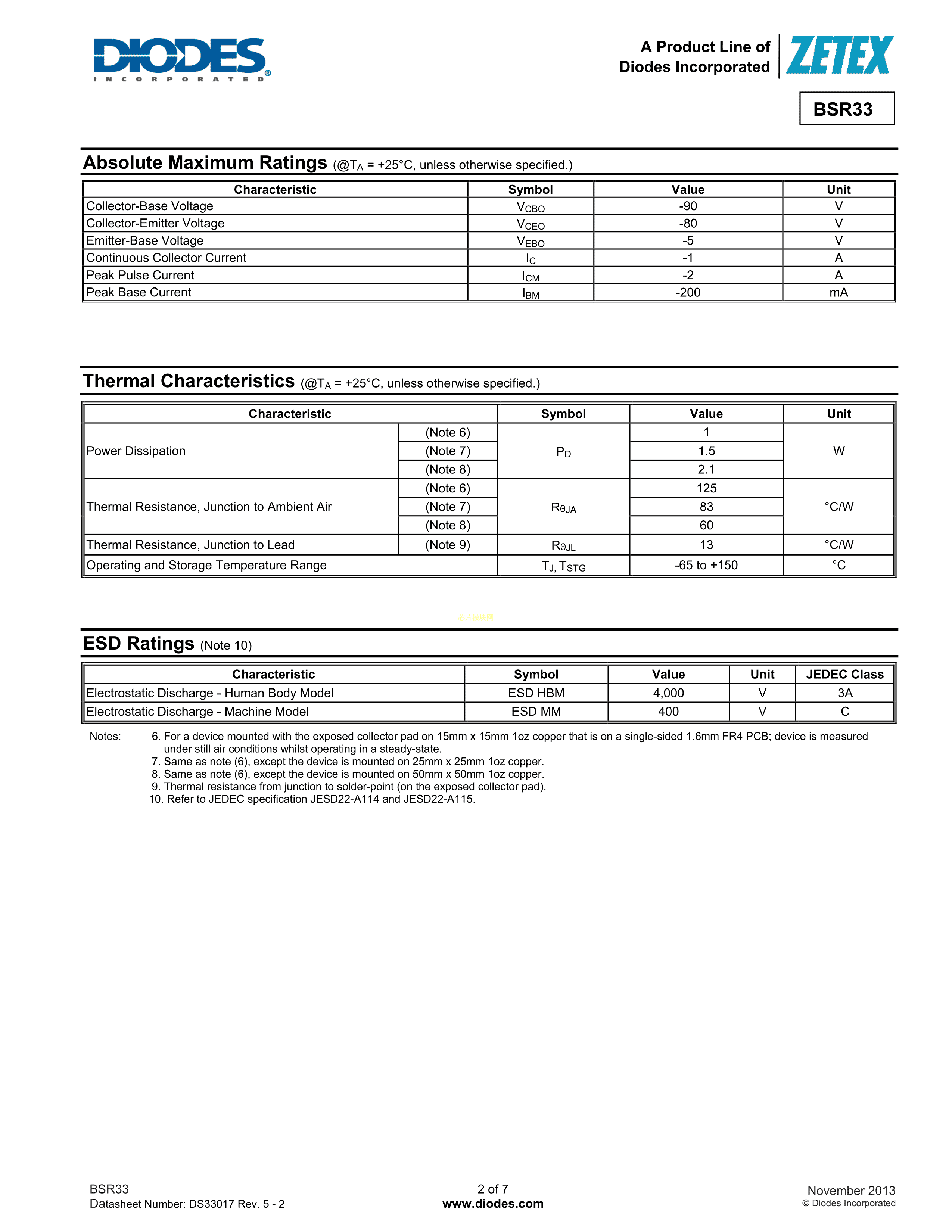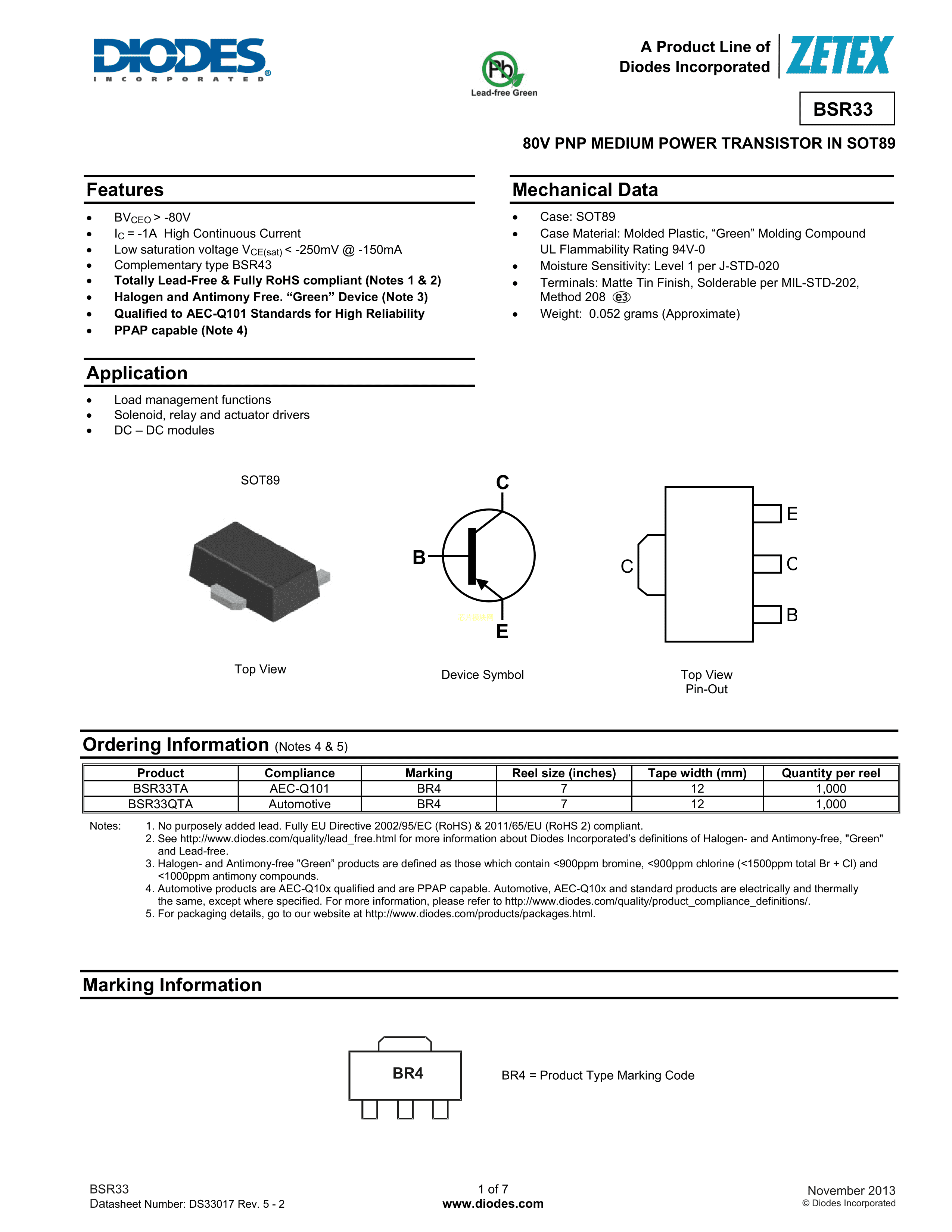 BSR33TA数据手册SOT-89(SOT-89-3)封装DIODES(美台)PDF规格书,中英文下