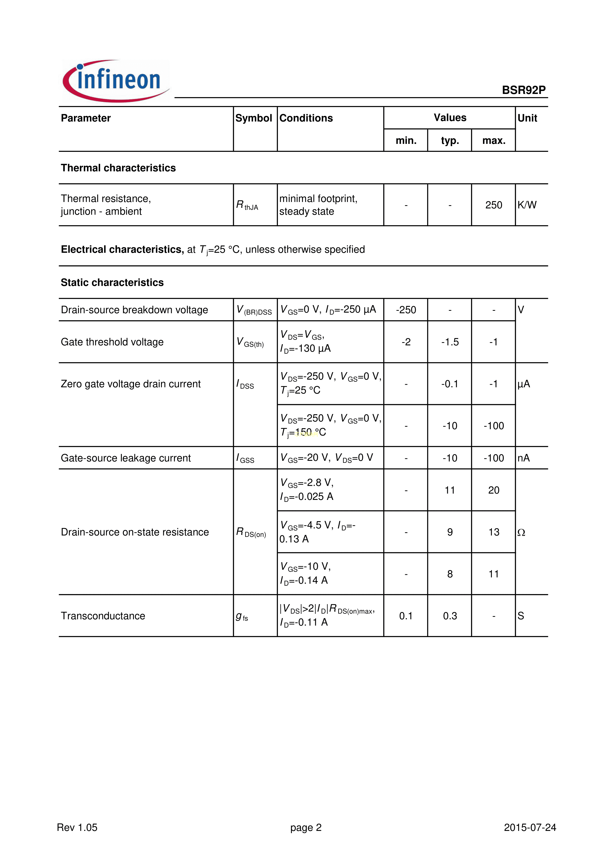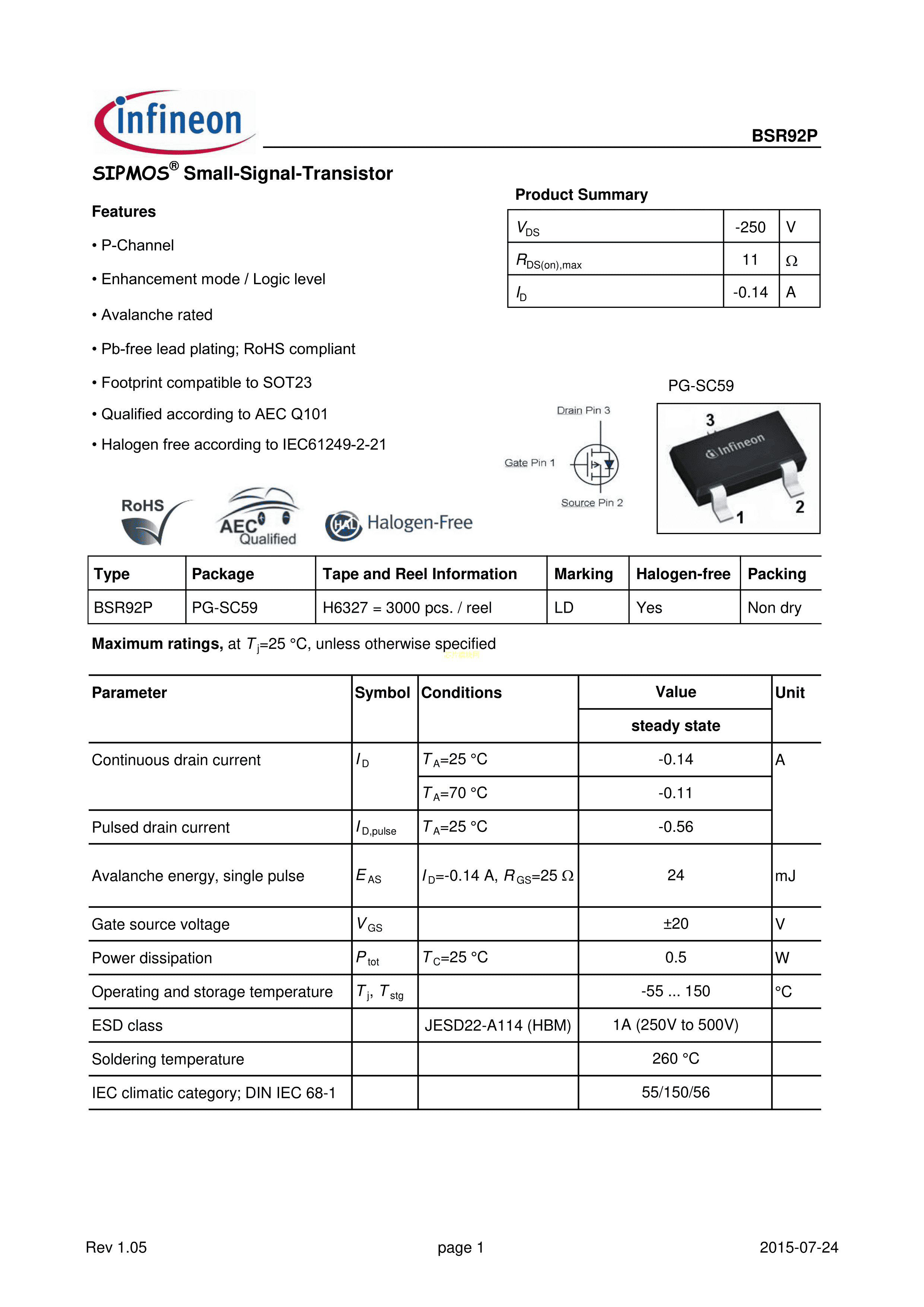 BSR92PH6327数据手册SOT-23(SOT-23-3)封装Infineon(英飞凌)PDF规