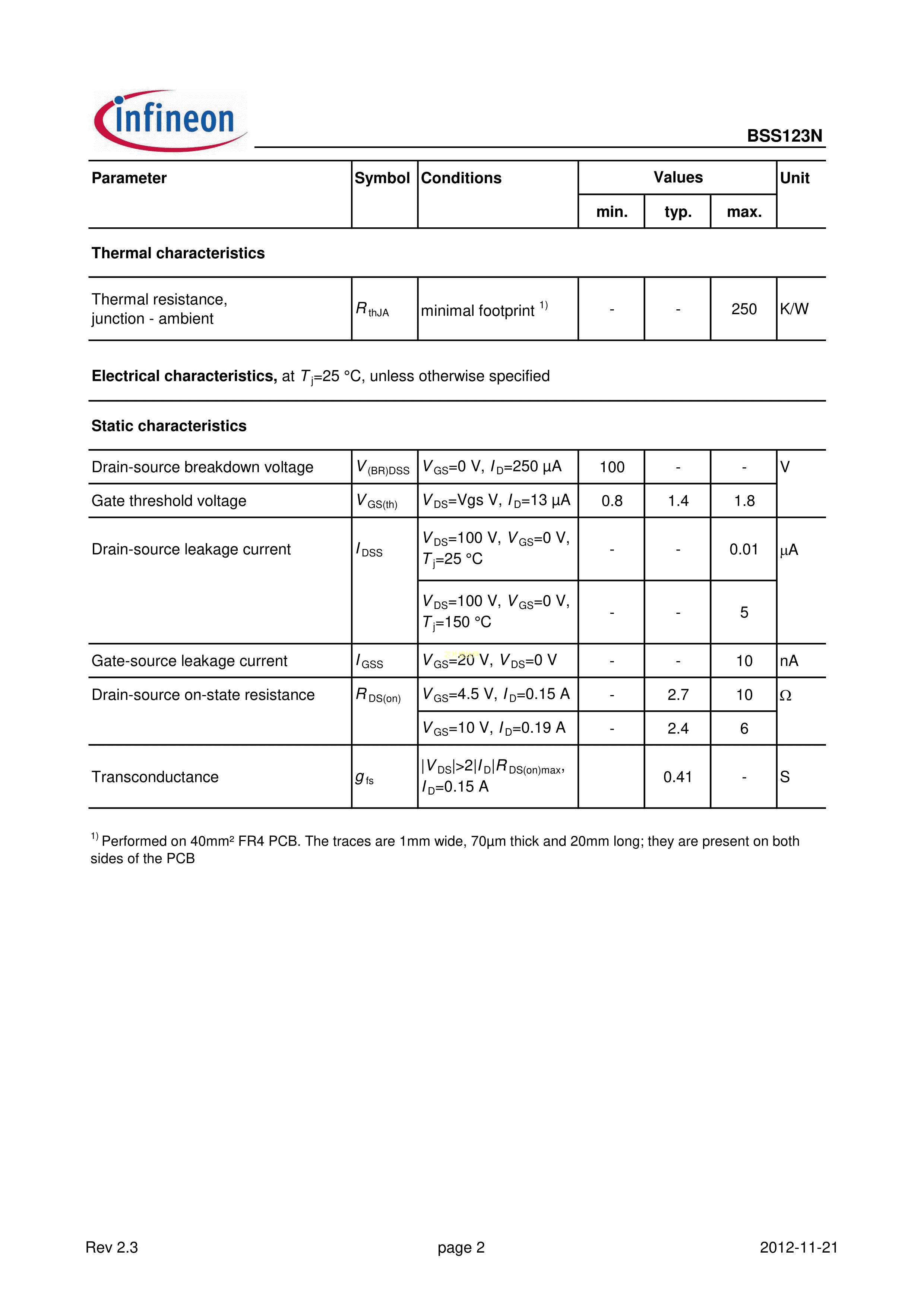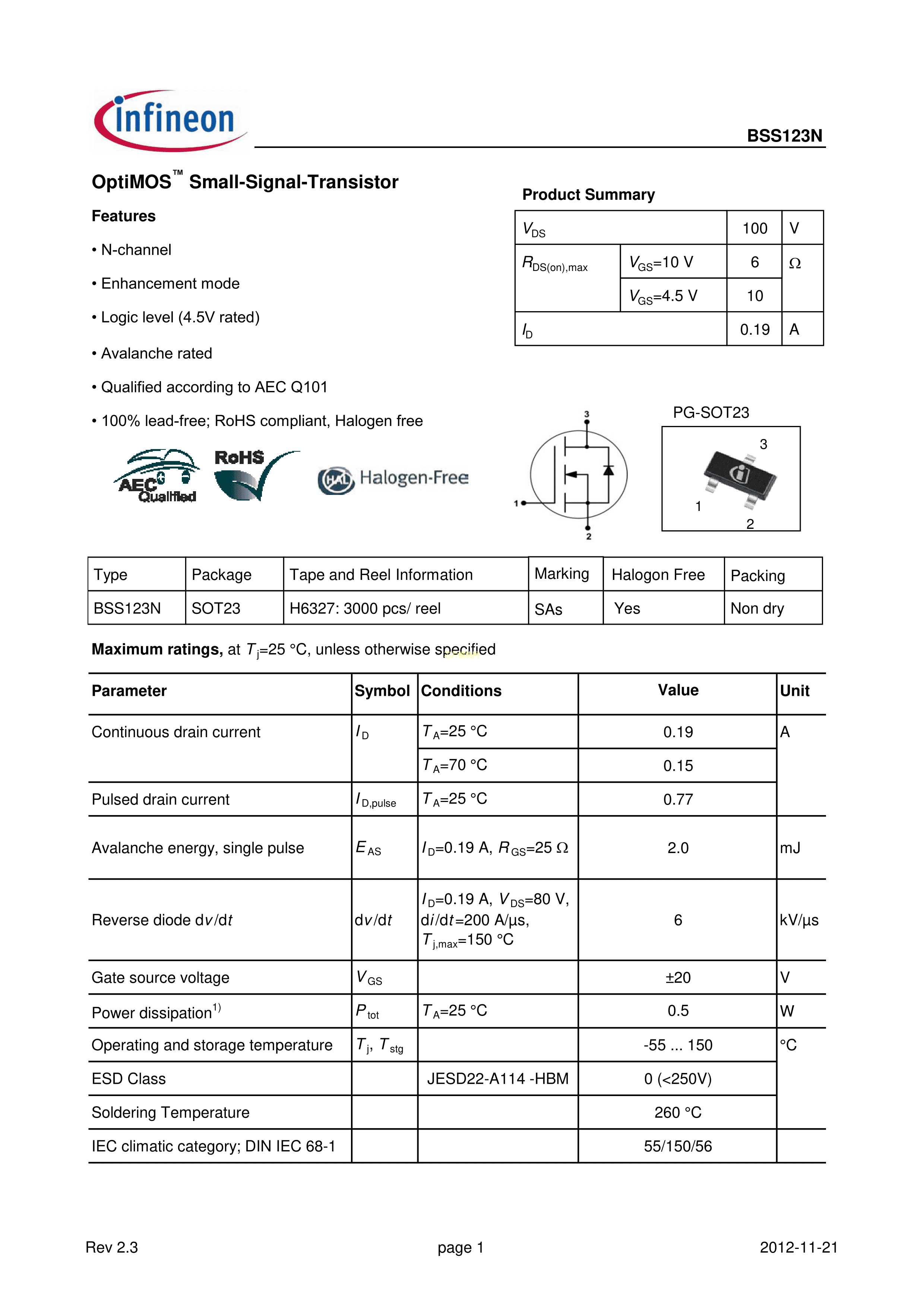 BSS123NH6327数据手册PG-SOT23-3封装Infineon(英飞凌)PDF规格书,中英