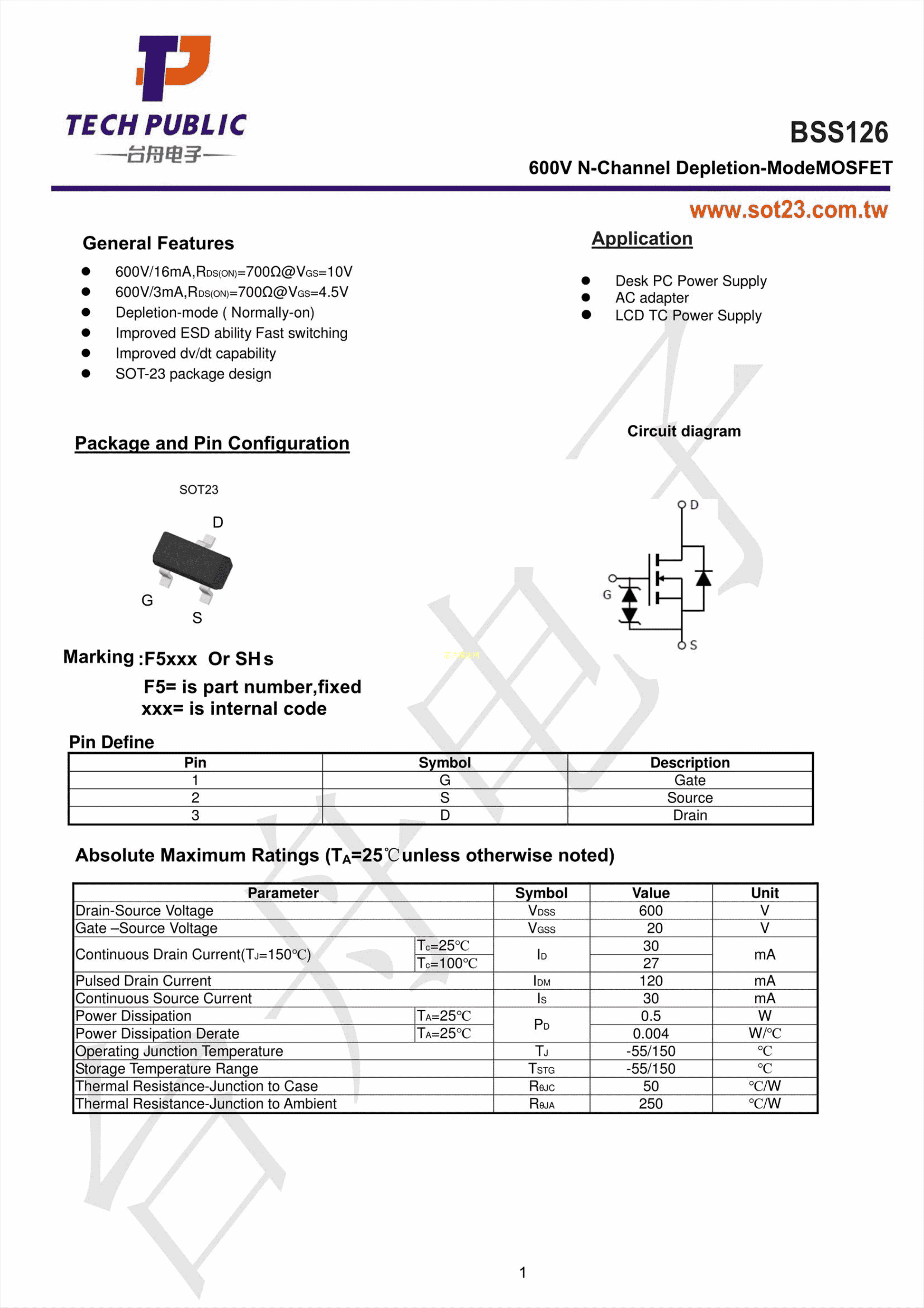 BSS126数据手册SOT-23封装TECHPUBLIC(台舟)PDF规格书,中英文下载