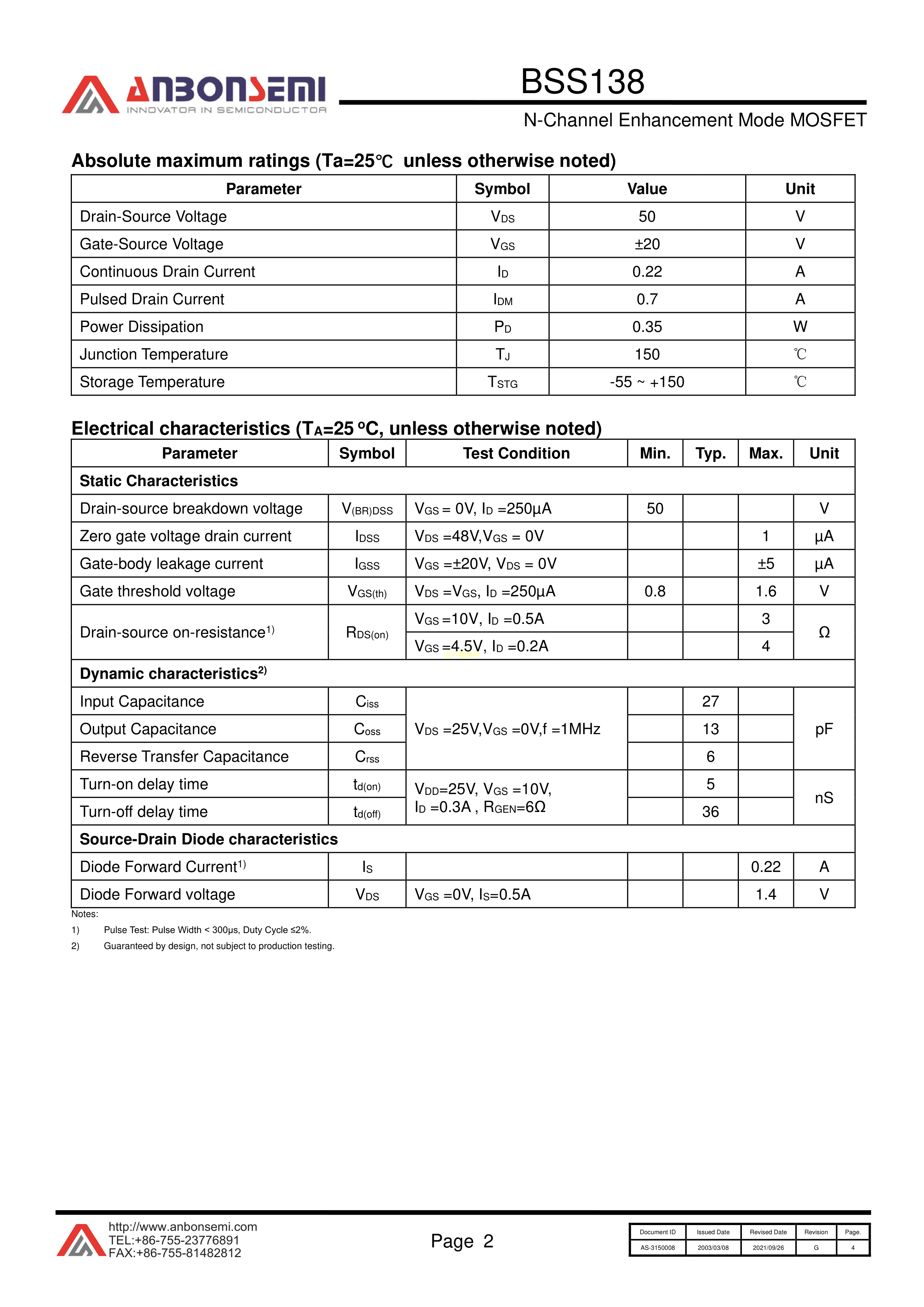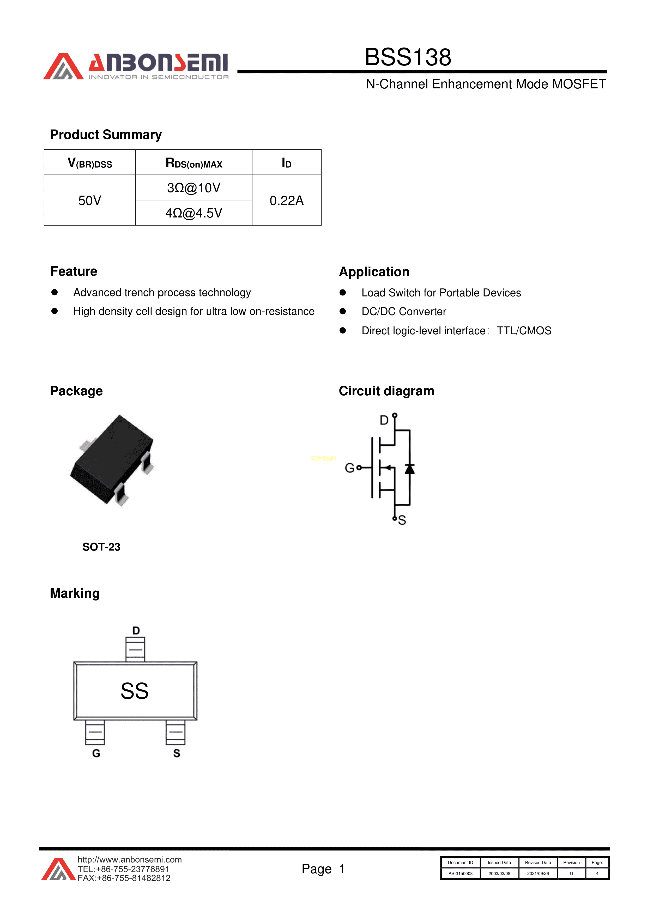 BSS138数据手册SOT-23(SOT-23-3)封装AnBon(台湾安邦)PDF规格书,中英文下