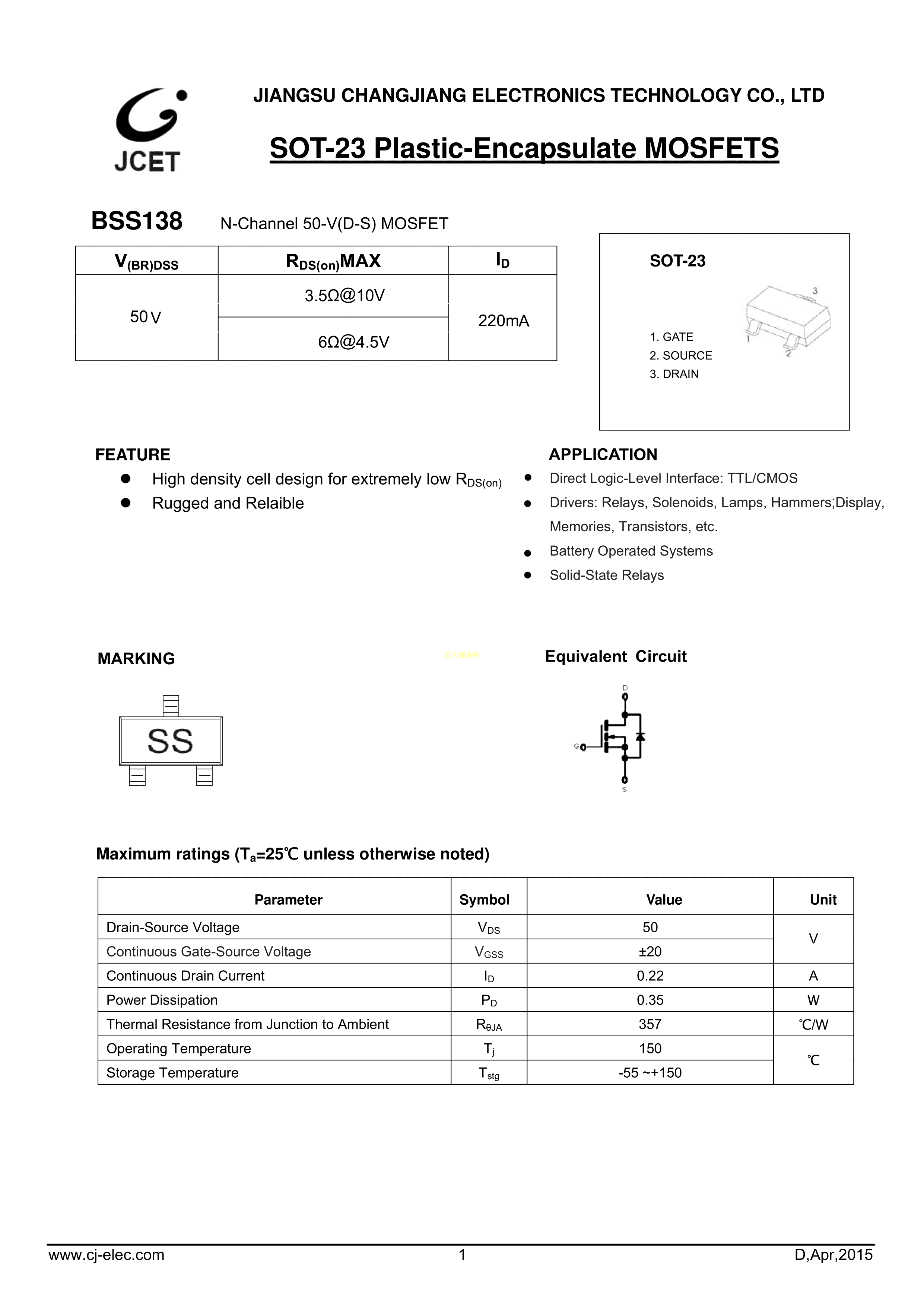 BSS138数据手册SOT-23(SOT-23-3)封装CJ(江苏长电-长晶)PDF规格书,中英文下