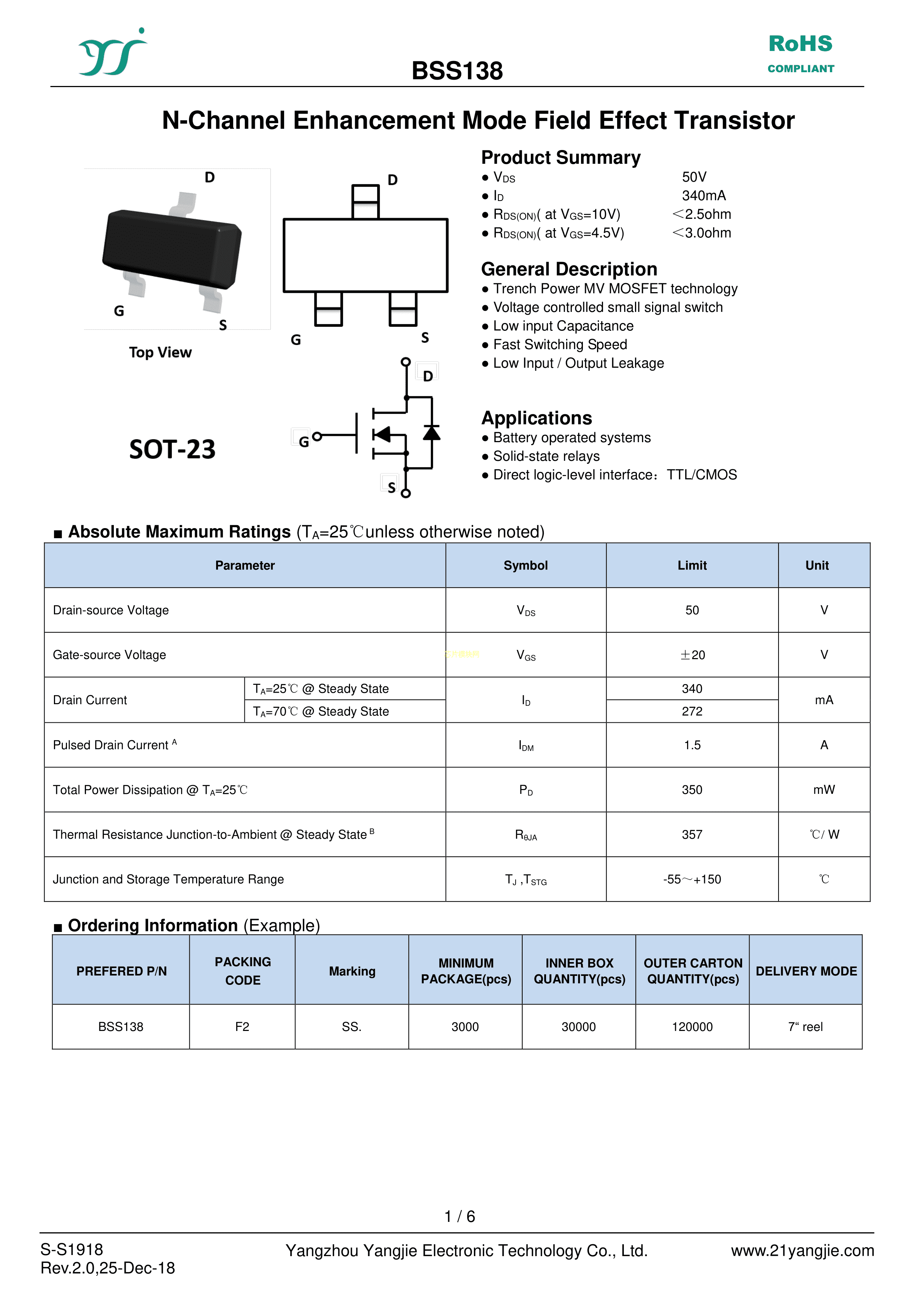 BSS138数据手册SOT-23封装YANGJIE(扬杰)PDF规格书,中英文下载