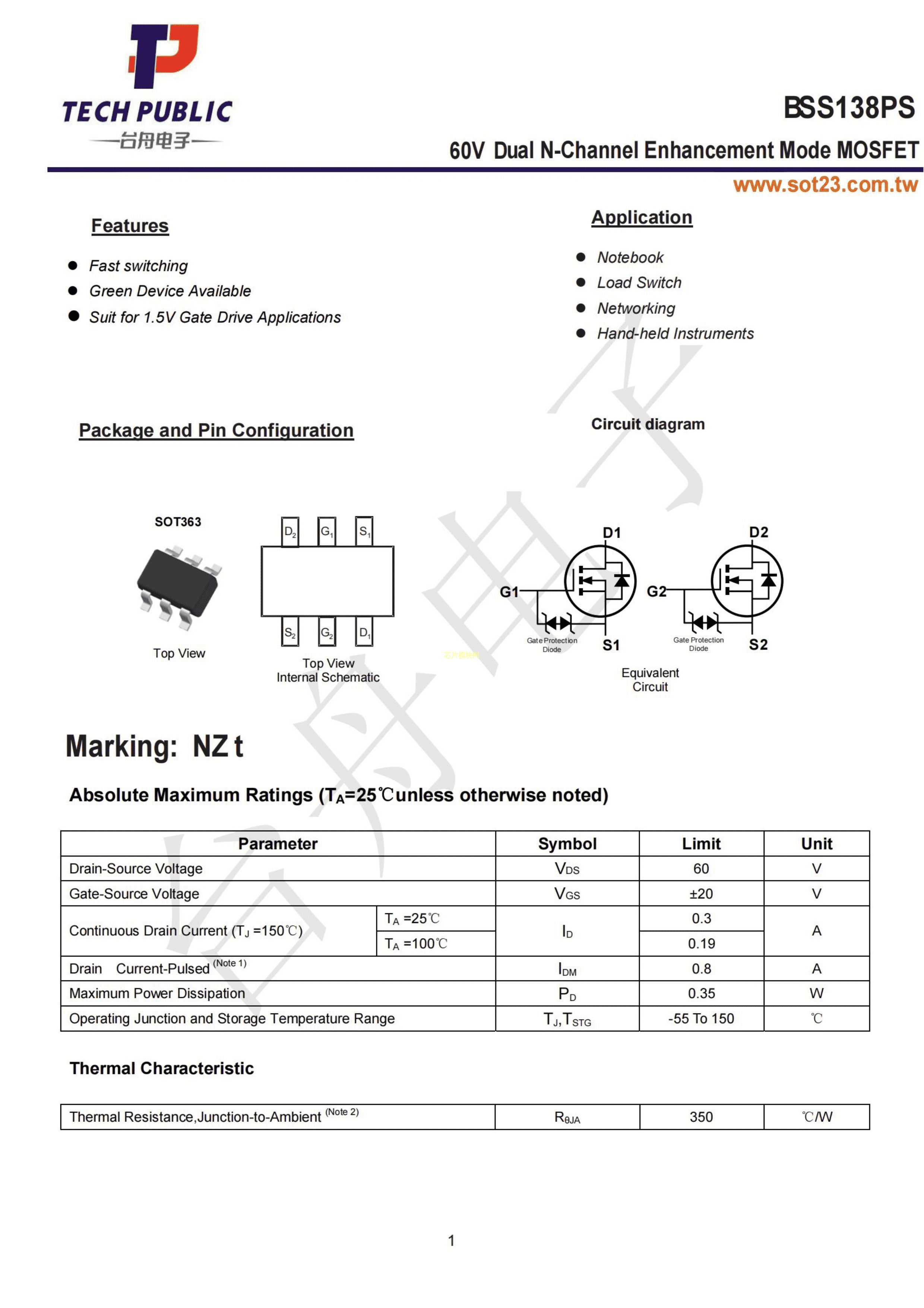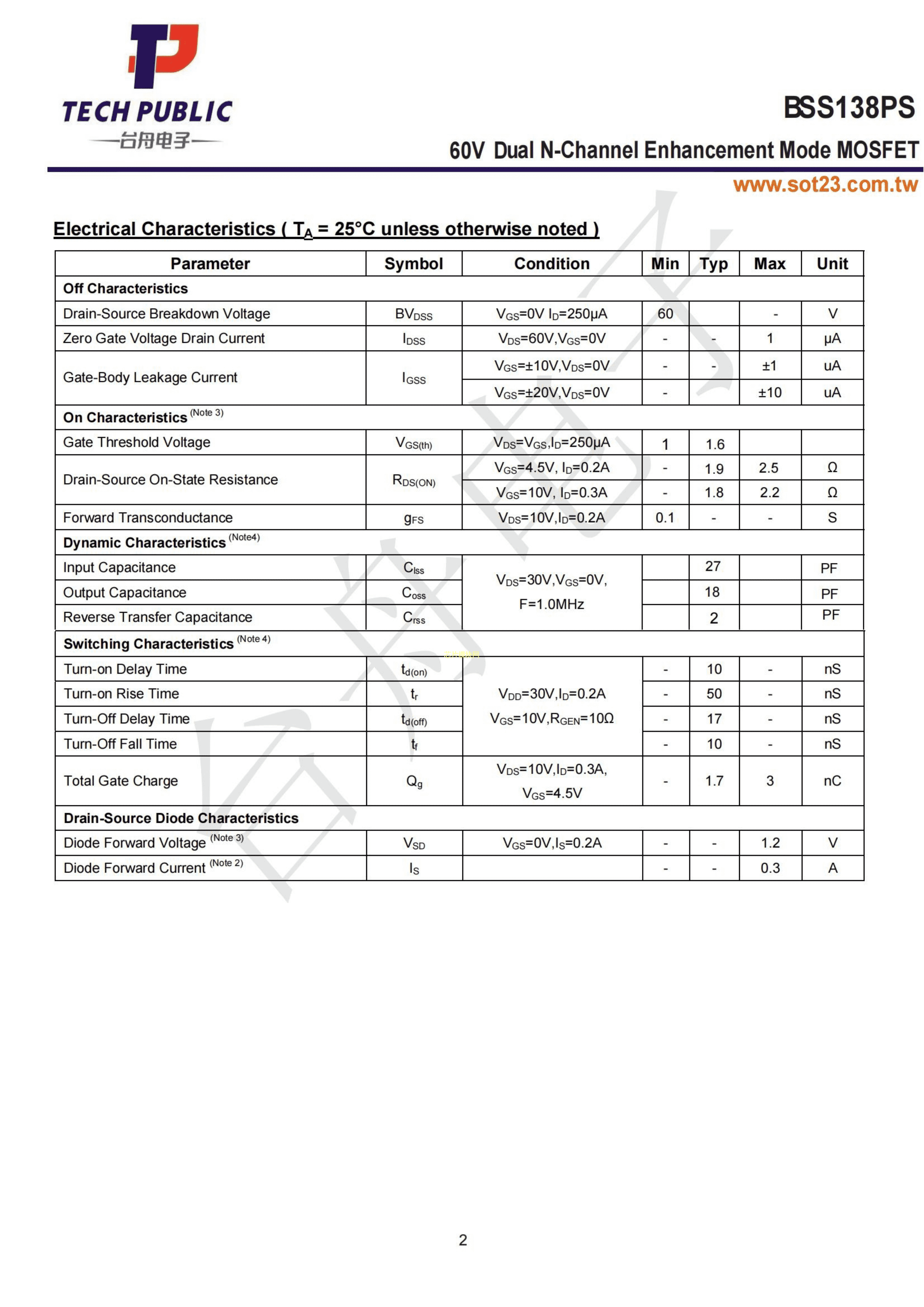 BSS138PS数据手册SOT-363封装TECHPUBLIC(台舟)PDF规格书,中英文下载