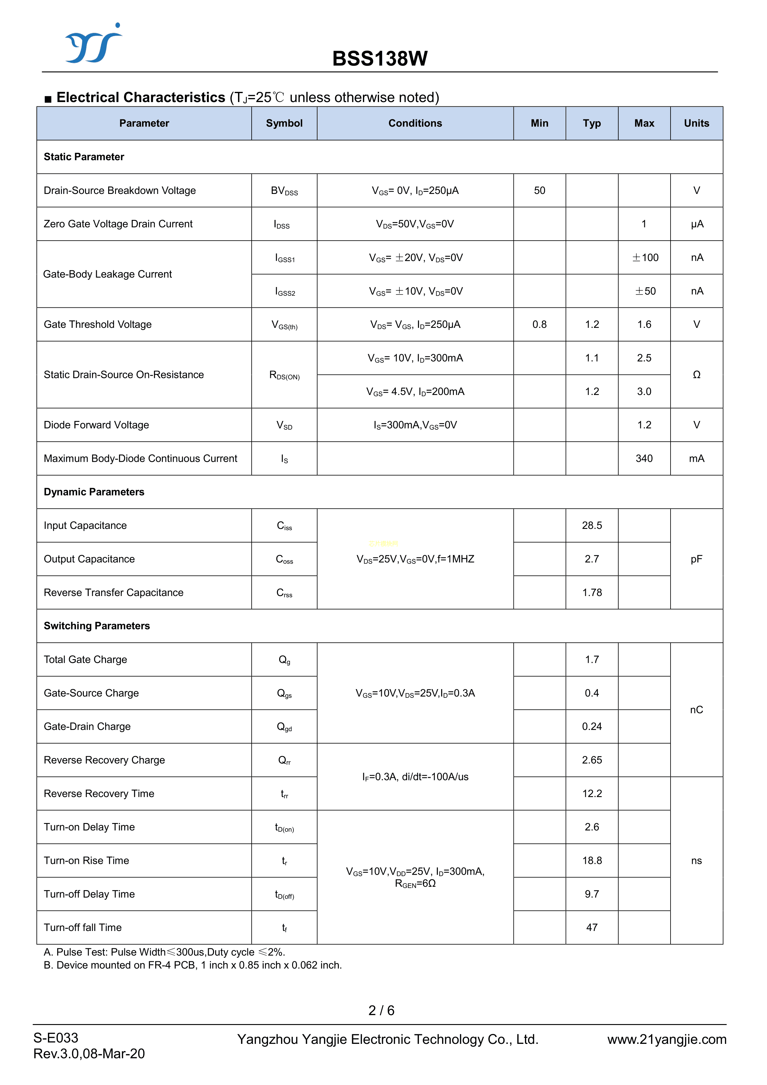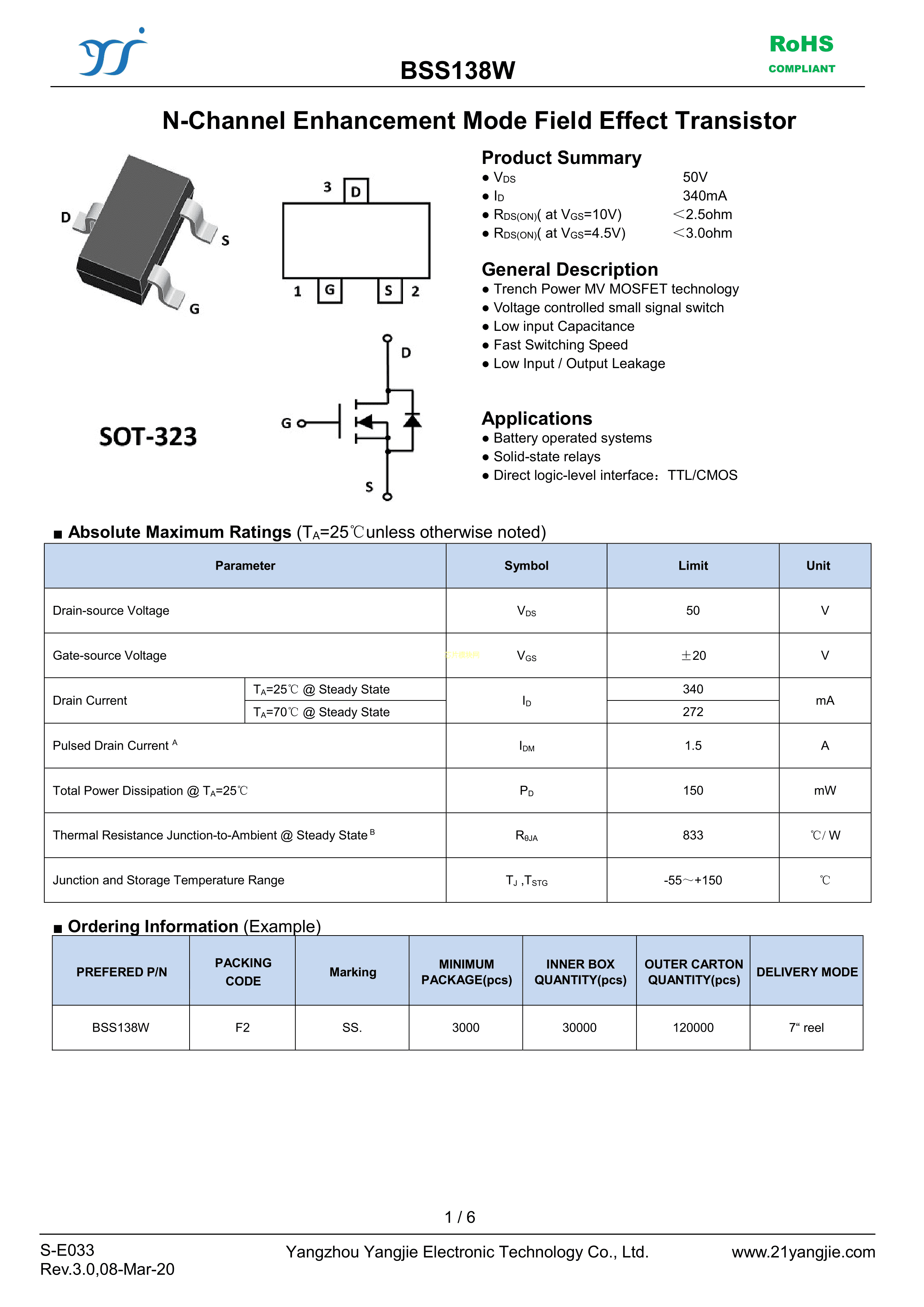 BSS138W数据手册SOT-323封装YANGJIE(扬杰)PDF规格书,中英文下载