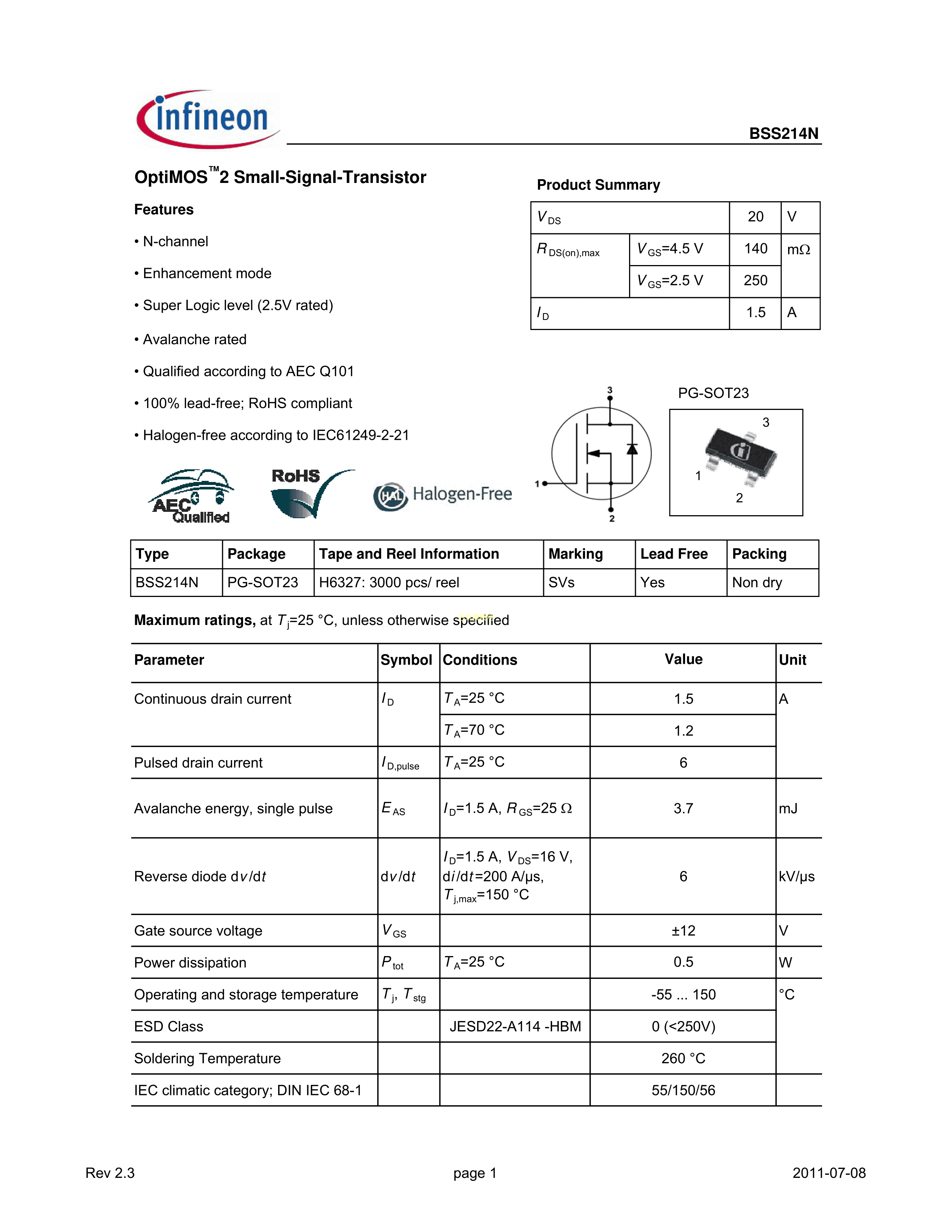 BSS214NH6327数据手册SOT-23(SOT-23-3)封装Infineon(英飞凌)PDF
