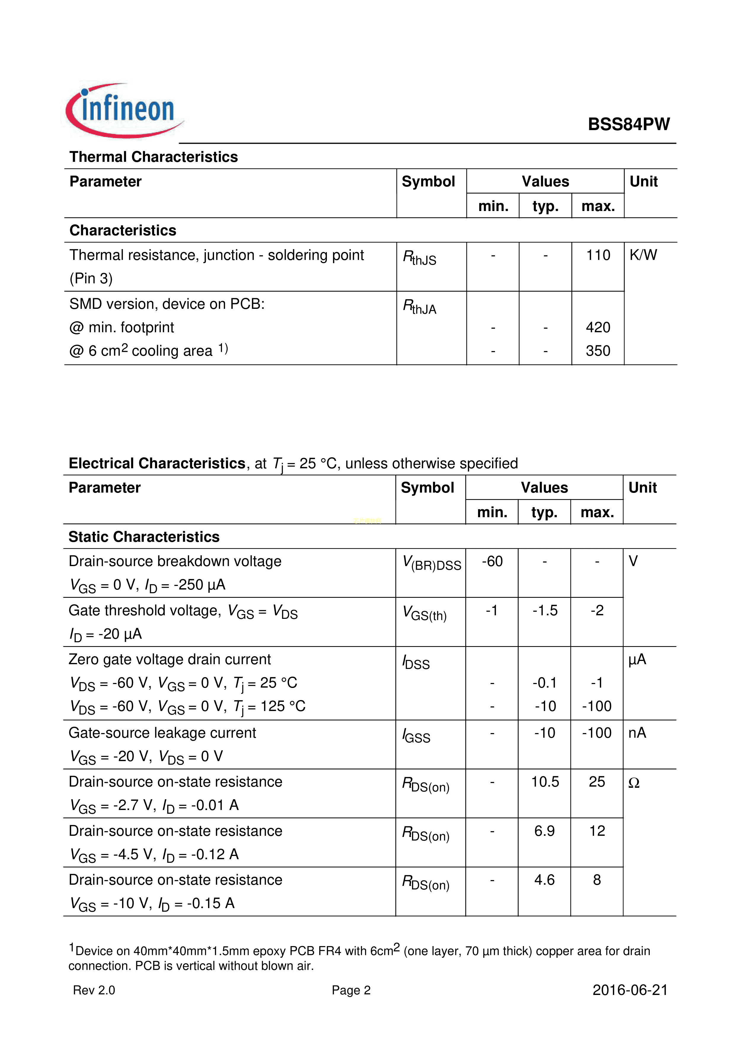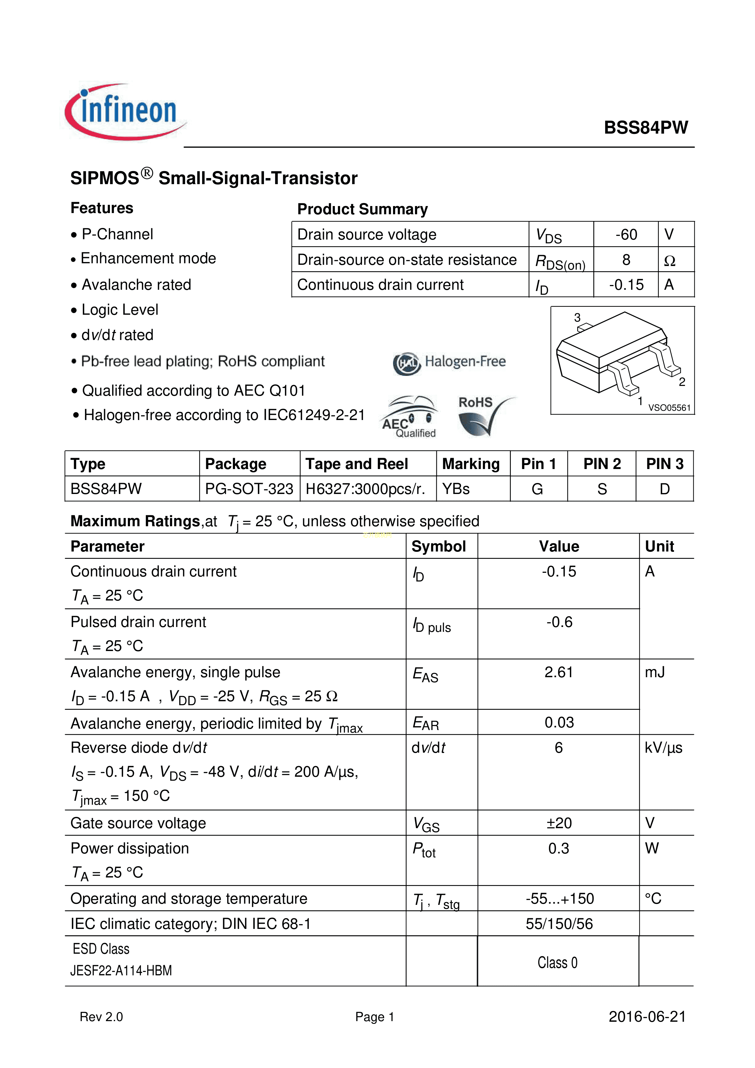 BSS84PWH6327数据手册SOT-323(SC-70)封装Infineon(英飞凌)PDF规格