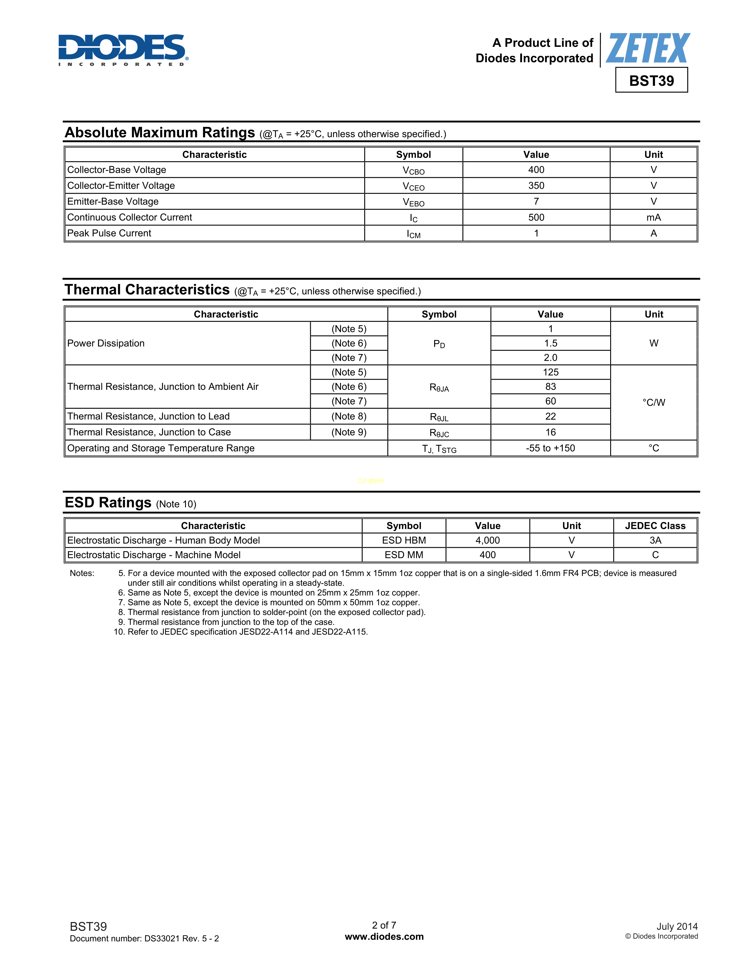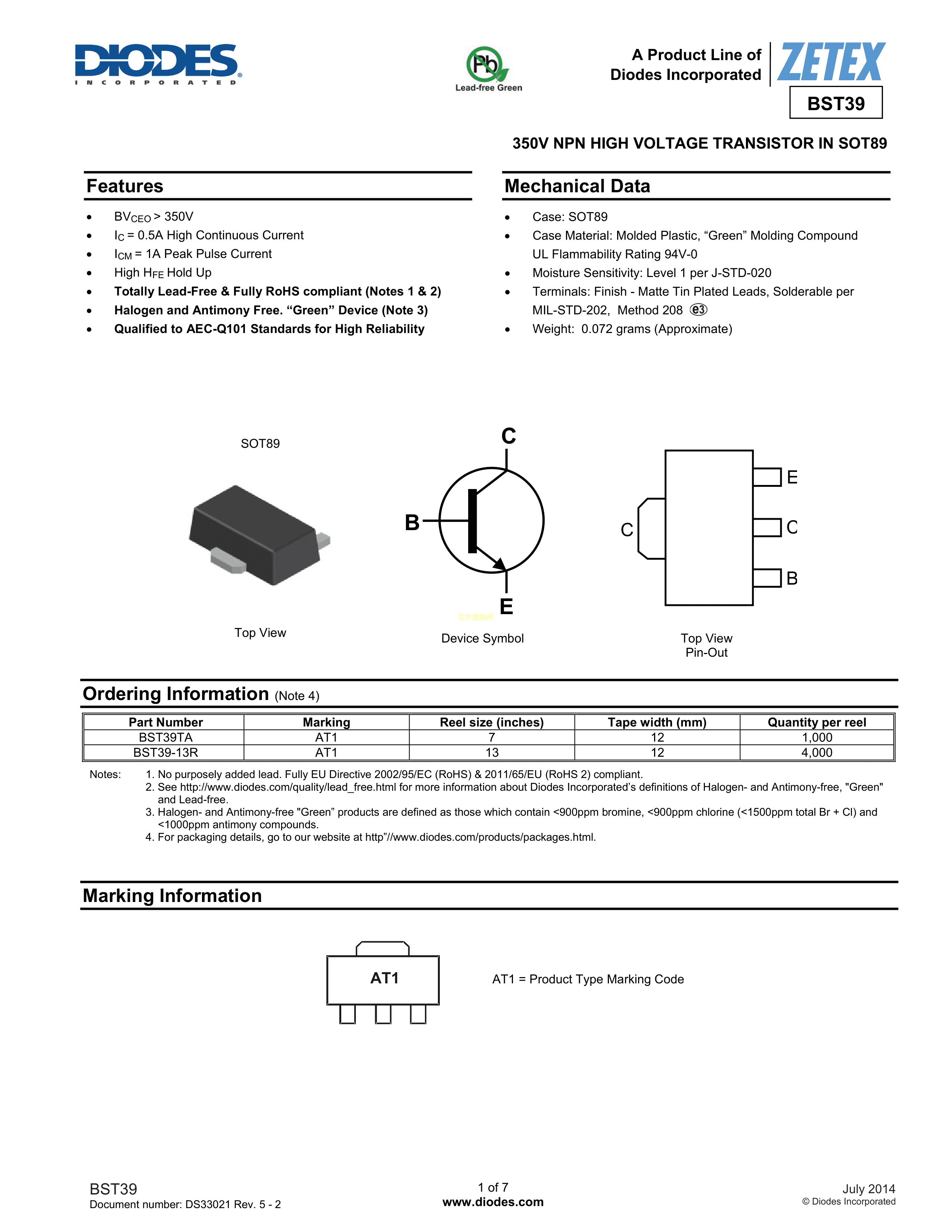 BST39TA数据手册SOT-89(SOT-89-3)封装DIODES(美台)PDF规格书,中英文下