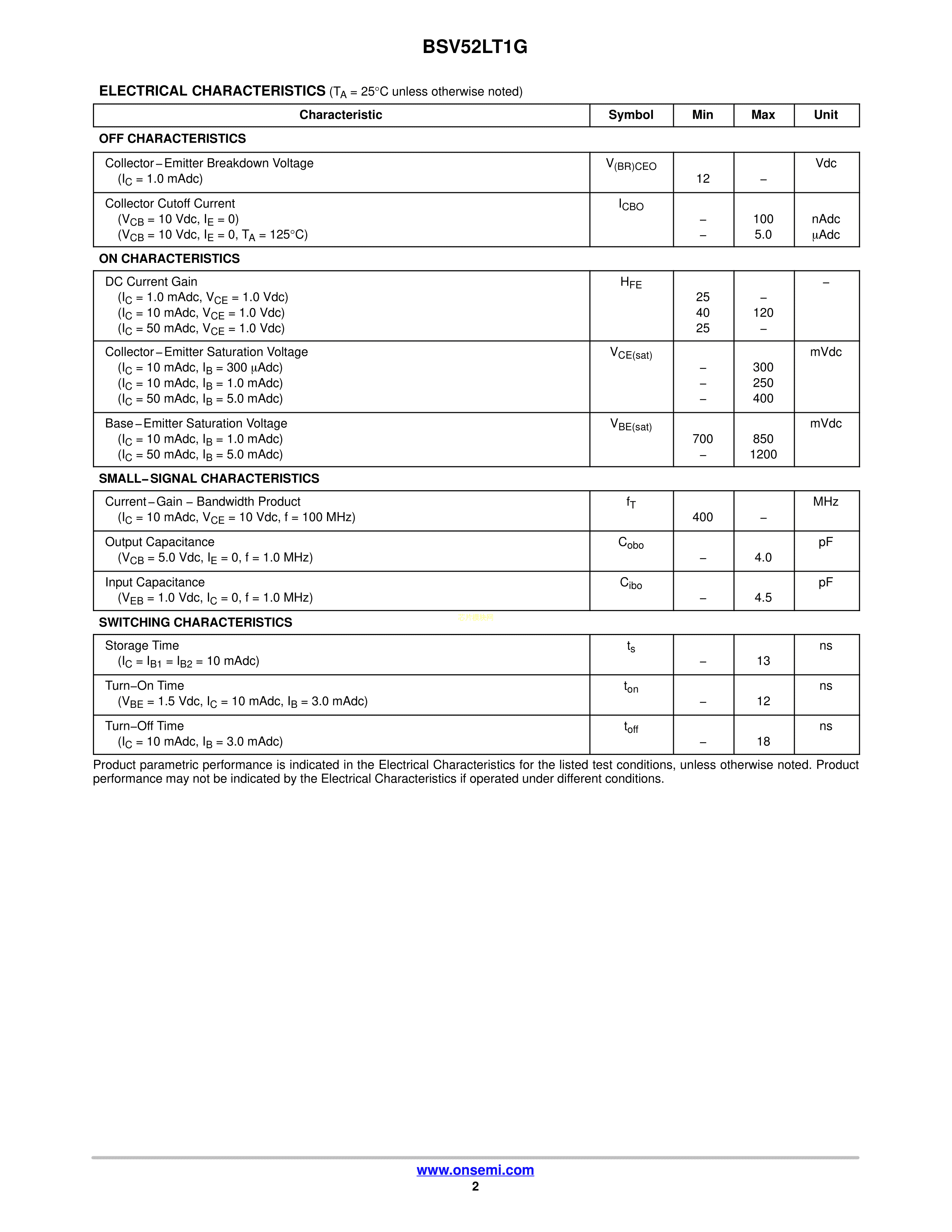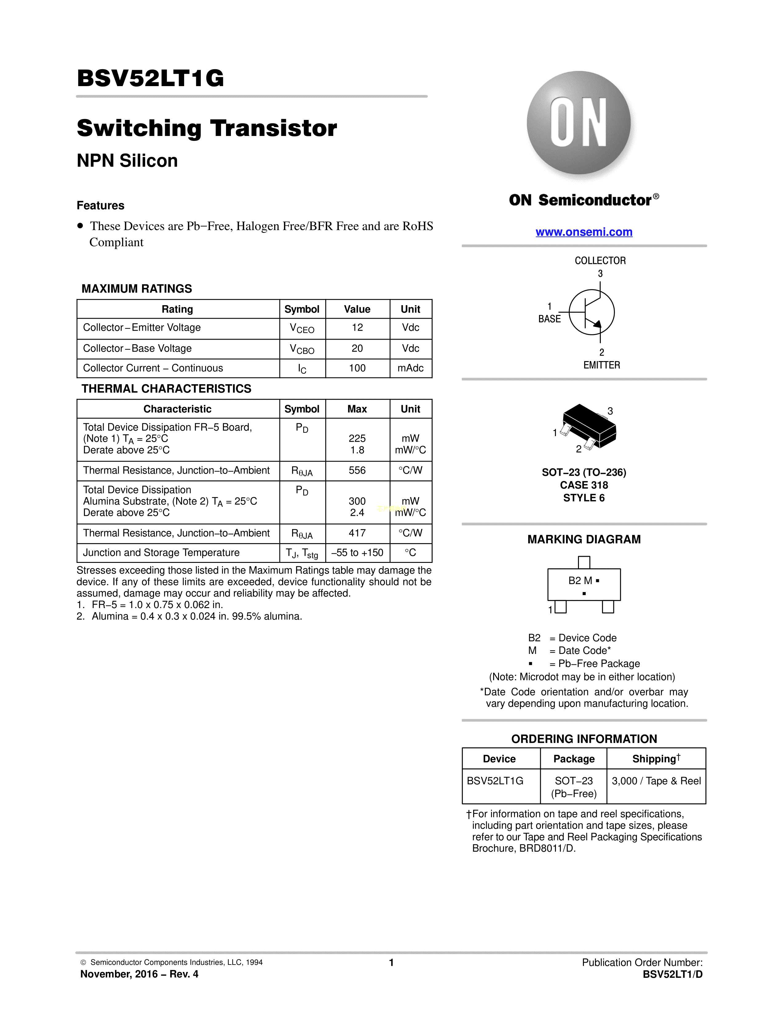 BSV52LT1G数据手册SOT-23(SOT-23-3)封装onsemi(安森美)PDF规格书,中