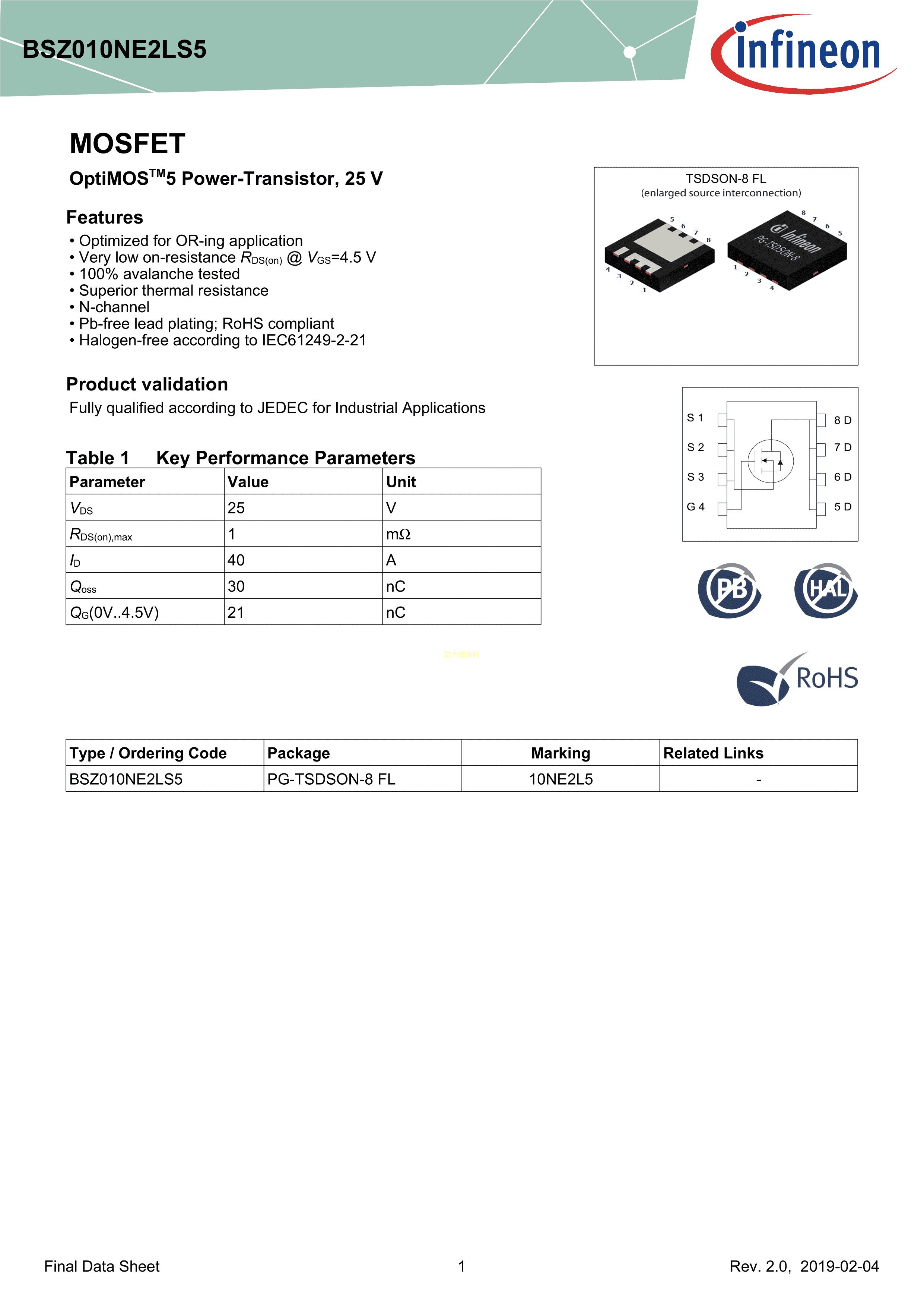 BSZ010NE2LS5数据手册PG-TSDSON-8封装Infineon(英飞凌)PDF规格书,中