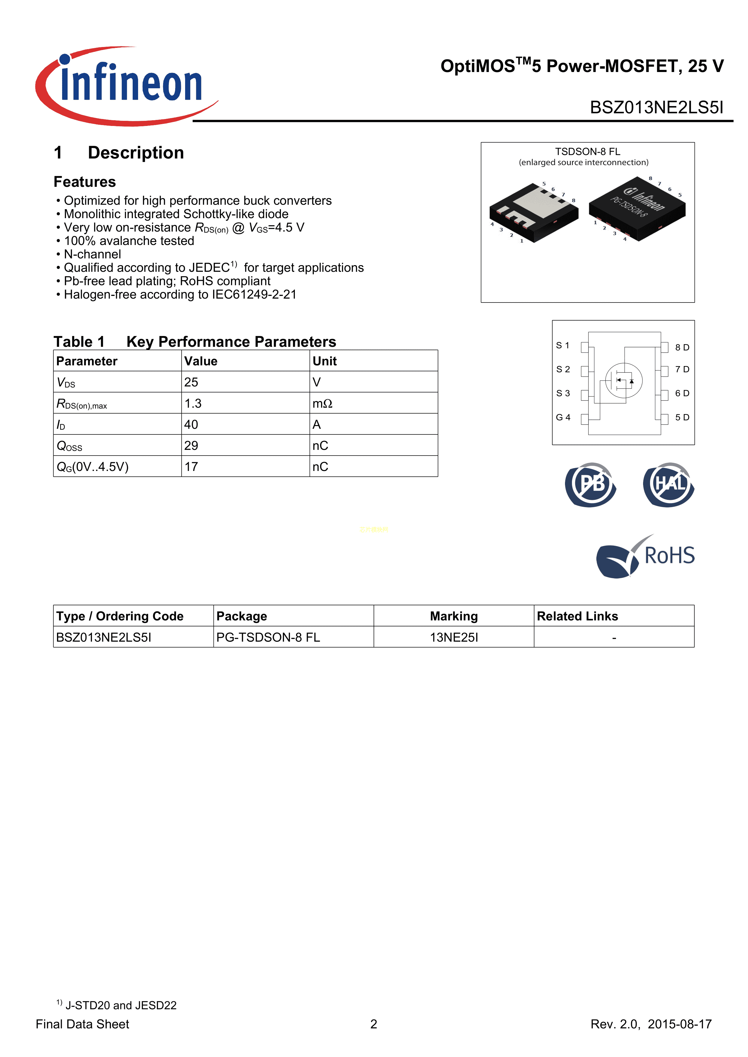BSZ013NE2LS5I数据手册PG-TSDSON-8封装Infineon(英飞凌)PDF规格书,
