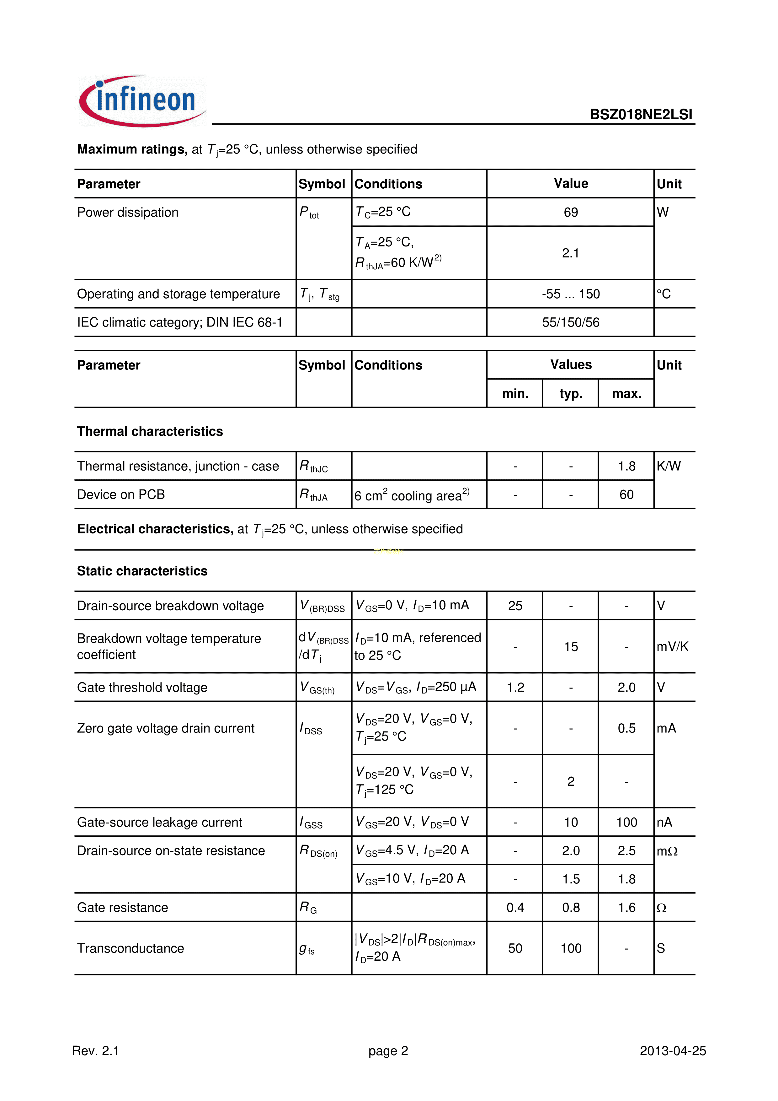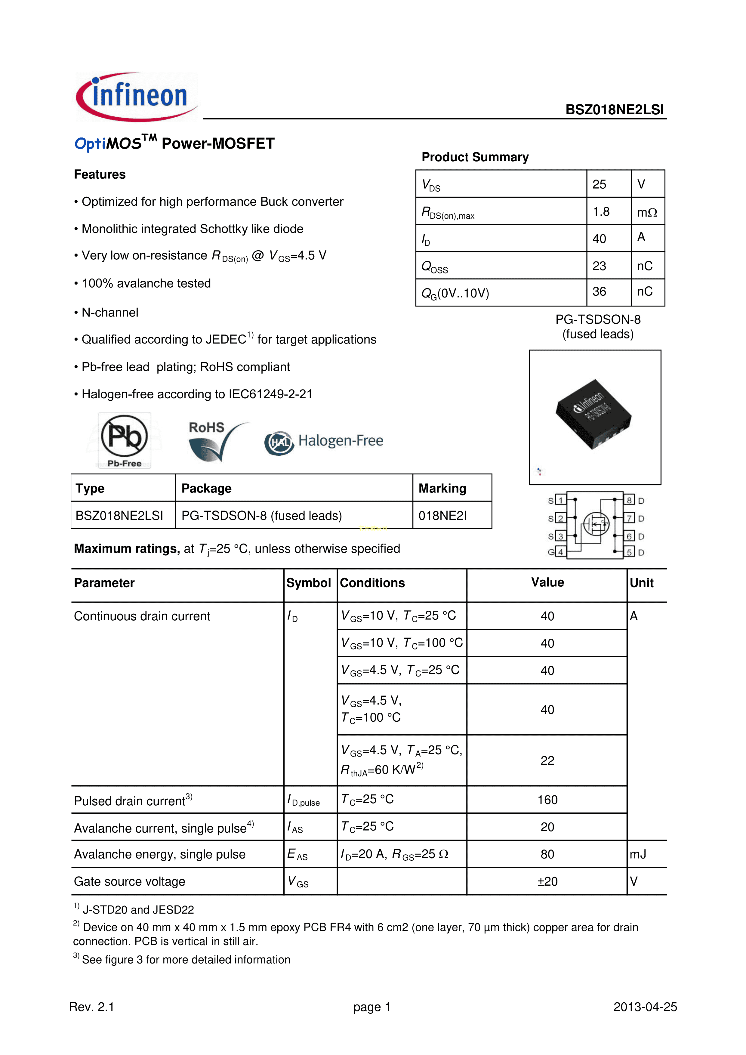 BSZ018NE2LSI数据手册PG-TSDSON-8封装Infineon(英飞凌)PDF规格书,中