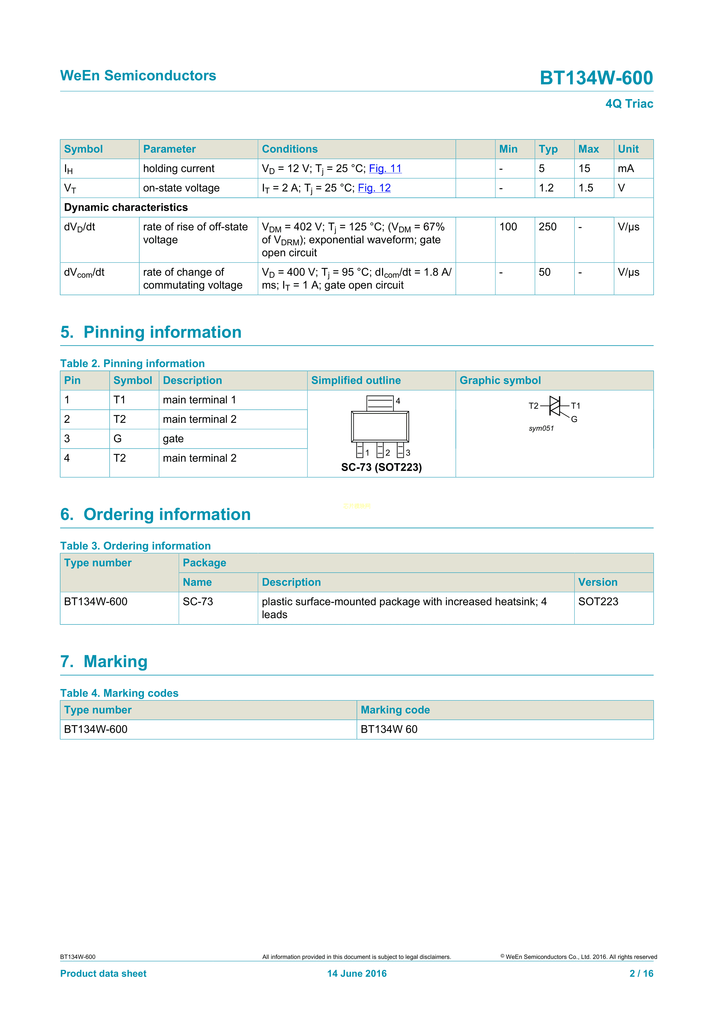 BT134W-800115数据手册SOT-223封装WeEn(瑞能)PDF规格书,中英文下载